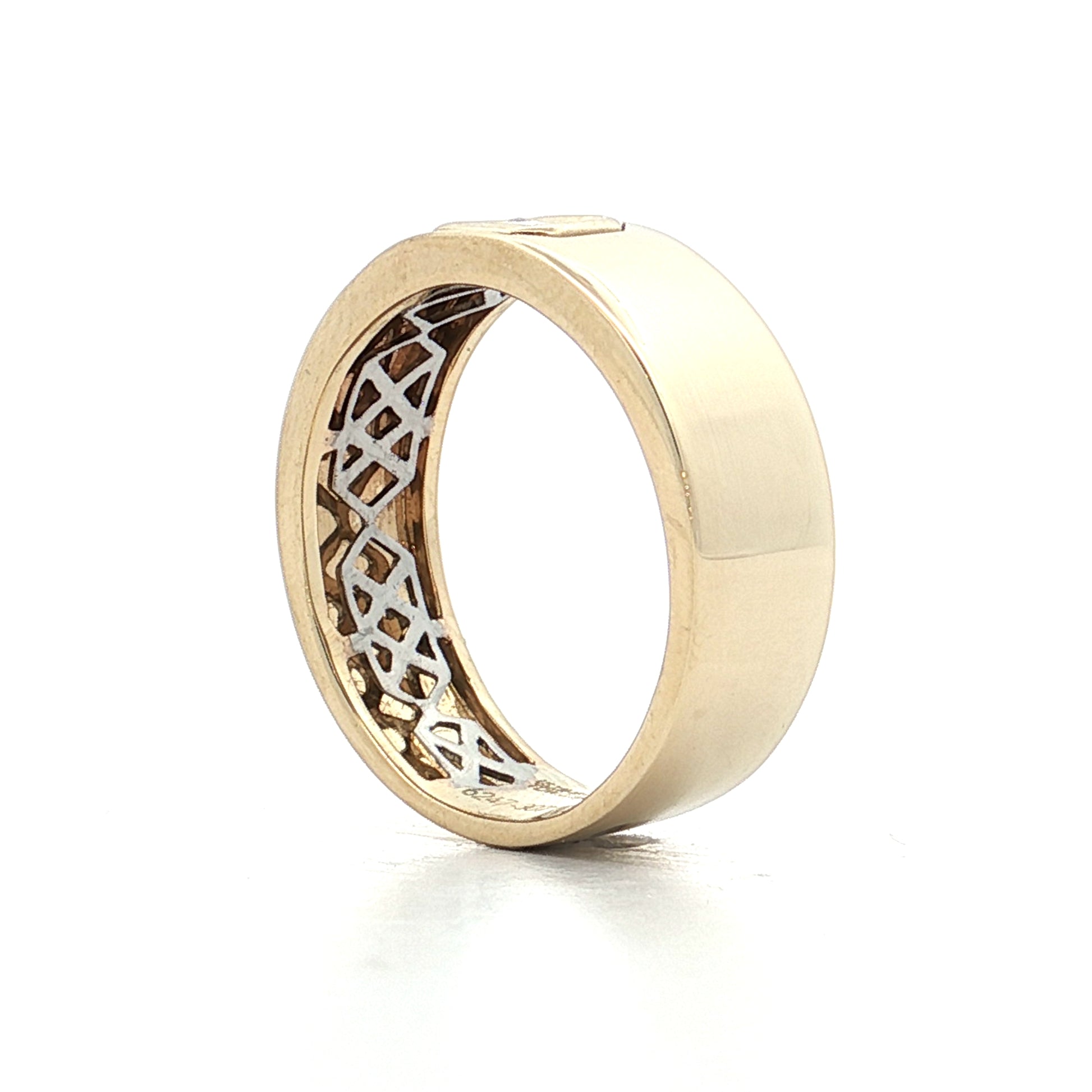 The wide flat-edge band measures 6.8mm in width, giving this ring substantial presence on the hand. The mix of yellow gold and platinum creates a two-tone look with warm and cool metal tones. This design works alone or stacked with other rings for a layered look.