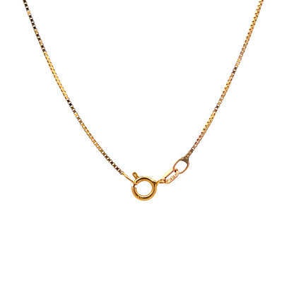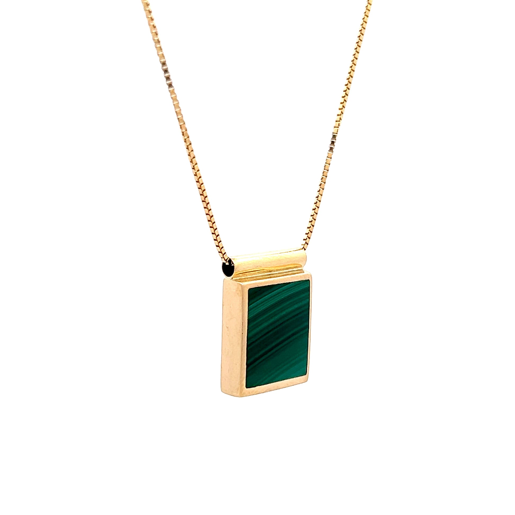 This 14 karat yellow gold pendant necklace features a cabochon cut malachite with a deep green hue and natural banding. The gemstone measures 11.75 x 9.85 x 1.25mm and is set in a rectangular pendant. The polished gold frame highlights the stone’s color and organic patterns. The pendant hangs from a 20-inch box chain, making it easy to wear and style. Whether worn alone or layered, this necklace is a distinctive addition to any collection.
