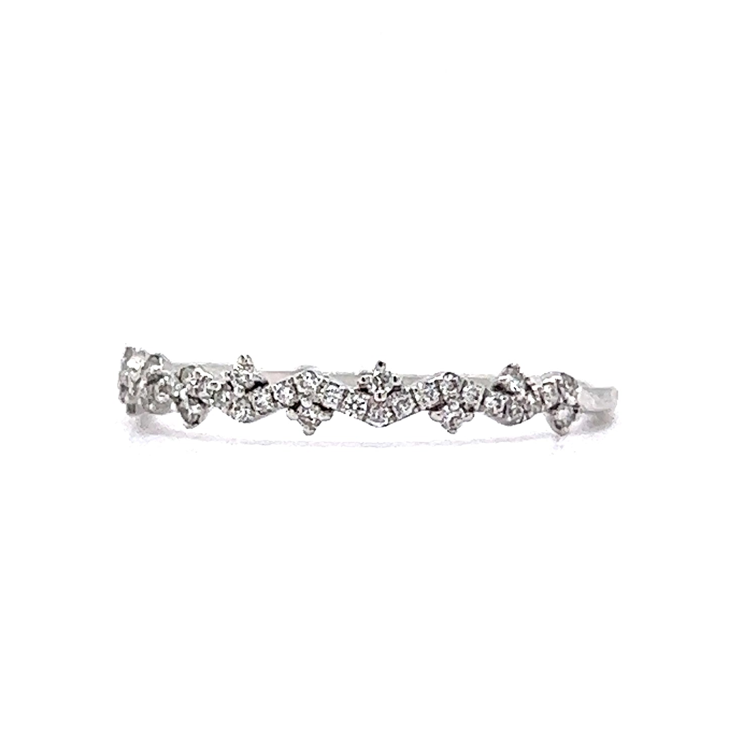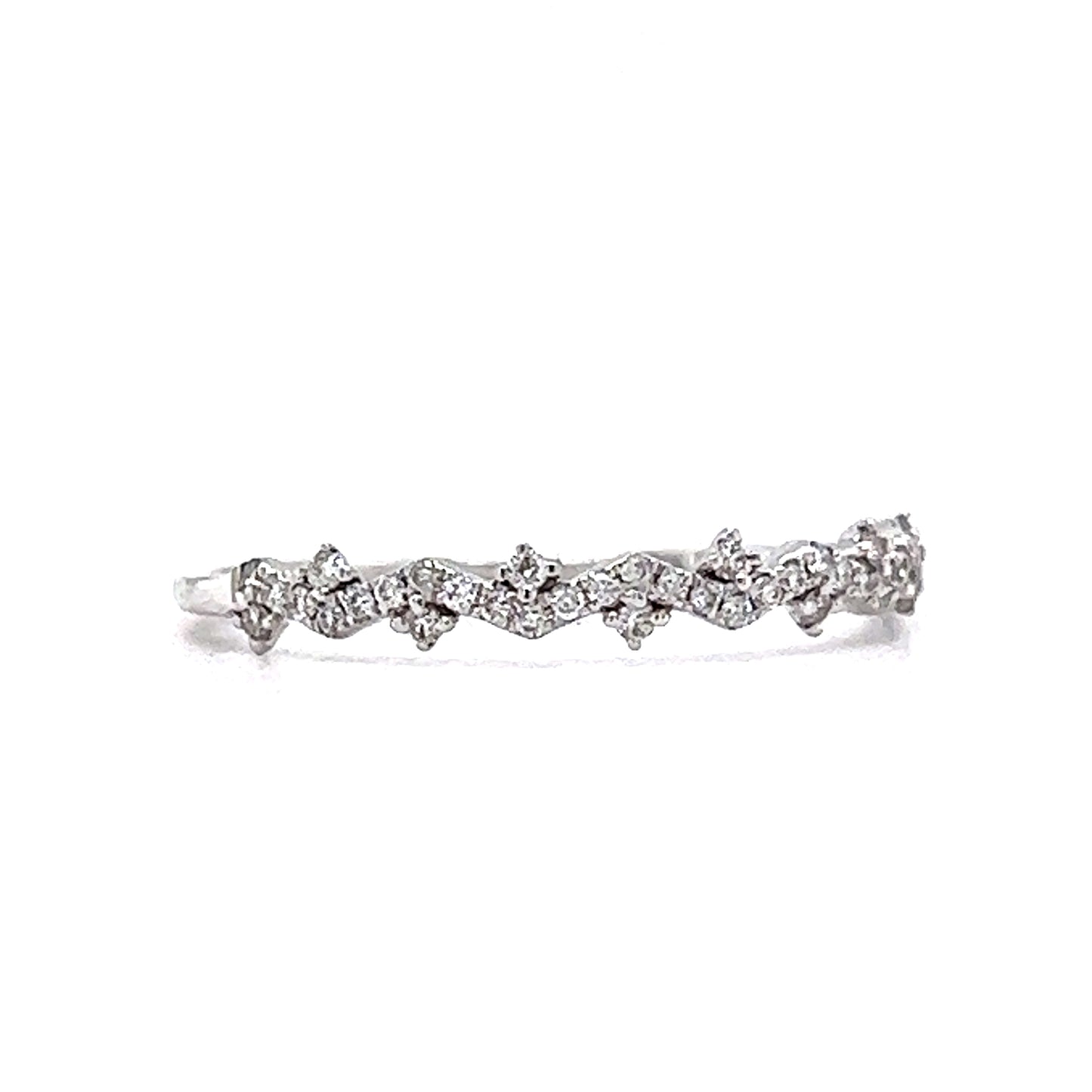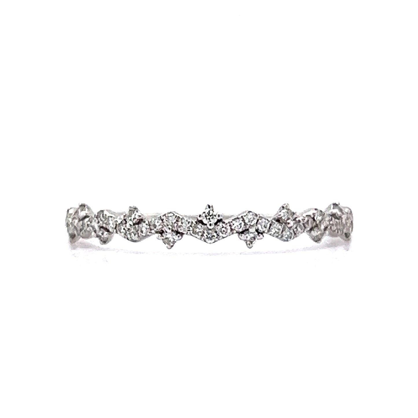 This one of a kind wedding band features a total of .20 carats of pave set diamonds in 14 karat white gold. A mixture of diamond sizes decorate the dancing, geometric pattern on the front half of the band. The diamonds are all bead set and highly brilliant. Wear this ring as your wedding band or as a sparkling addition to a right hand stack.