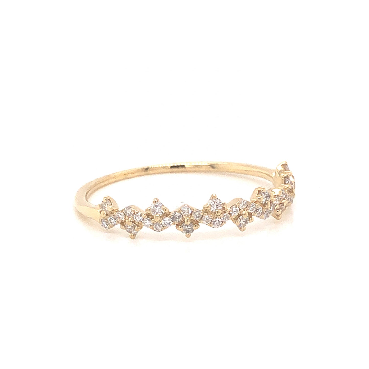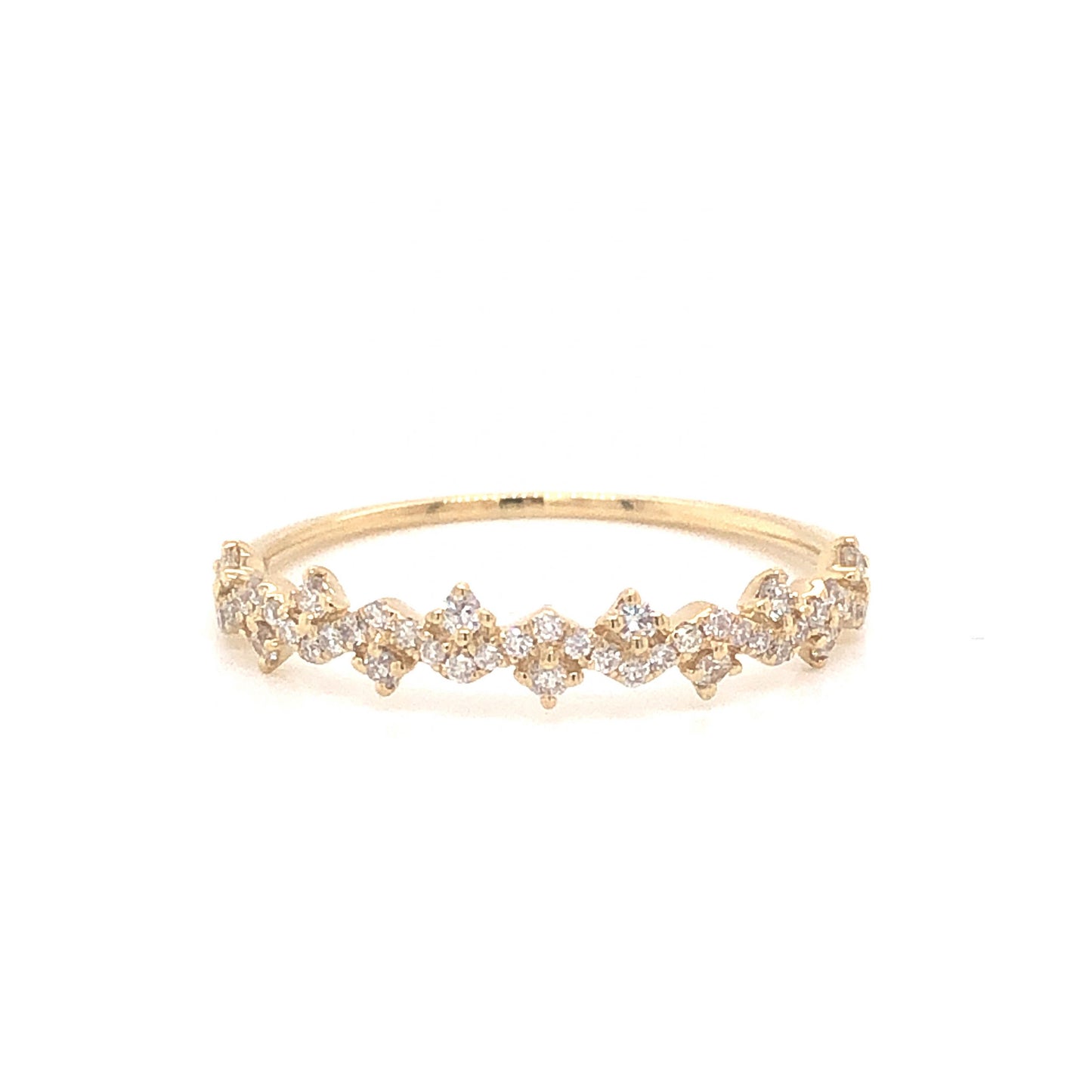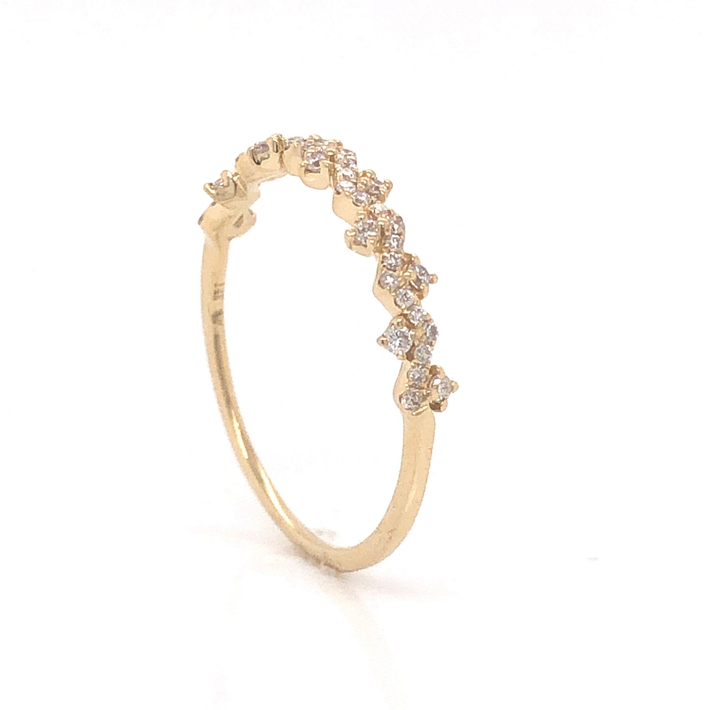 .20 Pave Diamond Wedding Band in 14k Yellow Gold. This stylish pave wedding band features .20 carats of diamonds finished in polished 14 karat yellow gold. The collection of diamonds are bright and sparkling, adding a tasteful contrast to the warm yellow gold setting. The band measures 3 ½ mm wide and features a unique, zigzag pattern. This wedding band has an attractive, modern look and would pair well with a yellow gold engagement ring from any era.