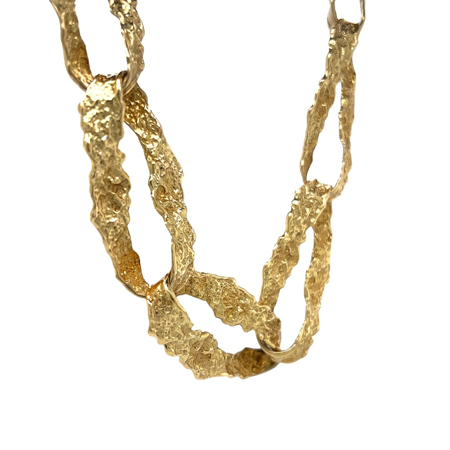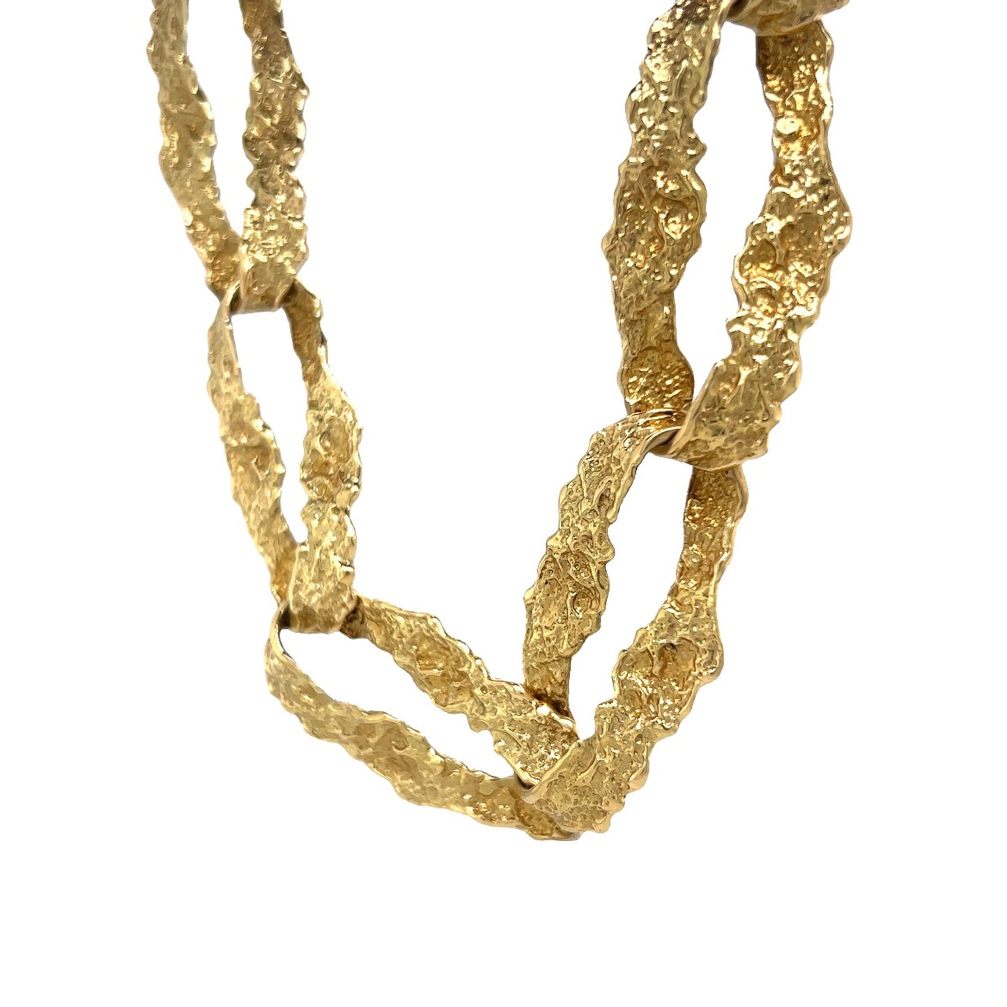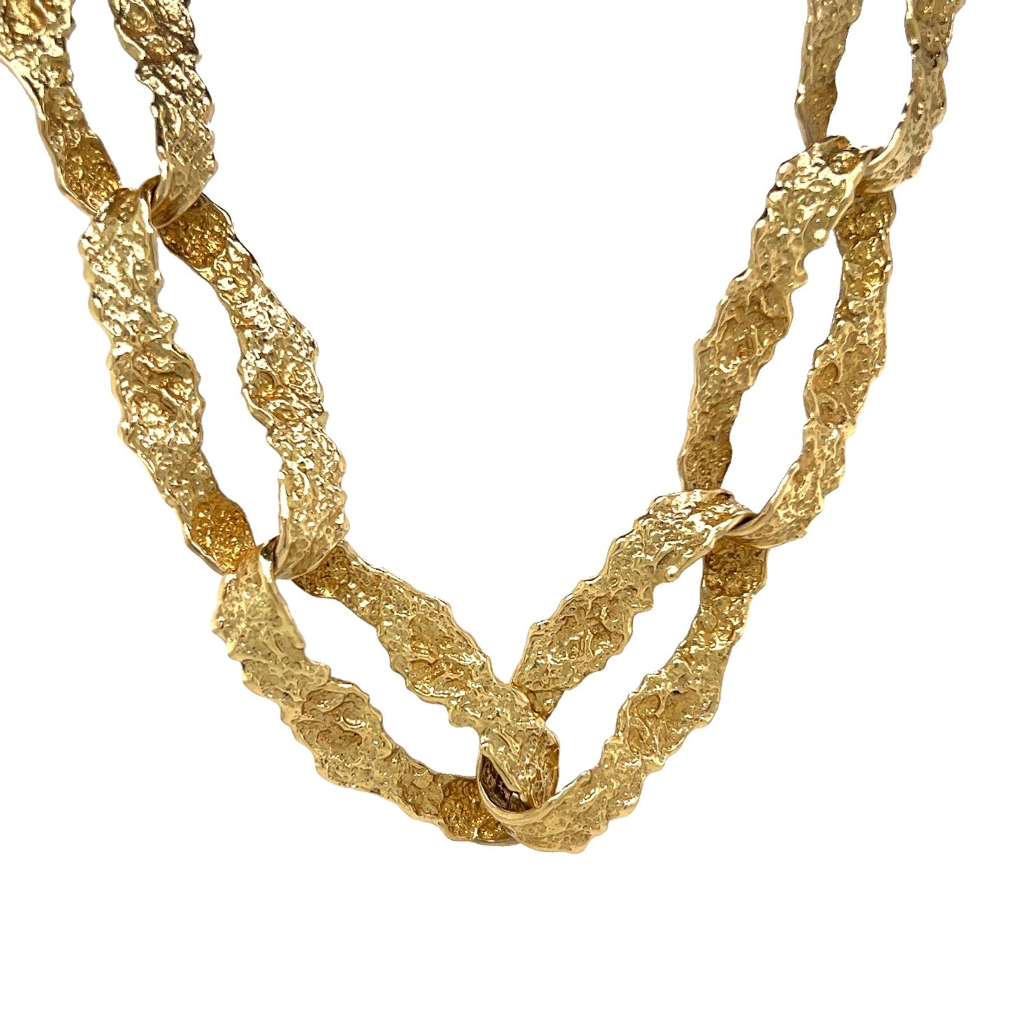 This heavy 1970s handmade 18 karat yellow gold collar style necklace is iconic for the time period. The necklace features textured 1 inch wide oval links with a natural gold nugget appearance and finished in a high polish. This finely crafted necklace is truly extraordinary in design. The necklace weighs over 4 ounces of gold and measures 20 inches in length. A statement necklace that steals the spotlight! A versatile and stylish vintage jewelry piece.