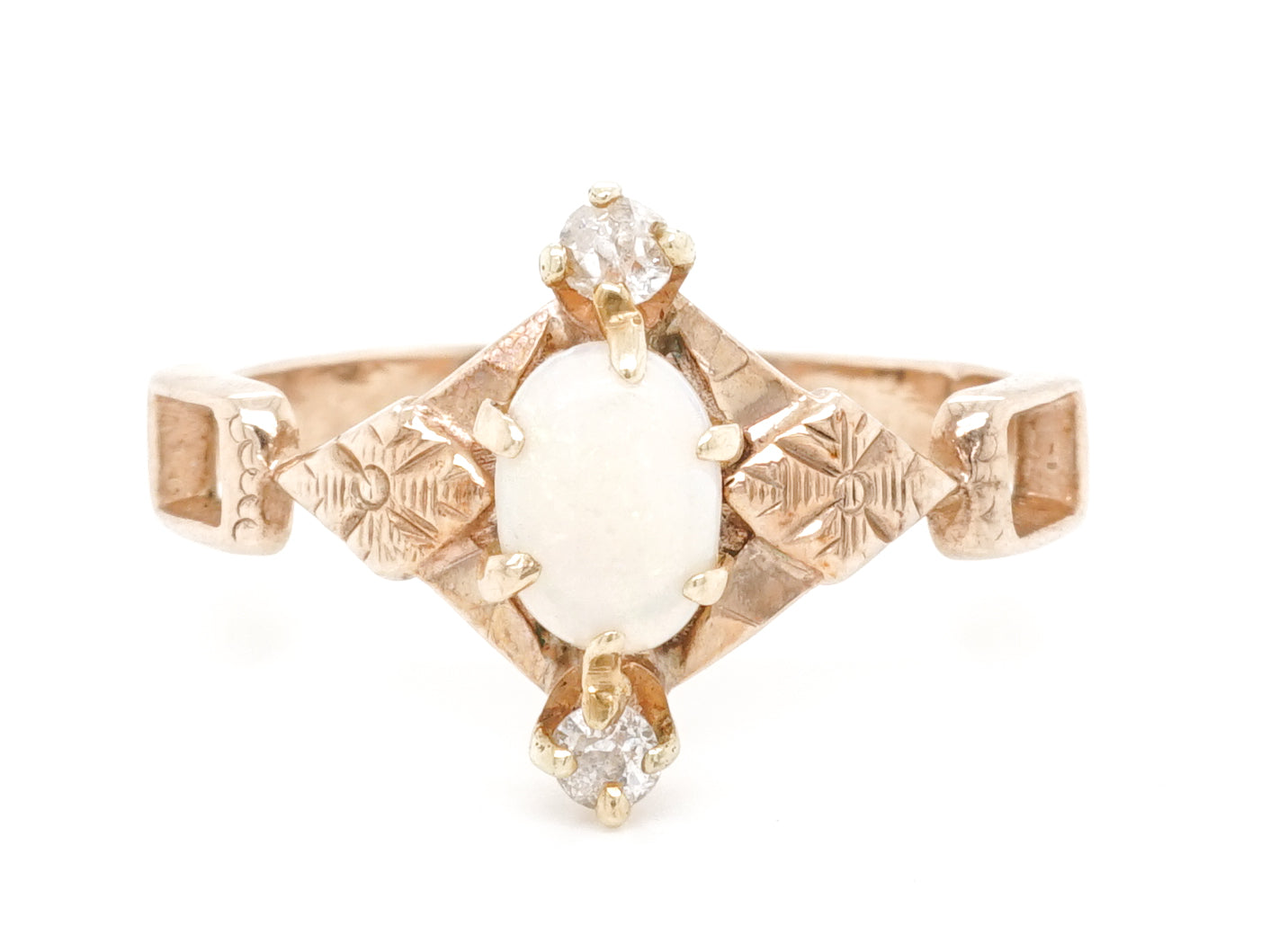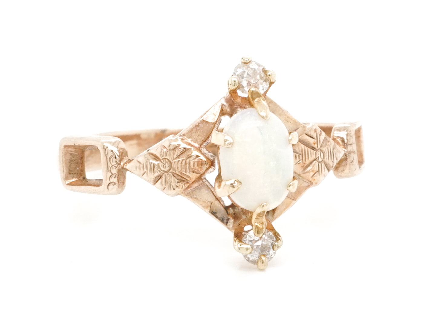.20 Victorian Opal and Diamond Right Hand Ring in 14K Gold. This Victorian right hand ring features a .20 carat opal and .08 carats of mine cut diamonds in 14k yellow gold. The natural opal has a creamy, ivory hue that shimmers iridescent when catching light. The main opal is prong set and accented by two .04 carat diamonds that rest on the top and bottom of the stone. Victorian engravings and openwork shoulders complete the beautiful mounting of this cocktail ring.