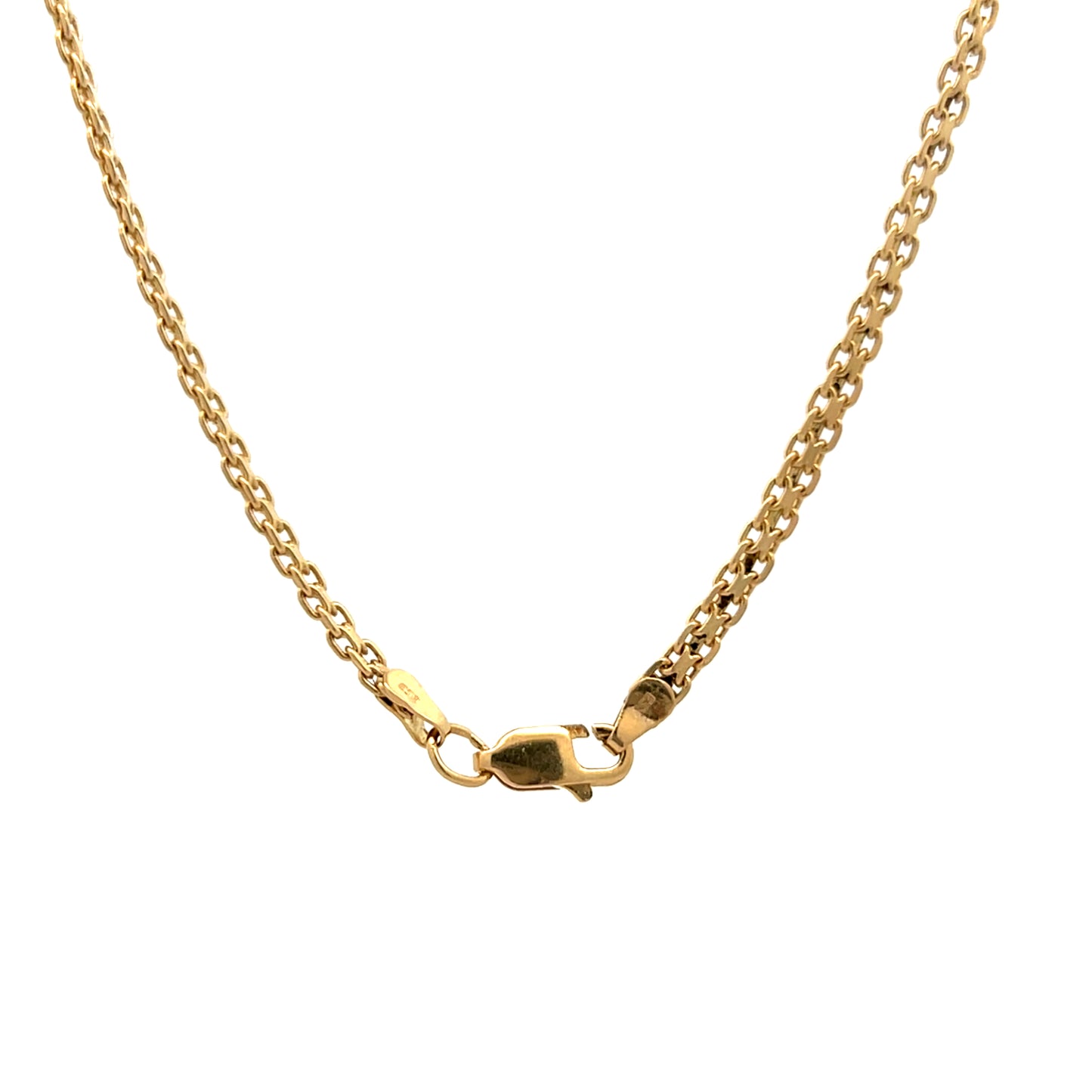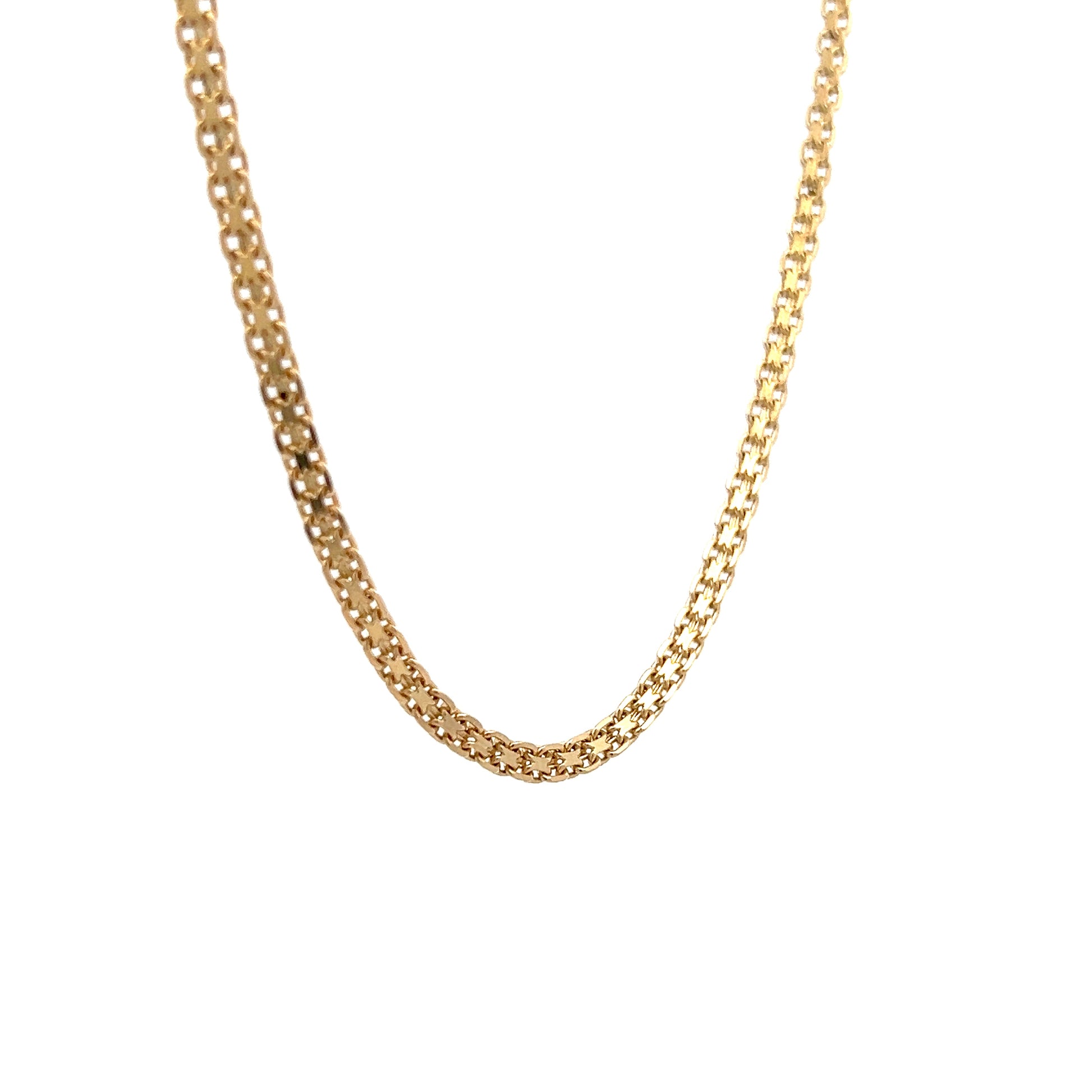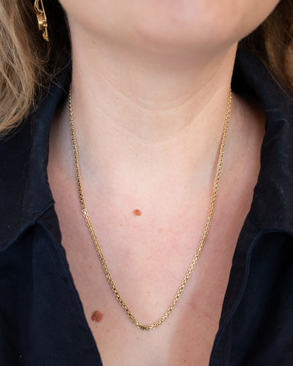 This necklace is a woven oval link chain made from 14 Karat Yellow Gold that measures 20 inches long and 2.8 mm wide. The gold oval links connect in a woven pattern that gives the necklace a distinctive look. The 20-inch length places it at a mid-chest position, and the 2.8 mm width makes it noticeable without being bulky. The necklace can be worn by itself or combined with other necklaces for a layered effect.