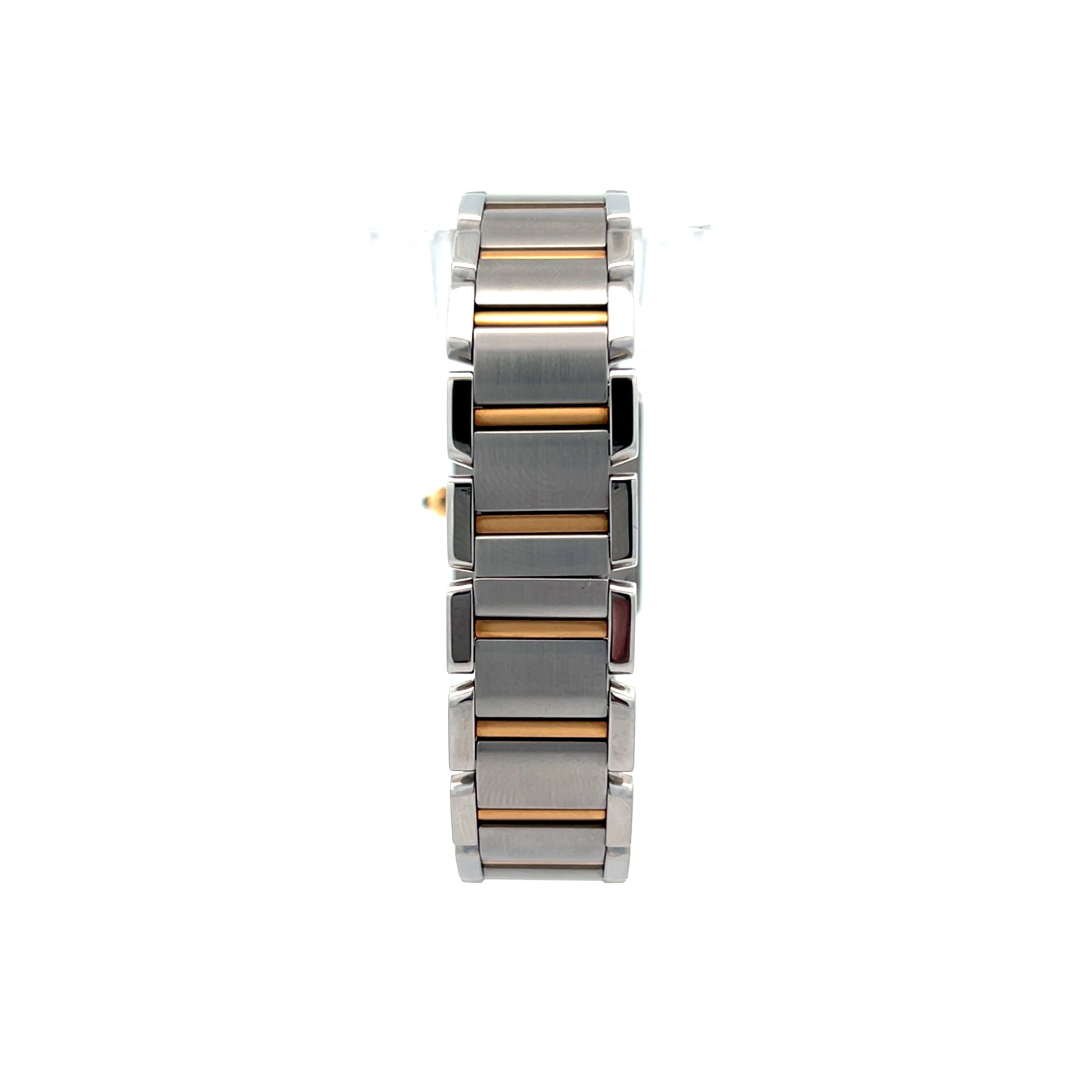 This 2001 Cartier Tank Francaise combines 18K yellow gold and stainless steel in a two-tone bracelet with a 25mm x 20mm case. The quartz movement keeps accurate time without the need for daily winding, and the rectangular Tank case shape has been a Cartier signature since 1917.