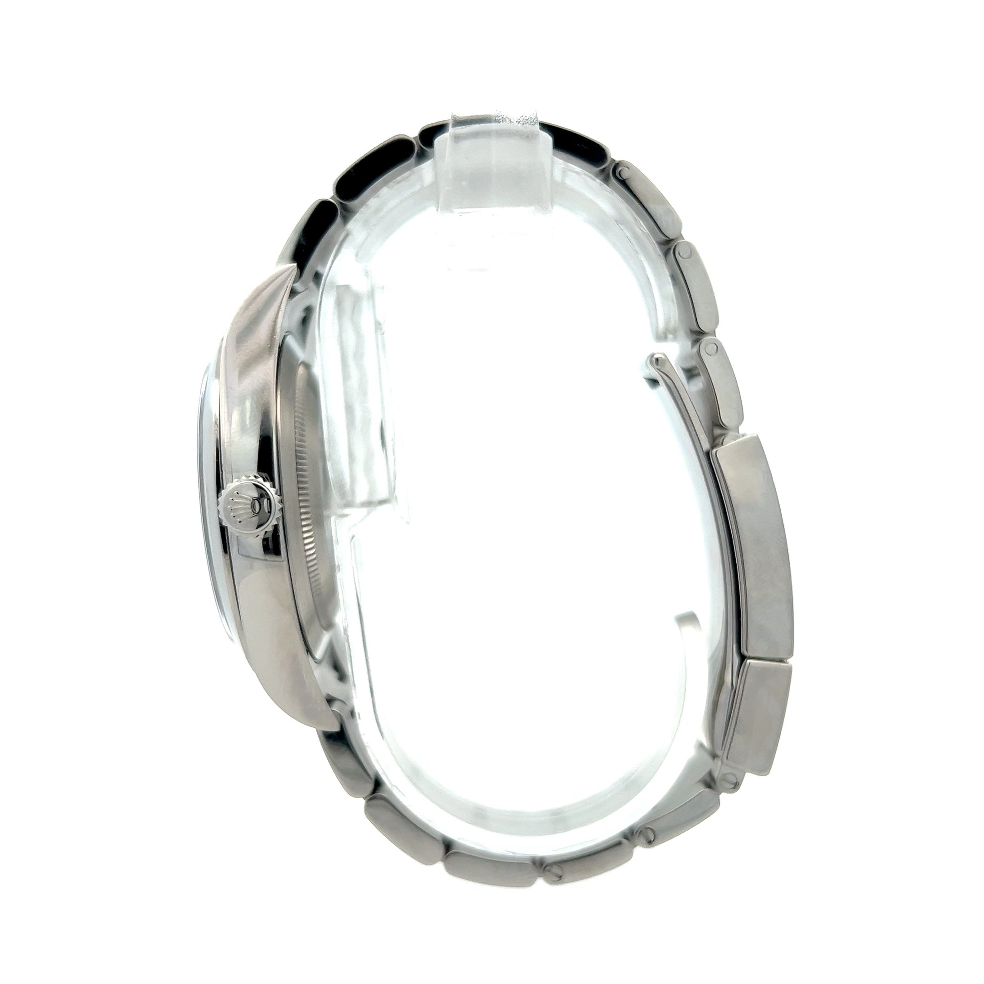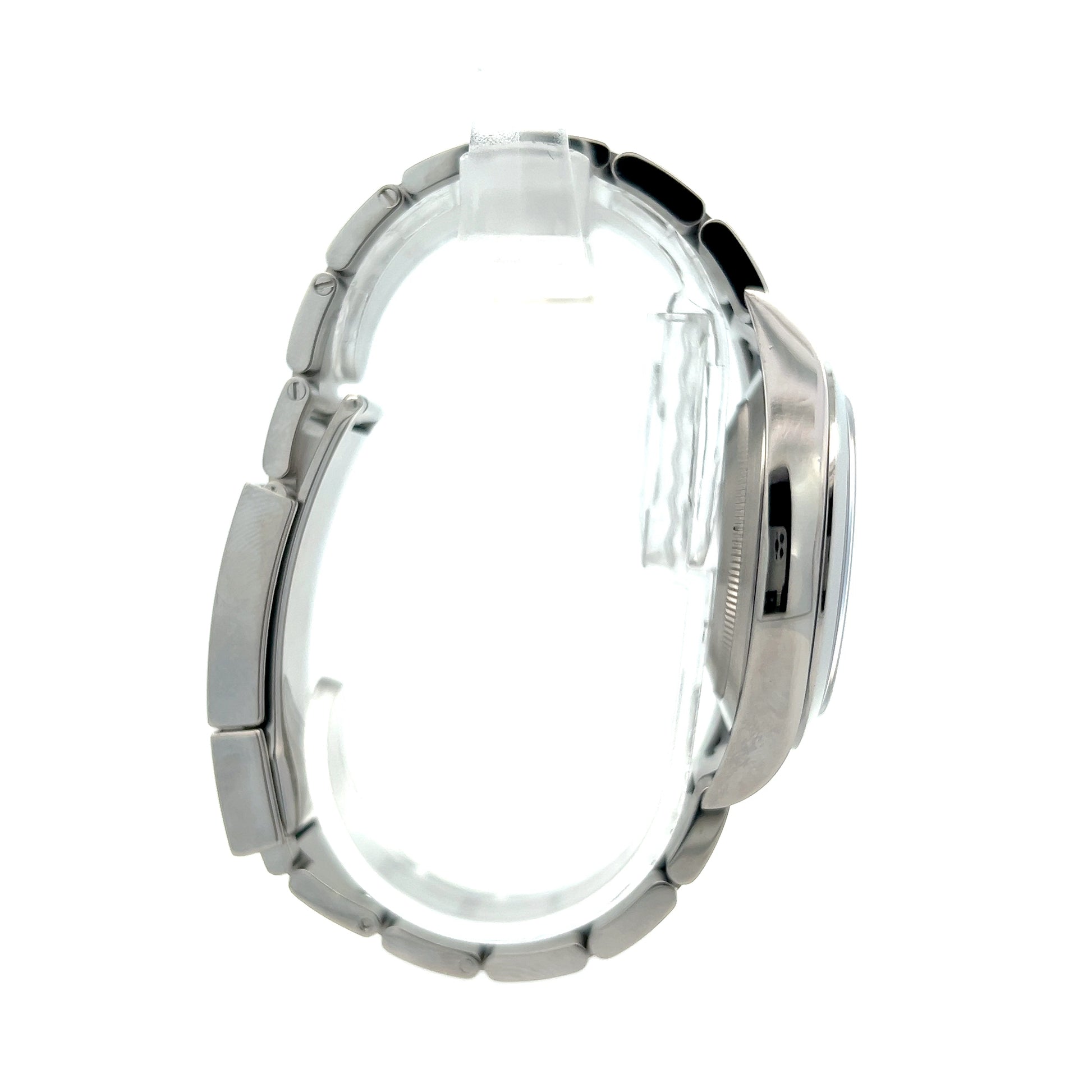 Stainless steel construction provides durability with a weight that's comfortable for extended wear on the wrist. The Oyster bracelet matches the case material with its three-piece link design and Oysterlock folding safety clasp. This watch is in mint condition and includes the complete original set with box, warranty card, booklet, manual, and folio.