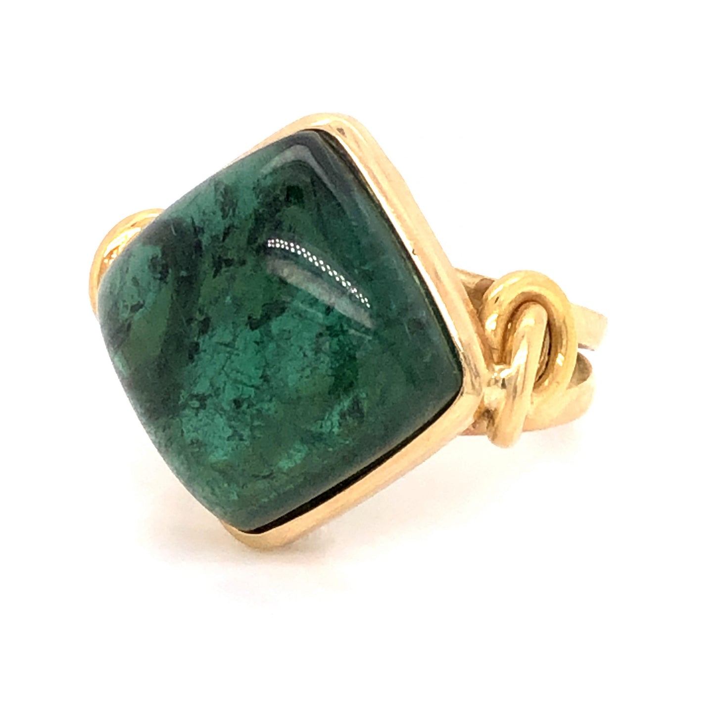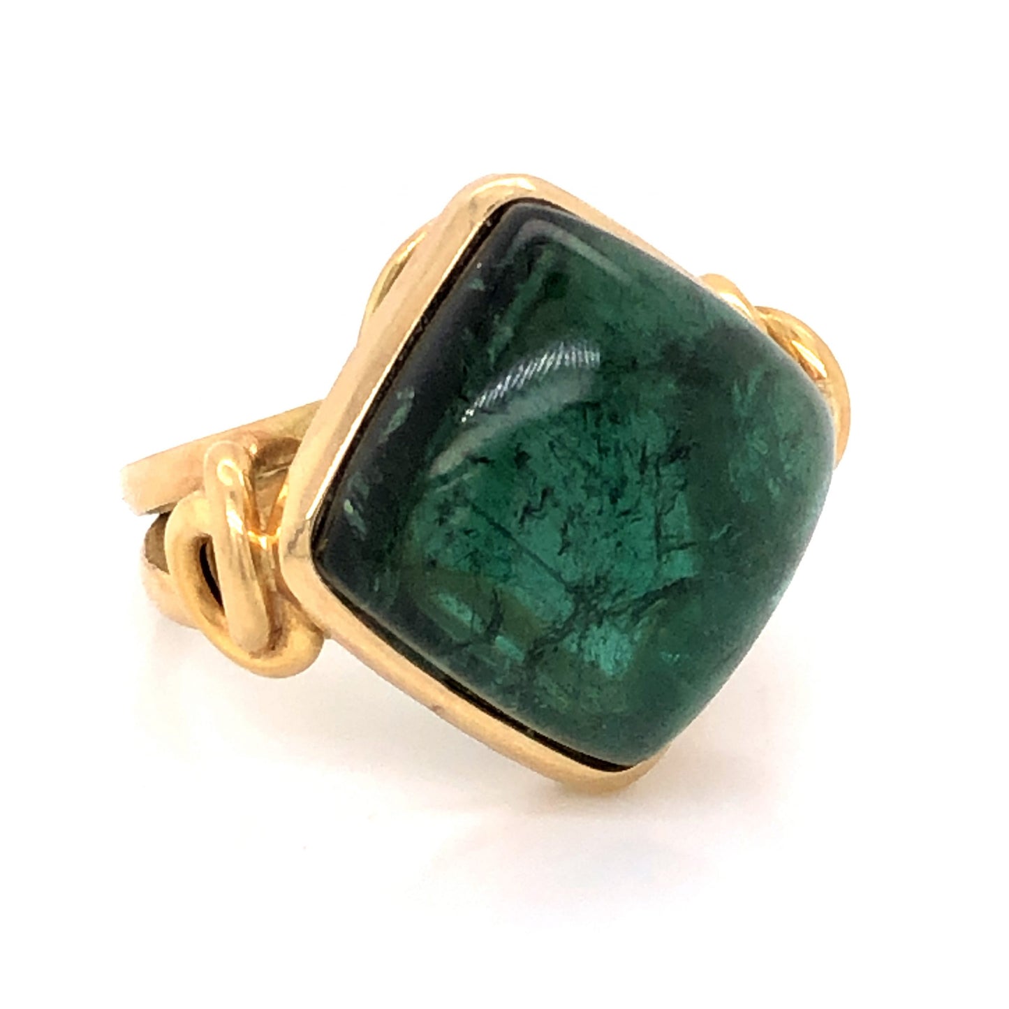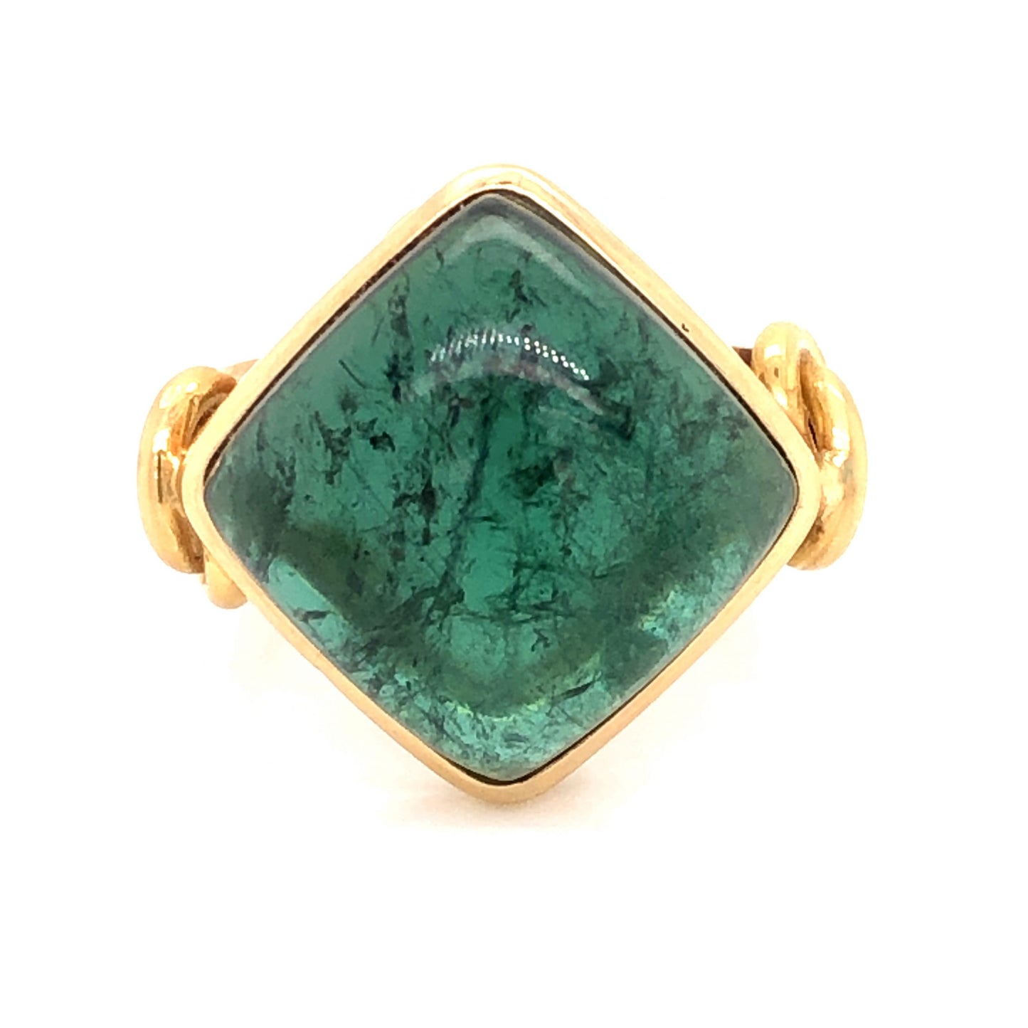 21.00 Tourmaline Cocktail Ring in 14k Yellow Gold. This modern cocktail ring features a 21.0 carat green tourmaline finished in 14 karat yellow gold. The center tourmaline has a marbled, sea green hue. The primary stone is bezel set in polished 14 karat yellow gold. The shoulders of the band showcase ornate, knotted engravings that melt into a comfortable split shank. A glamorous ring for tourmaline lovers!