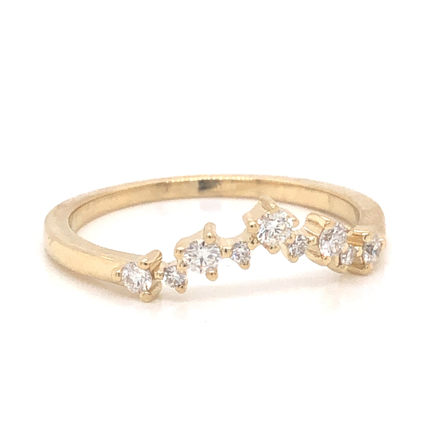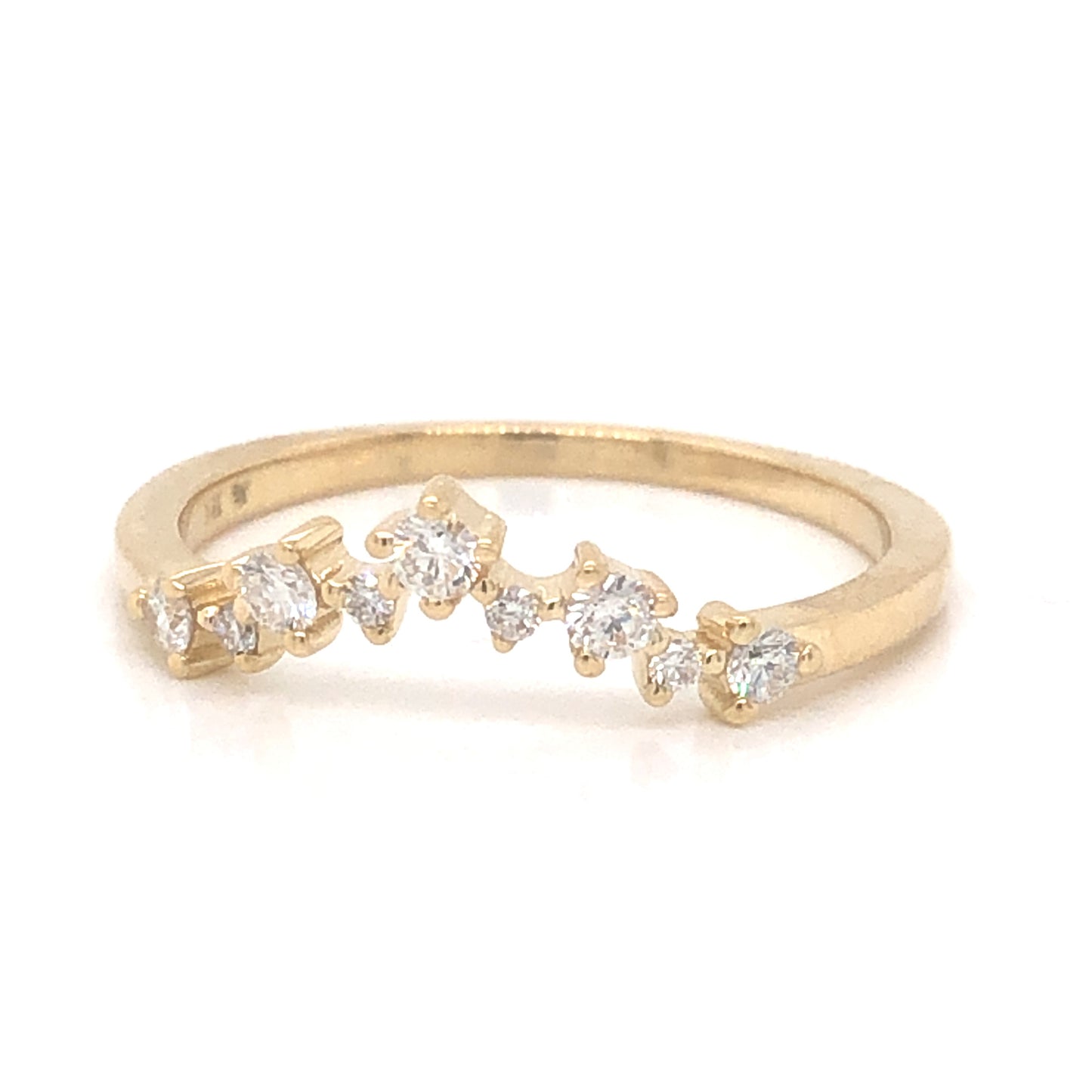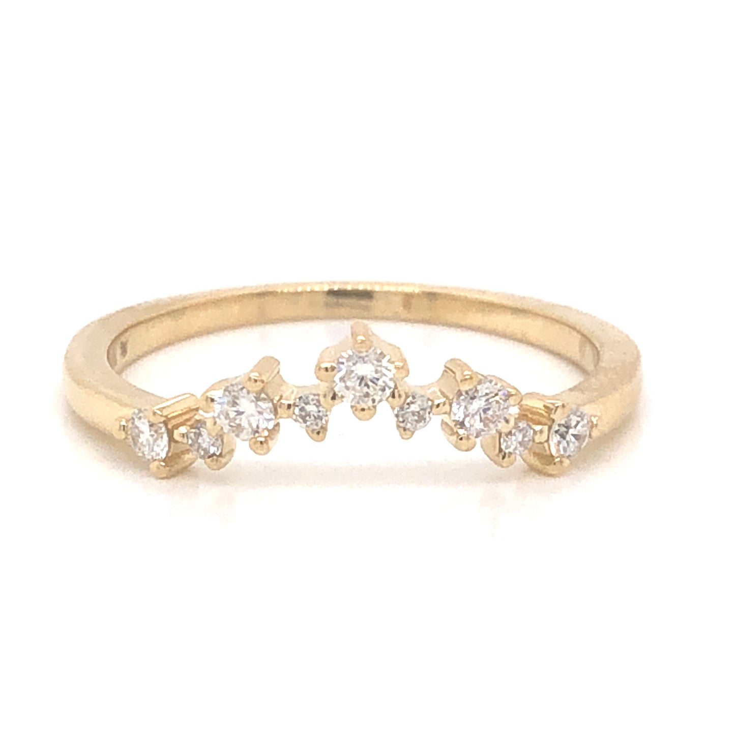 .21 Diamond Tiara Wedding Band in 14k Yellow Gold. This beautiful tiara wedding band features .21 carats of sparkling diamonds finished in 14k yellow gold. Five (5) .03 carat diamonds and four (4) .015 carat diamonds are set in an alternating pattern on the contoured band. The diamonds are prong set on a sleek yellow gold ring. Tiara wedding bands are the perfect companion for solitaire engagement rings or can be worn on the right hand in a stack.