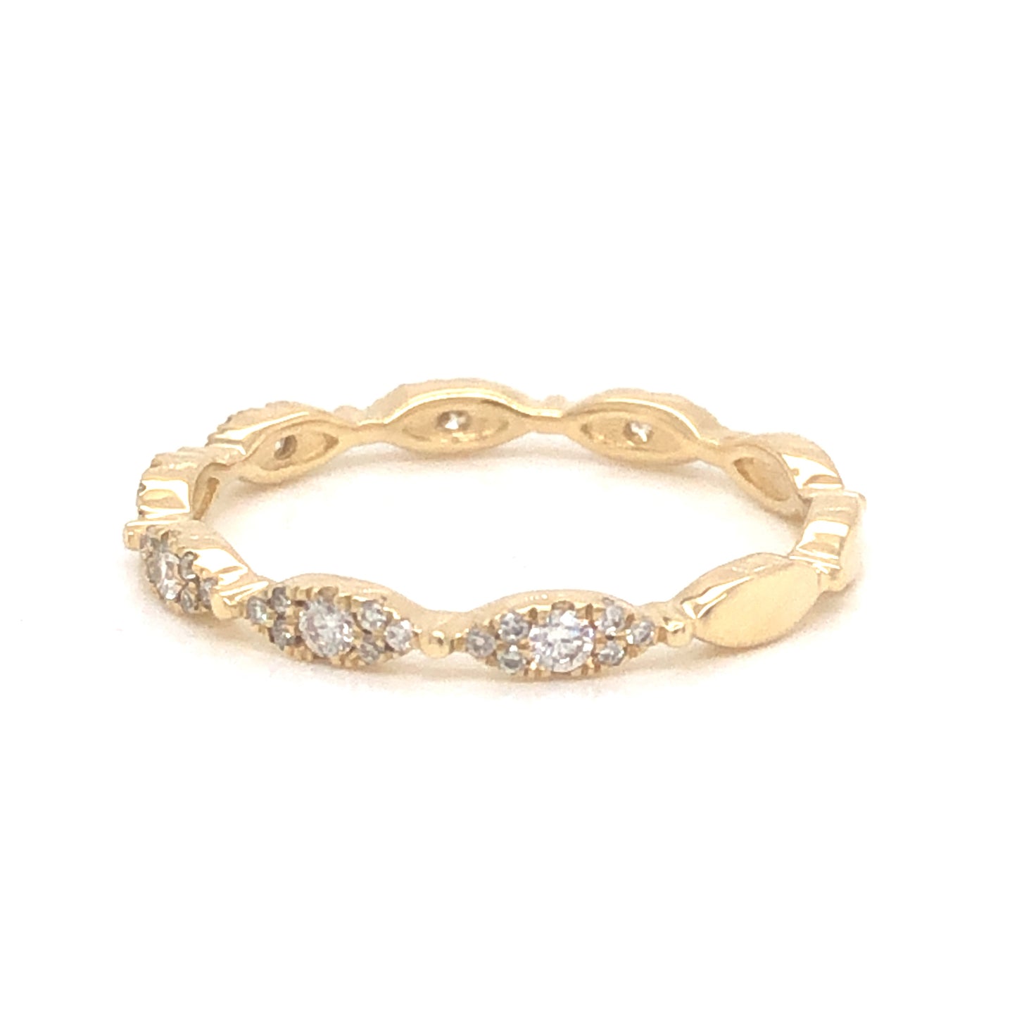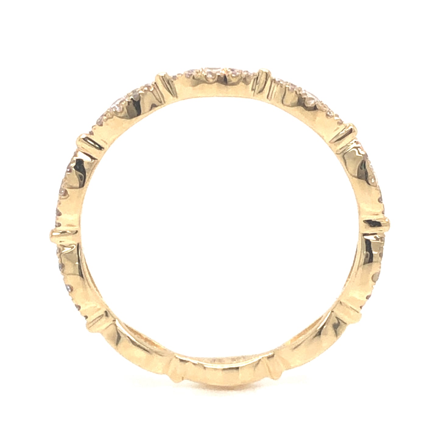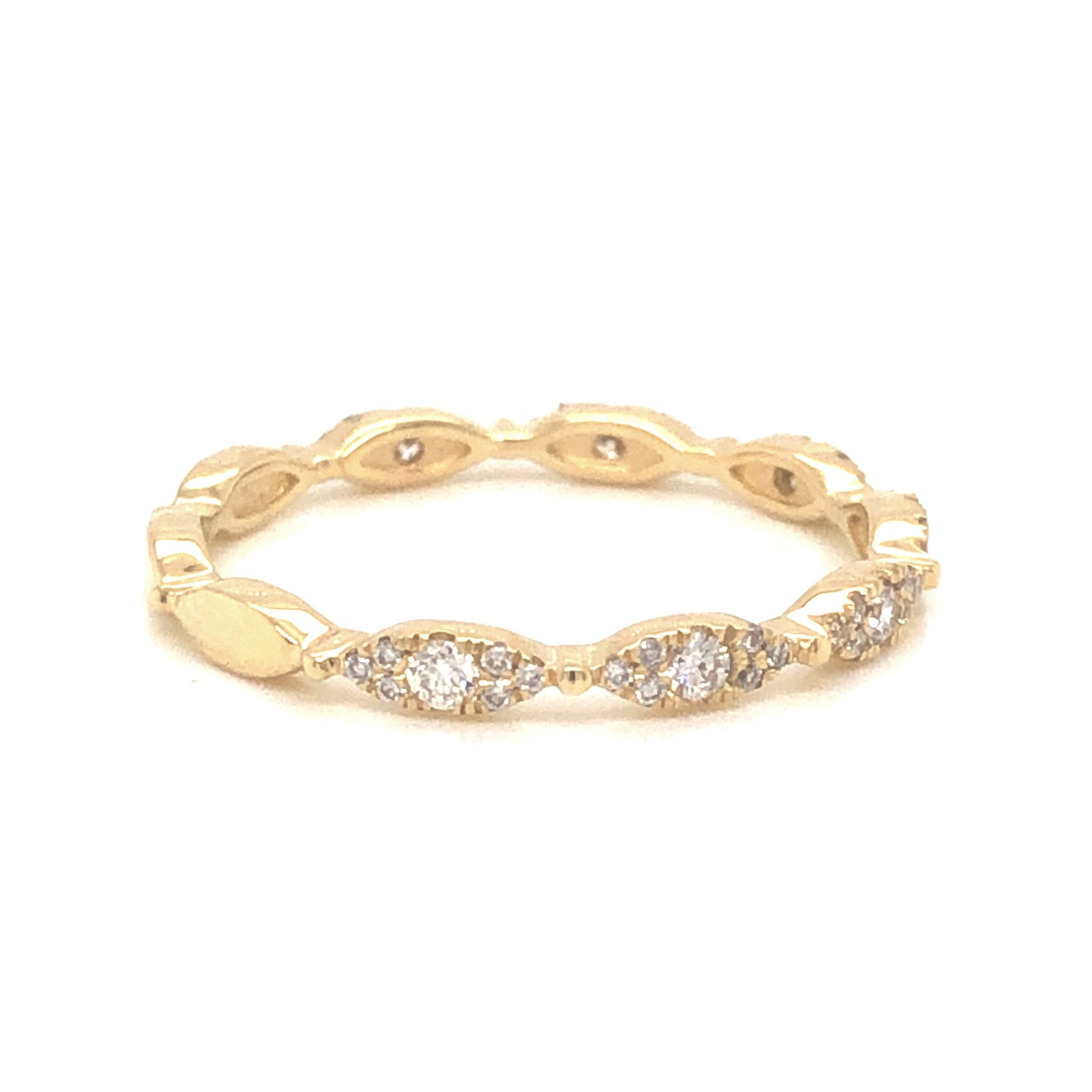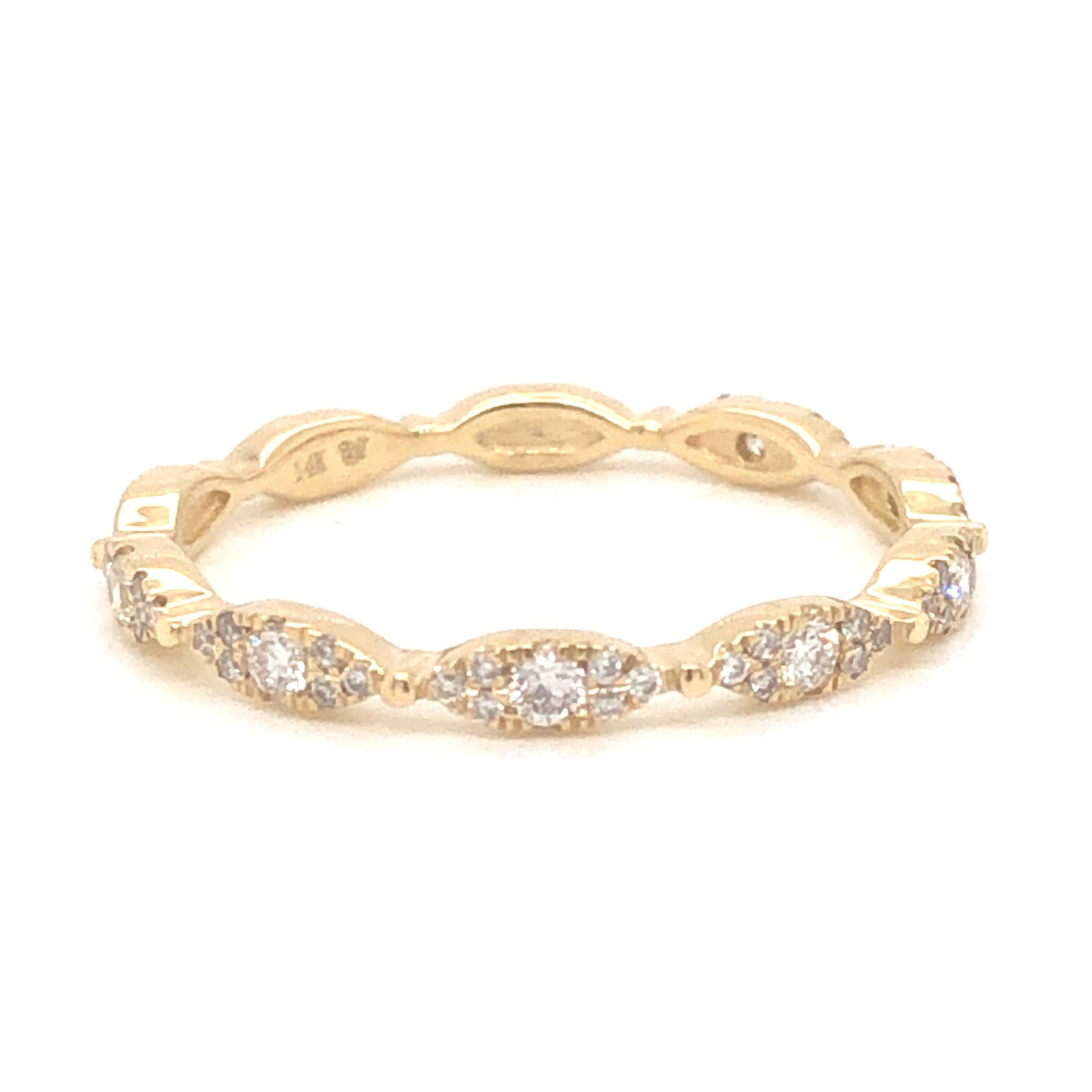.21 Round Brilliant Diamond Wedding Band in 14k Yellow Gold. This effortlessly chic marquise station wedding band features .21 carats of diamonds finished in polished 14 karat yellow gold. Set in a sparkling pave pattern, this versatile band would be a fine addition to any yellow gold engagement ring or can be worn on the right hand in a stack.