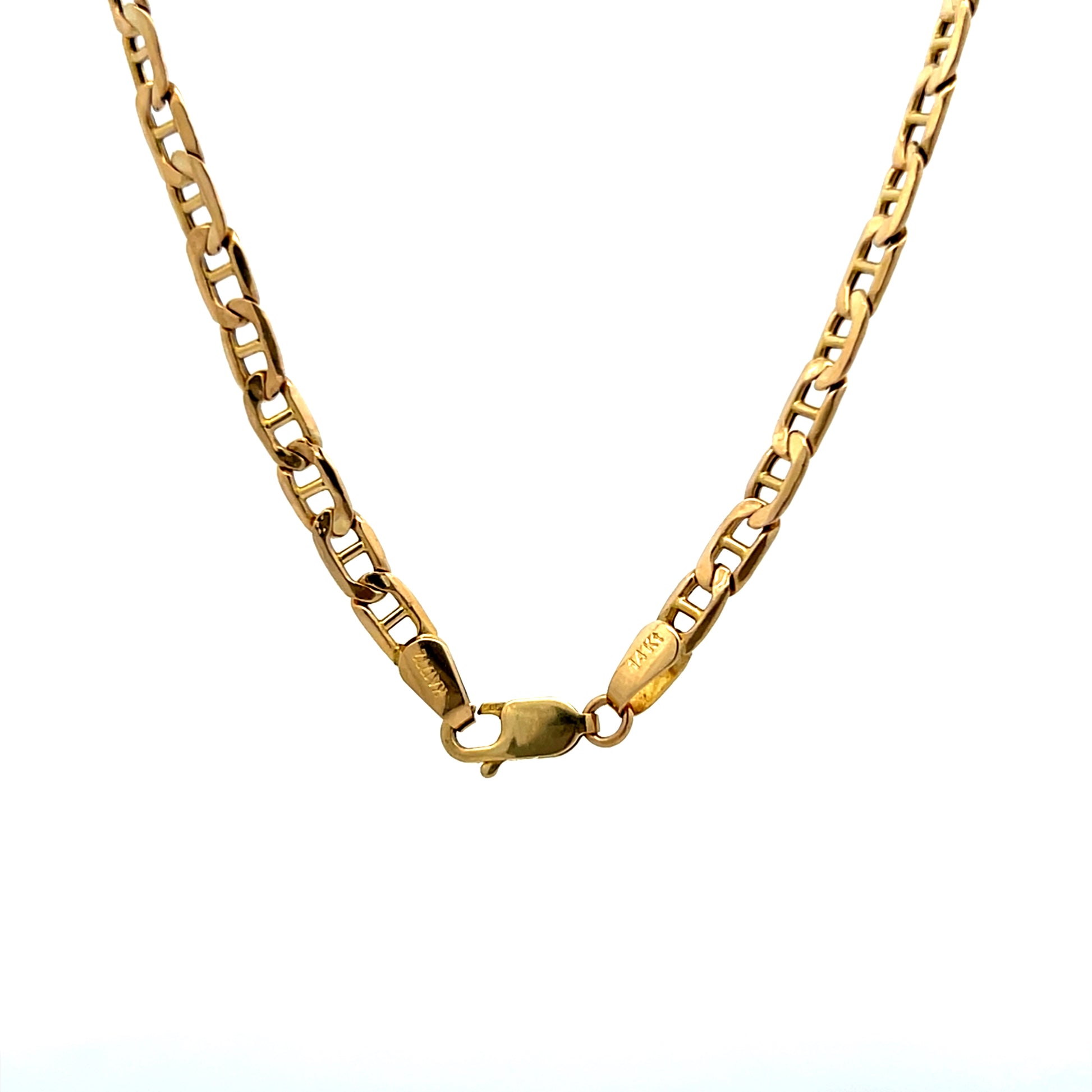 This 14 karat yellow gold anchor link chain necklace measures 22 inches in length and 3.85mm in width, making it a substantial unisex piece. The anchor link design creates a classic pattern that works well for both casual and dressier looks. At this length, it sits nicely at the chest area and provides enough weight to feel substantial without being too heavy. The yellow gold finish gives it a rich color that pairs well with other gold jewelry or stands out beautifully on its own.