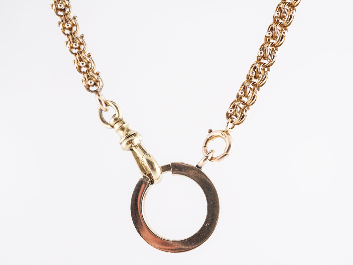 22 Inch Victorian Chain Necklace in 10k Yellow Gold. This 14k yellow gold necklace features a thick, wheat chain design. This chain is 22” in length. Created in the Victorian era and weighing 24.3g, this robust, warm yellow gold chain is a must have!