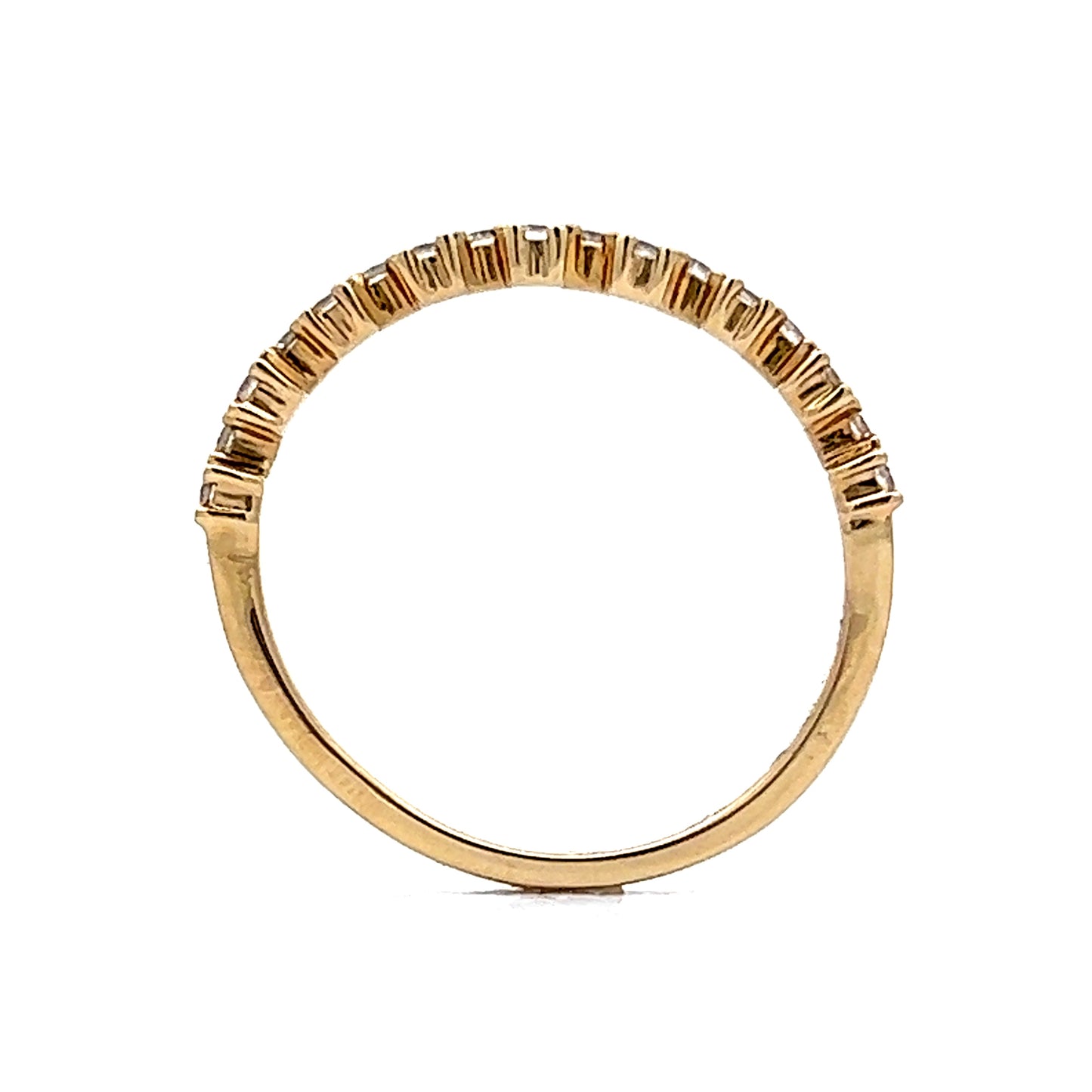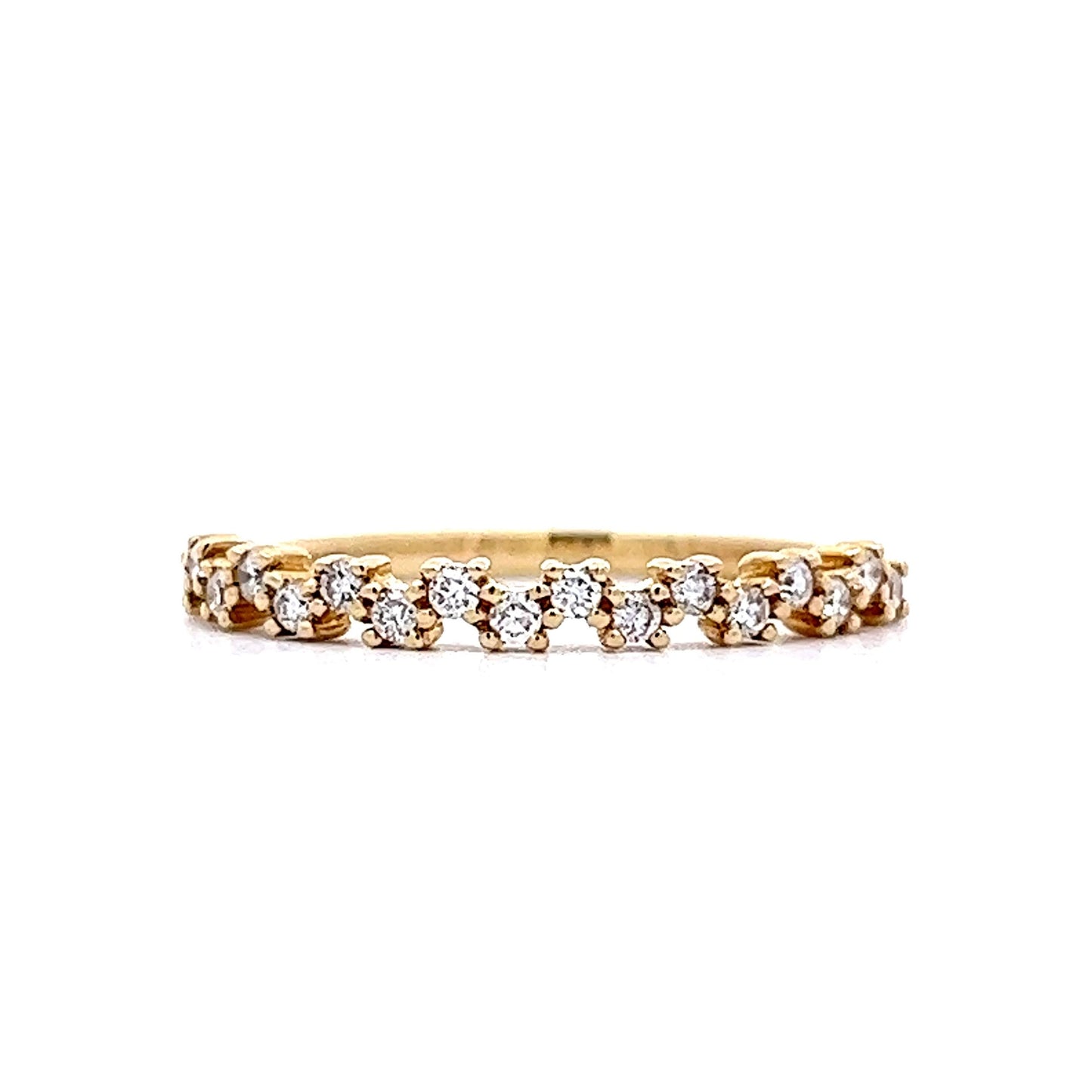This wedding band features .22 carats of sparkling diamonds set in an alternating pattern, finished in 14k yellow gold. Seventeen (17) .0129 carat diamonds, with a bright near colorless color grade, are prong set in a bouncing pattern on the front half of the band. In an elegant, half-eternity style, the diamonds are mounted halfway around the ring which melts into a smoothly polished 14k yellow gold shank.