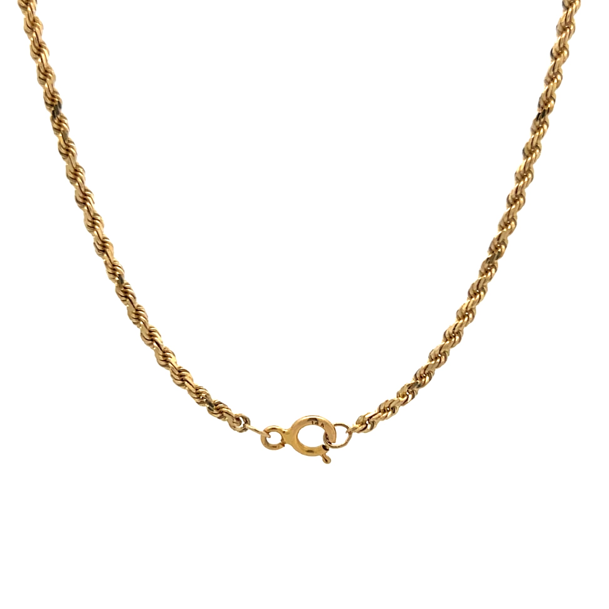 This 14-karat yellow gold rope chain necklace measures 23.5 inches in length and 2mm in width with a spring ring clasp closure. The chain features diamond-cut faceting that creates light reflection along the rope pattern's surface. The longer length provides versatility in how the chain drapes and positions. This piece combines the durability of rope chain construction with the added brilliance that a "diamond-cut" chain brings to gold jewelry.
