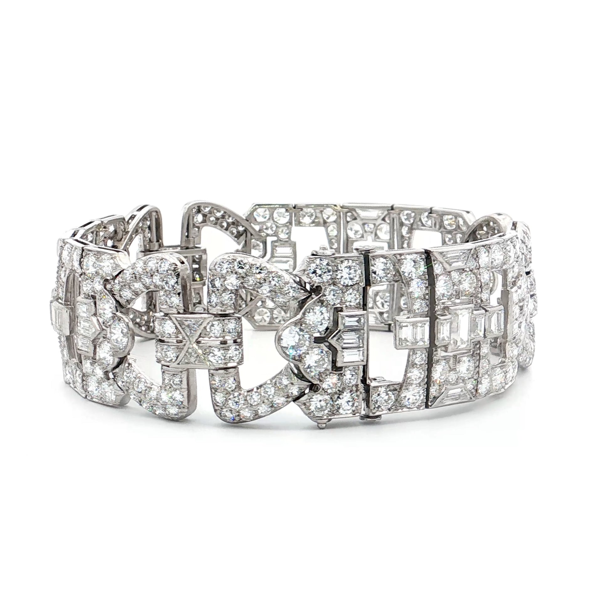 This Art Deco platinum bracelet features a geometric link design set with natural diamonds totaling 23.14 carats in mixed cuts including Old European, step cut, emerald cut, trilliant, and shield shapes. The diamonds range from F to H color—meaning they're nearly colorless with little to no visible tint—and VS1 to VS2 clarity, which indicates very minor inclusions difficult to see even under 10x magnification.
