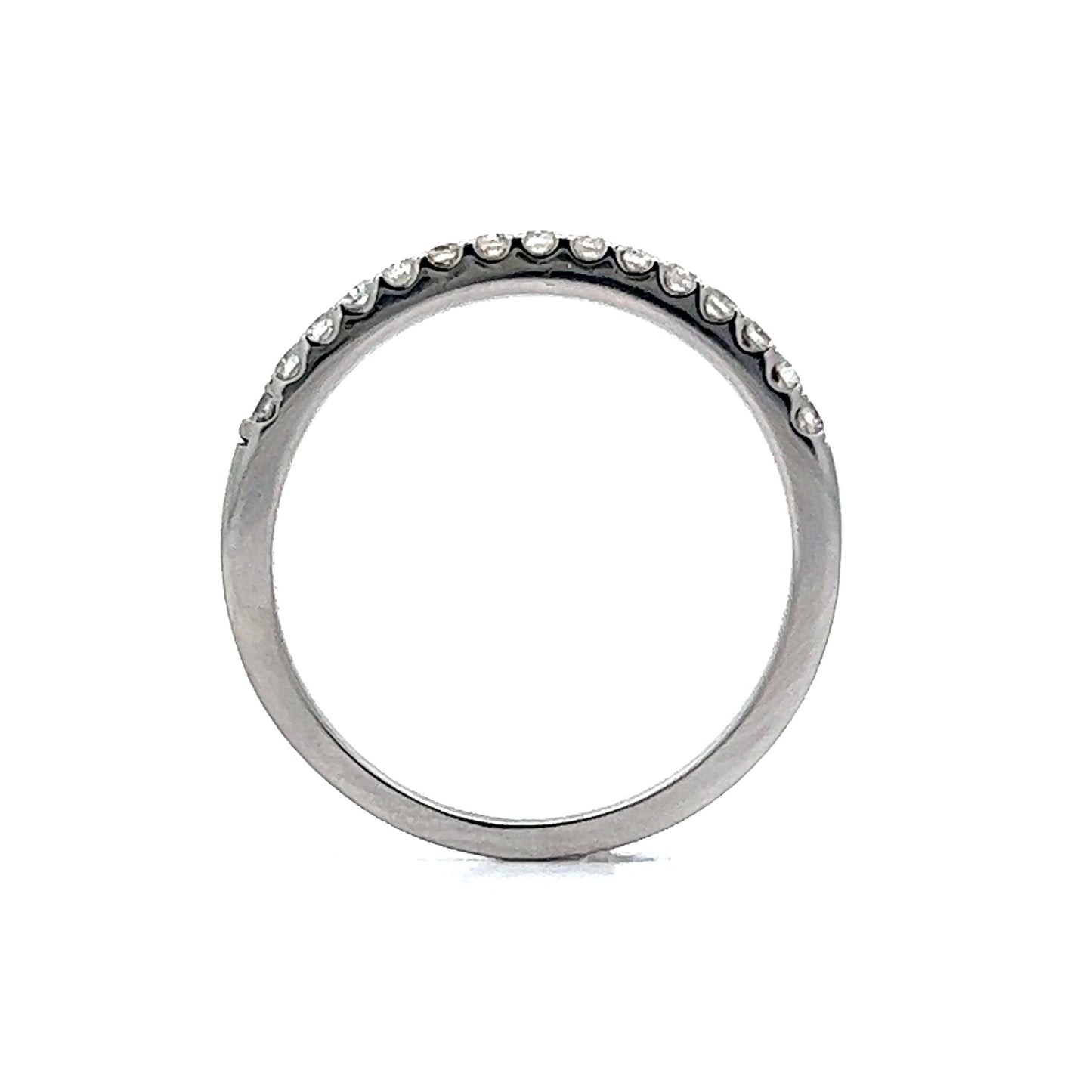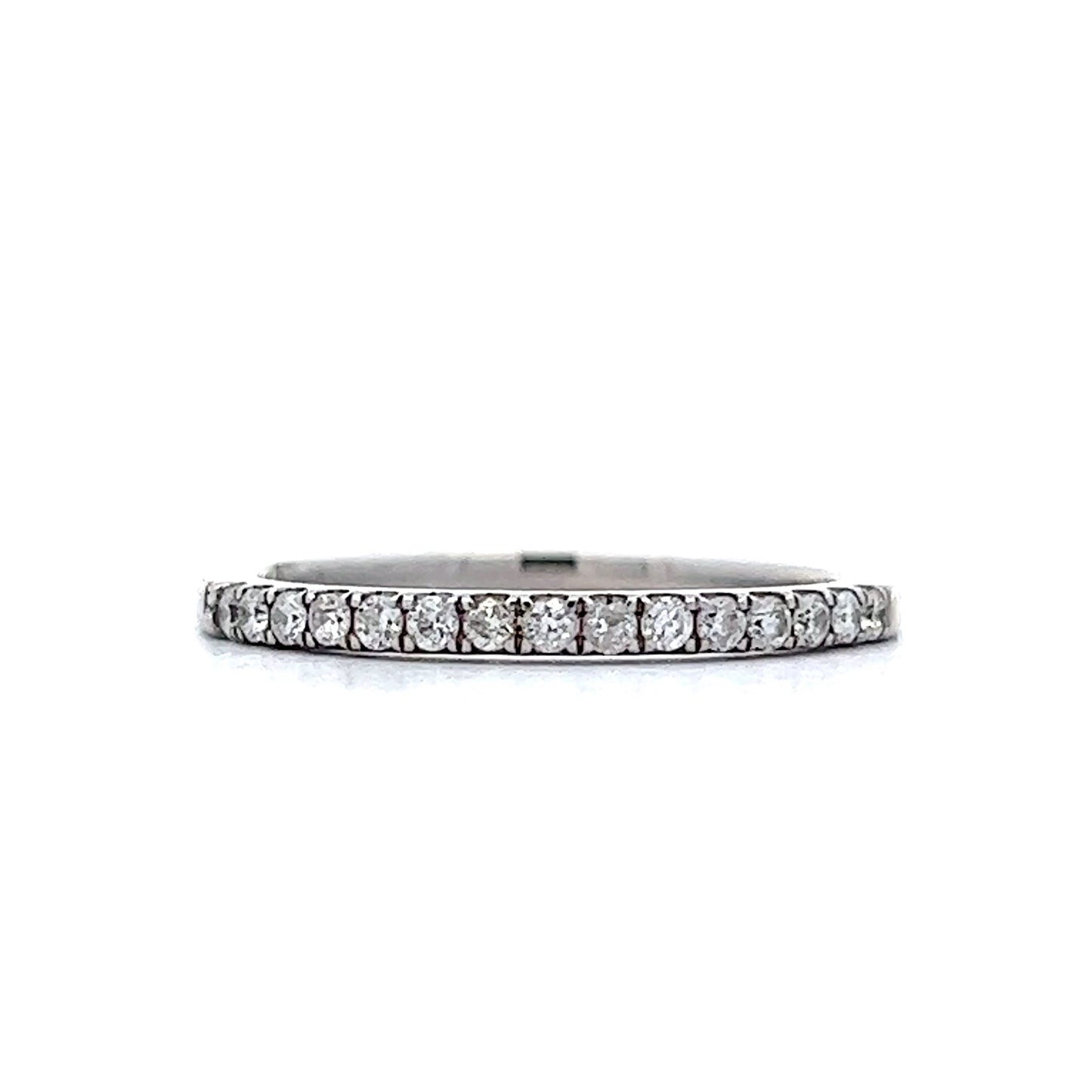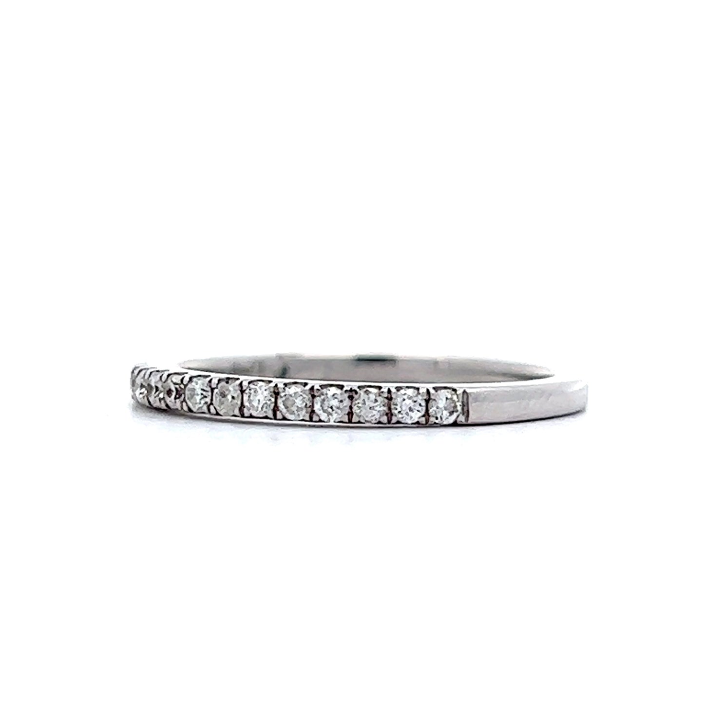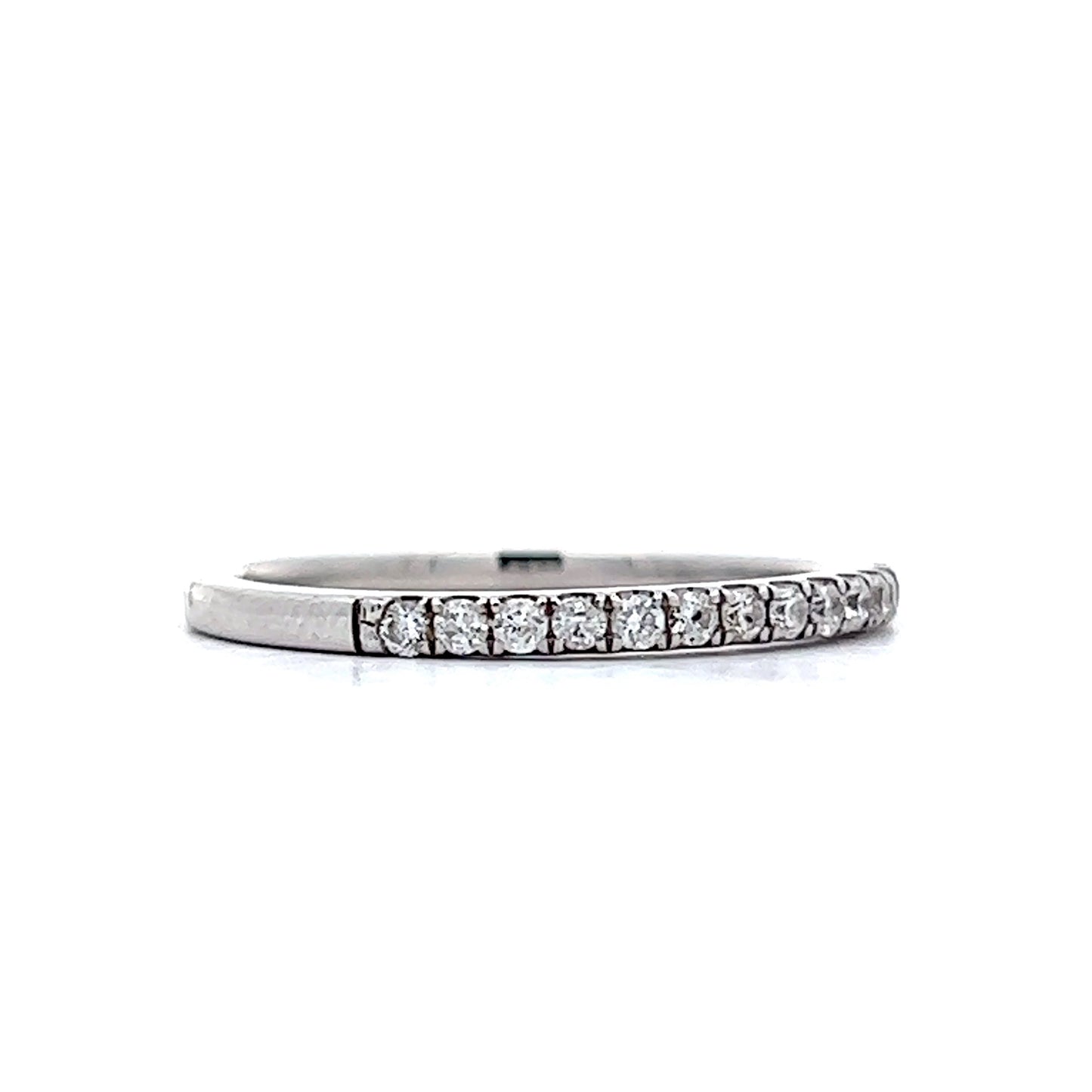 .23 Carat Diamond Wedding Band in White Gold. This diamond wedding band features fifteen (15) bead set diamonds in 14 karat white gold with a total carat weight of .23 carats. The diamonds are set half way around the length of the band and provide a beautiful shimmer from every angle. This band would pair well with most any antique or modern engagement ring or stack.