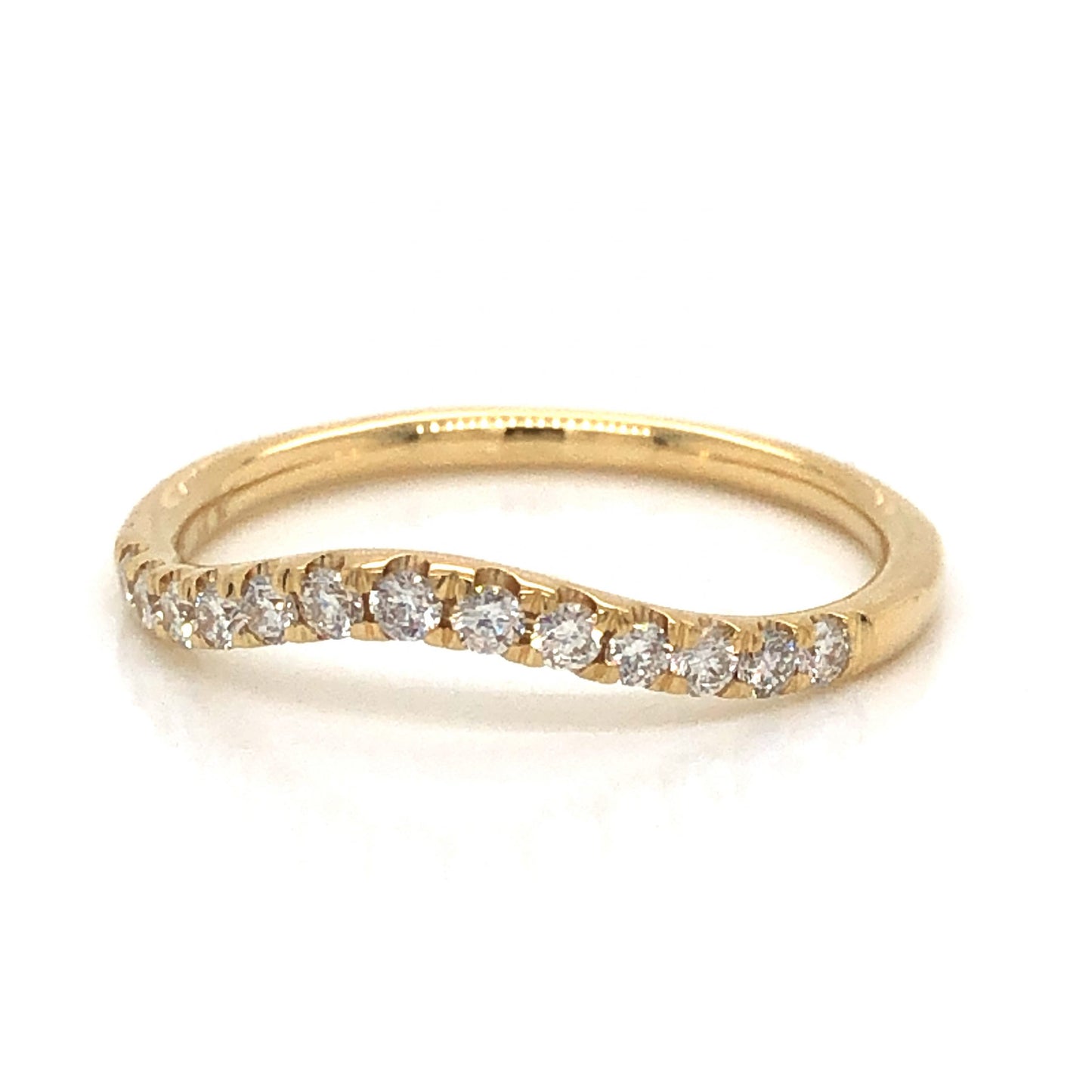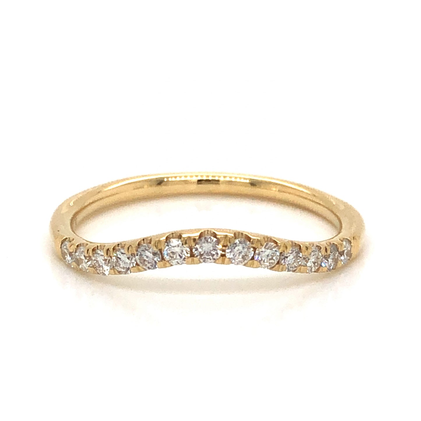 This radiant By Filigree curved wedding band features .23 carats of sparkling diamonds in 14 karat yellow gold. Thirteen (13) .018 carat Round Brilliant cut diamonds are mounted in a fashionable scallop setting on the front curve of the band. The soft contour in the band allows space for the stone in a wider engagement ring to fit snugly. This custom band would also make a lovely right hand stacking ring!