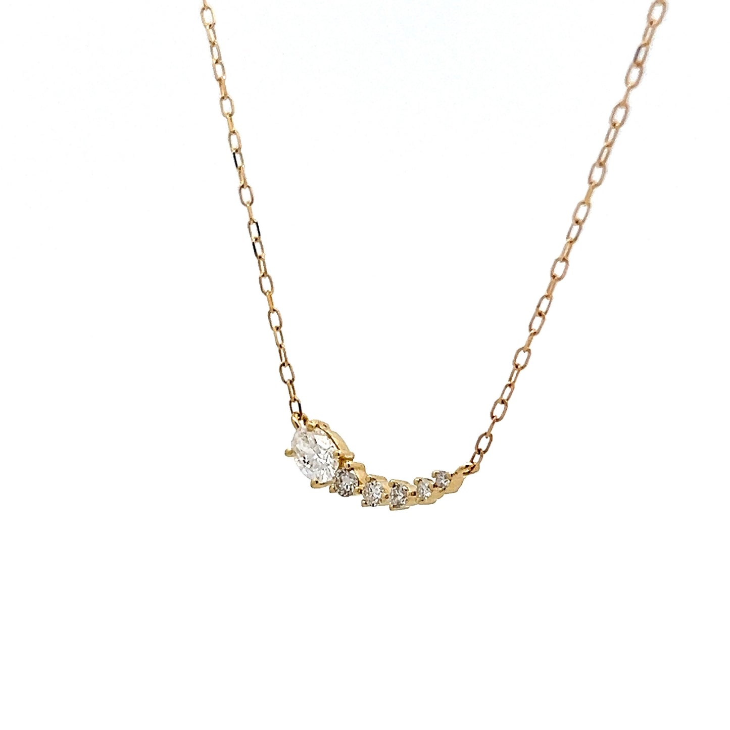 This 18 karat yellow gold pendant necklace merges sleek design with striking details, featuring a curved bar adorned with an oval cut diamond at its center. Weighing .23 carats with SI1 clarity and E color, the diamond sits in a prong setting that maximizes its sparkle. A graduated line of five round brilliant diamonds, ranging from 1.0 mm to 2.0 mm and totaling .10 carats, traces the curve, adding a subtle yet impactful shine. This versatile piece stands out whether layered or worn alone, bringing a bold, refined touch to any look