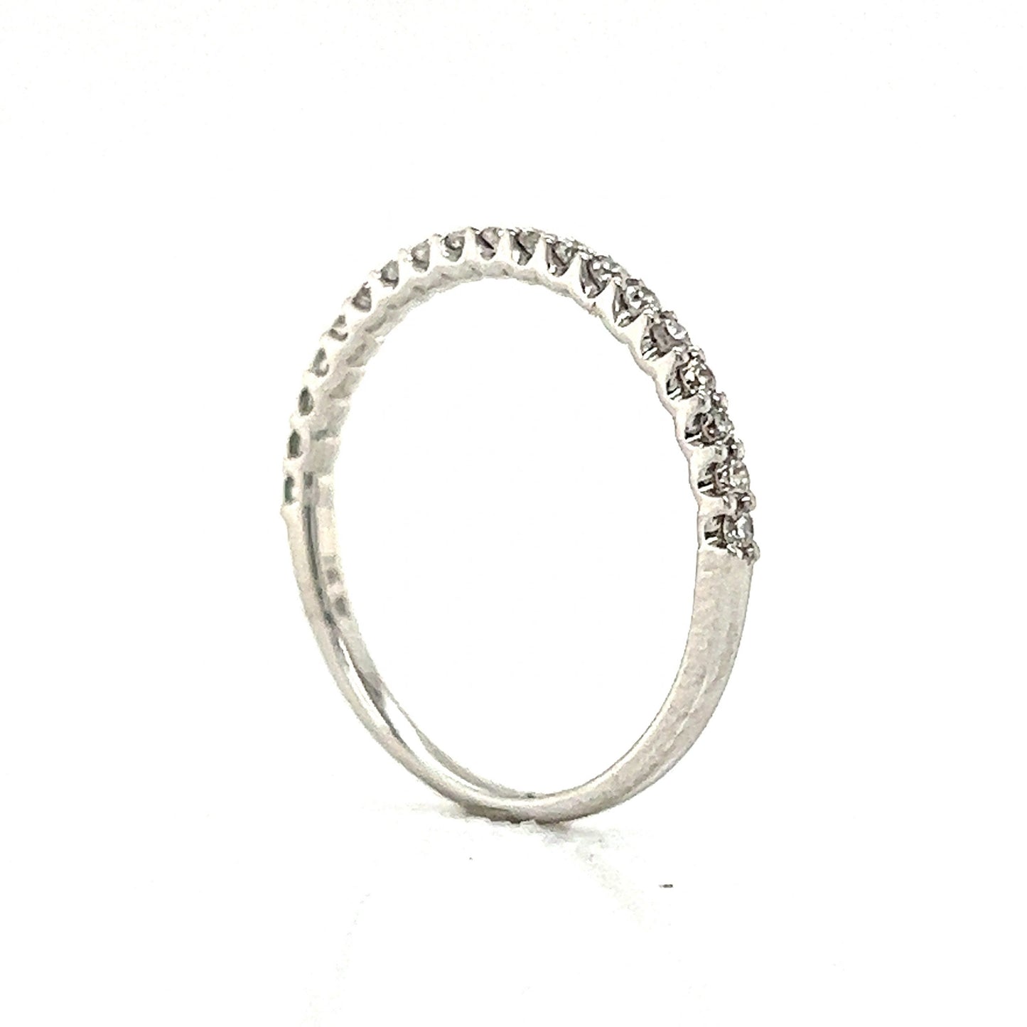 Sparkle shimmer! This modern diamond half-eternity wedding band features .23 total carats of Round Brilliant cut diamonds in 14 karat white gold. Nineteen (19) near colorless diamonds with an impressive clarity rating decorate the front half of the band. Set in shared prongs, the diamonds are highly brilliant and create a striking half-eternity design. Wear this ring as your wedding band or as a sparkling addition to a right hand stack. Dainty, stylish, and expertly designed.