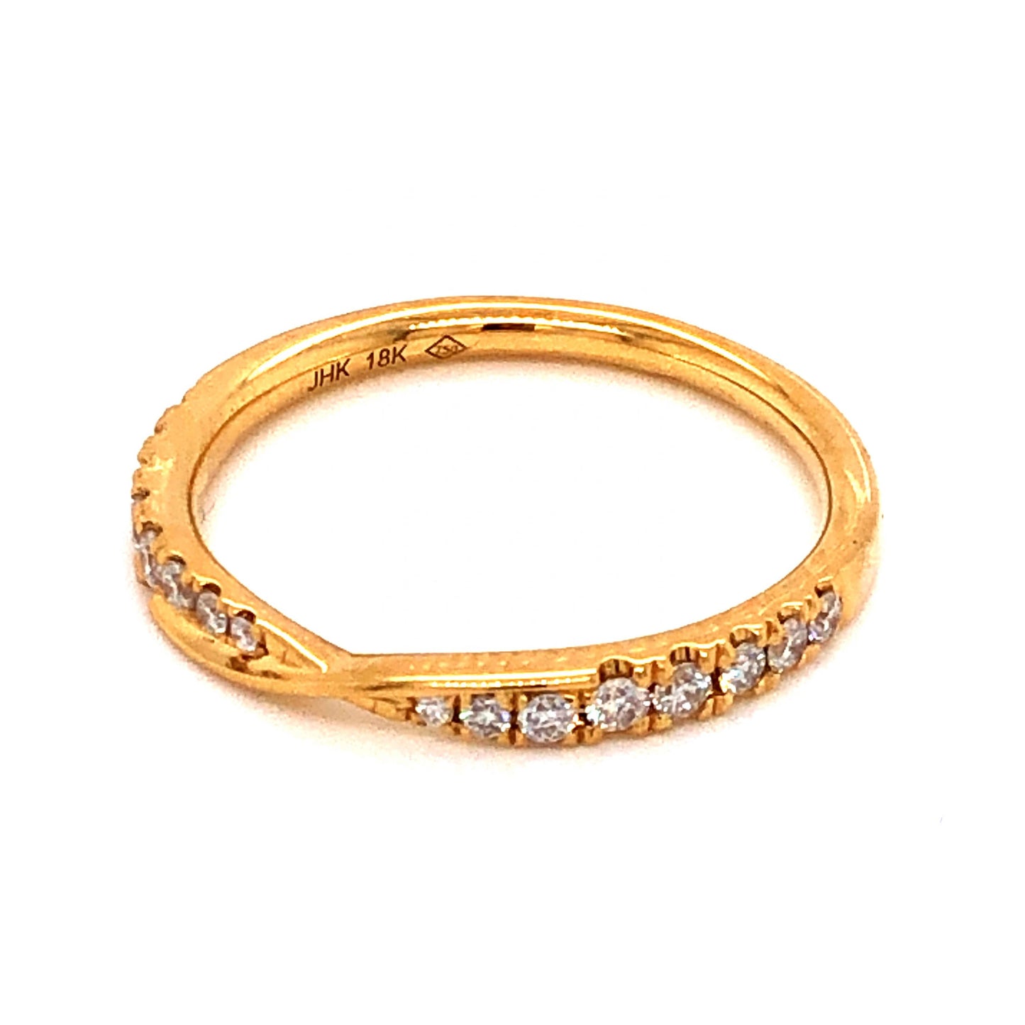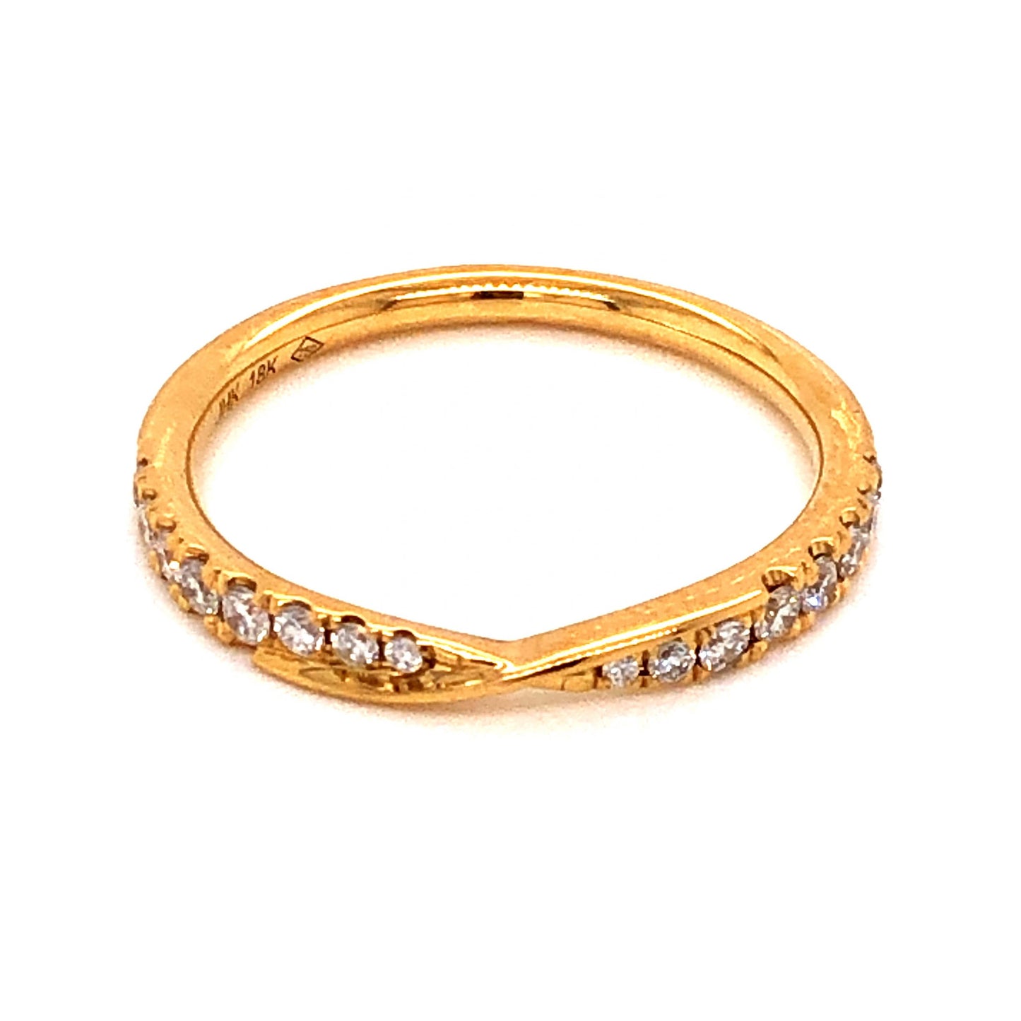 .23 Diamond Wedding Band in 18k Yellow Gold. This simple and elegant wedding band features .23 carats of sparkling diamonds finished in vibrant 18 karat yellow gold. Sixteen (16) .0143 carat near colorless diamonds are set on the front half of the contoured band. The diamonds are set in fishtail prongs and finished in high polished 18k yellow gold. This versatile diamond wedding band can also be worn as a modern stacking ring!