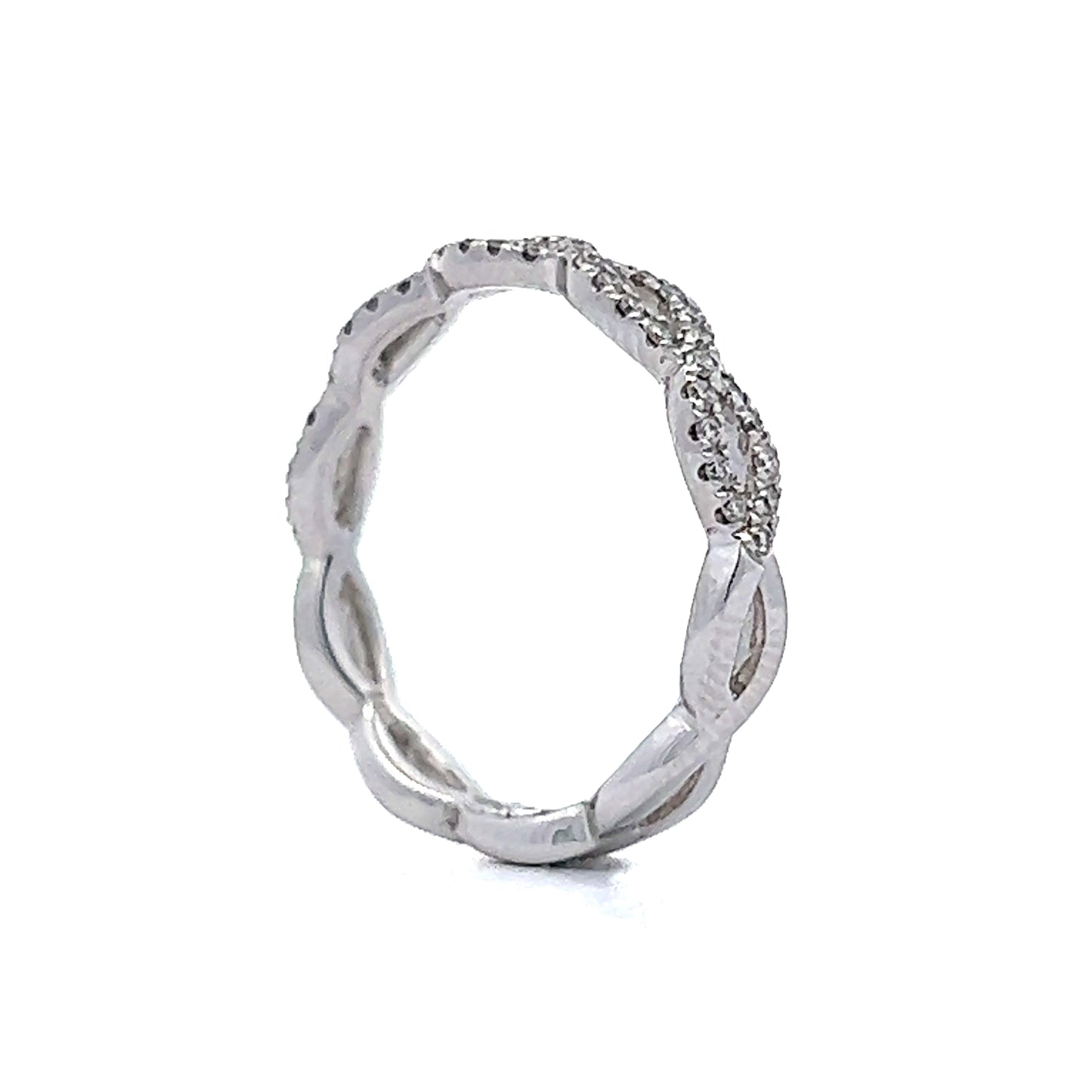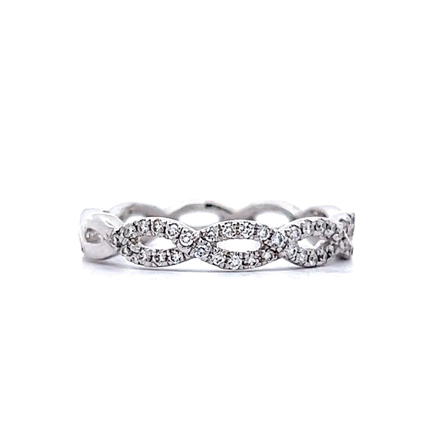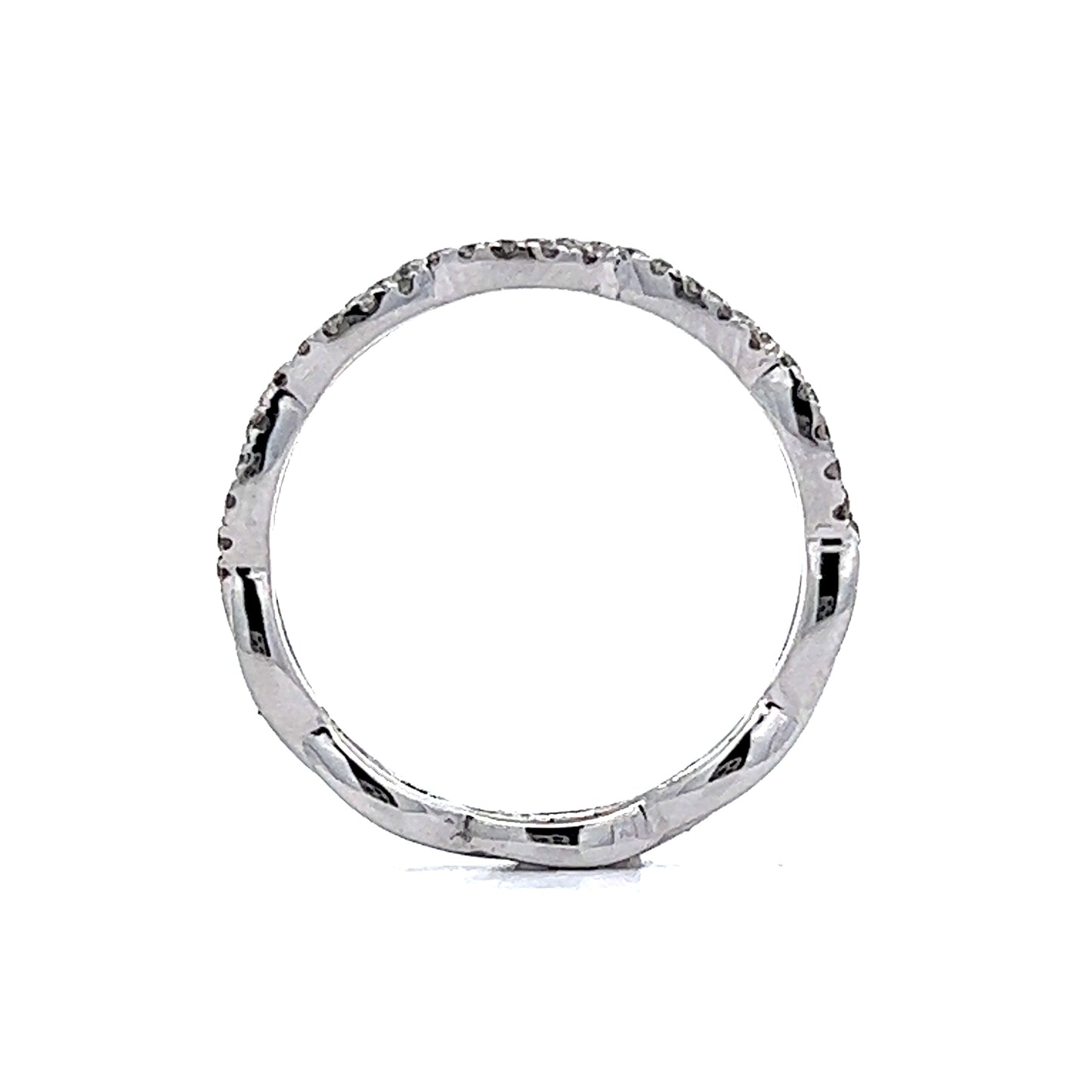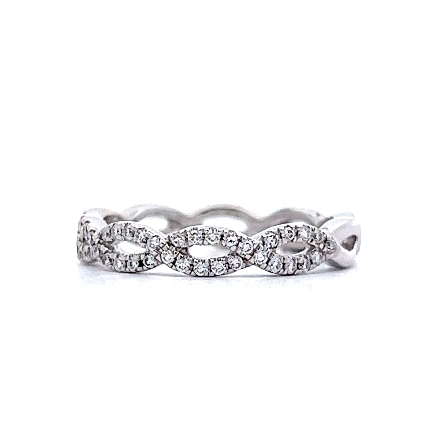 .23 Geometric Diamond Wedding Band in 14k White Gold. This iconic diamond wedding band features .23 carats of genuine natural diamonds on a spiral, 14k white gold band. The luminous band forms a helix pattern with open eyelets and diamonds that cover the front half of the shank. Set it glittering 14k white gold, you can ensure this durable wedding band will be the perfect ring for your wedding day!