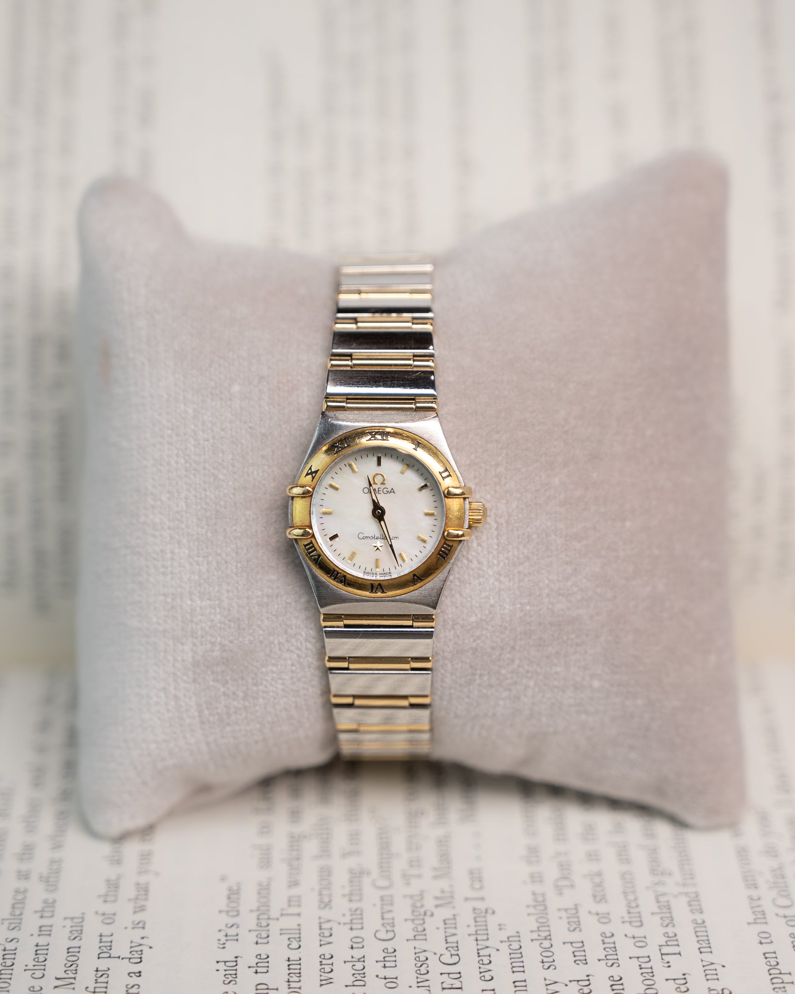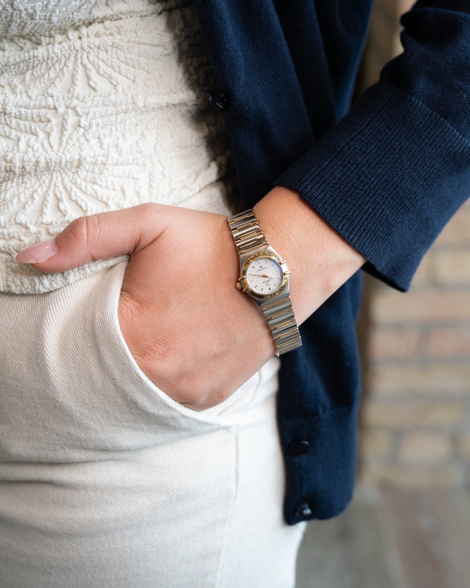 The Omega Constellation Ladies Watch features a two-tone design combining stainless steel and 18 karat yellow gold, with a 23mm case size. The mother of pearl dial shifts colors as light hits it from different angles. This model, Reference 795.1203, was serviced on 5.29.2025. The watch blends the durability of stainless steel with the richness of gold in its construction.