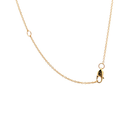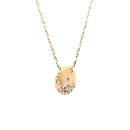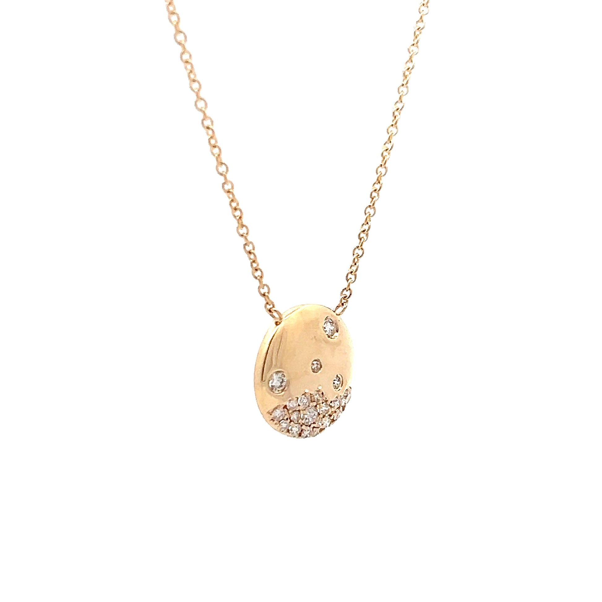 This 14 karat yellow gold pendant necklace features an asymmetrical diamond disc design with 20 round brilliant cut diamonds. The diamonds, each measuring 1.4mm and totaling .24 carats, are flush set for a smooth and seamless look. The pendant hangs from a delicate chain, making it an easy piece to wear every day. Whether worn alone or layered with other favorites, this necklace adds a subtle sparkle with a modern edge.