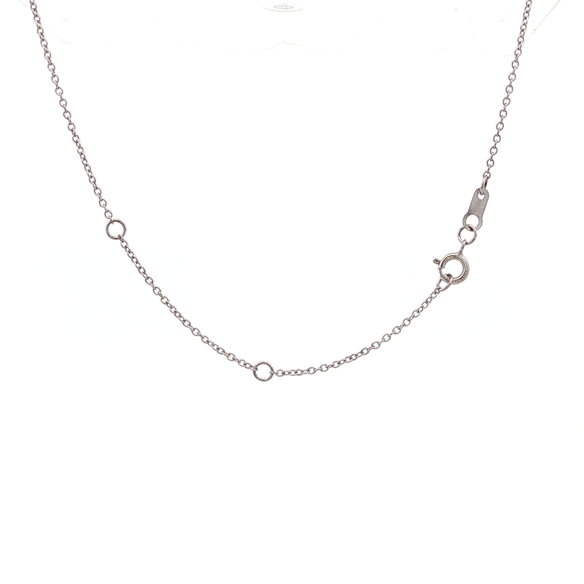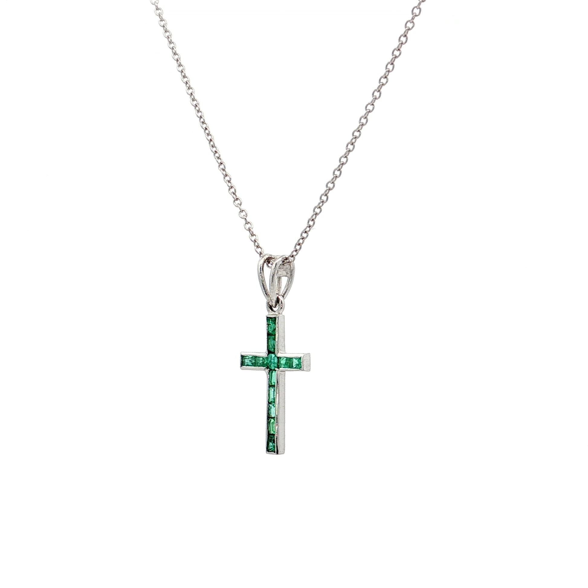 This cross pendant necklace features 12 baguette cut emeralds totaling .24 carats, each measuring 2.00 x 1.50mm and channel set in 14 karat white gold. The cross pendant hangs from an adjustable 16-18 inch chain made from matching white gold. The channel setting creates a smooth, continuous line of emeralds across the cross design.