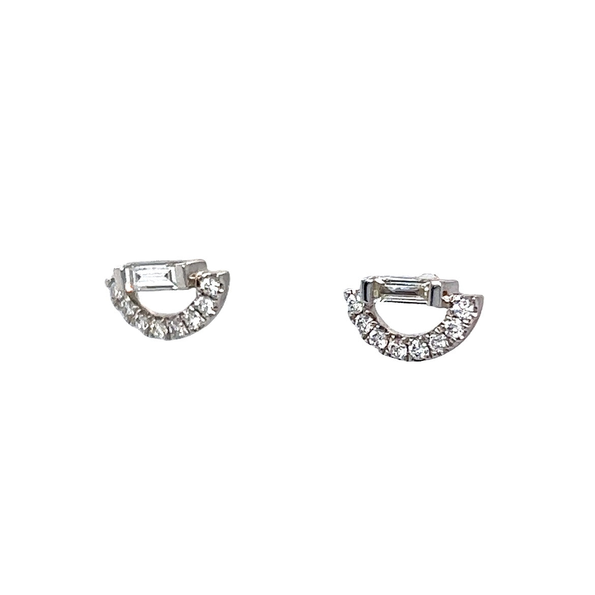 .24 Half-Round Diamond Earring Studs in 18k White Gold. These petite and sparkling stud earrings feature .24 carats of diamonds finished in 18 karat white gold. Two (2) .065 carat baguettes and sixteen (16) .0068 carat diamonds create two half round shapes on each stud backing. The baguettes are set in channel bars and the round diamonds are set in shared prongs.