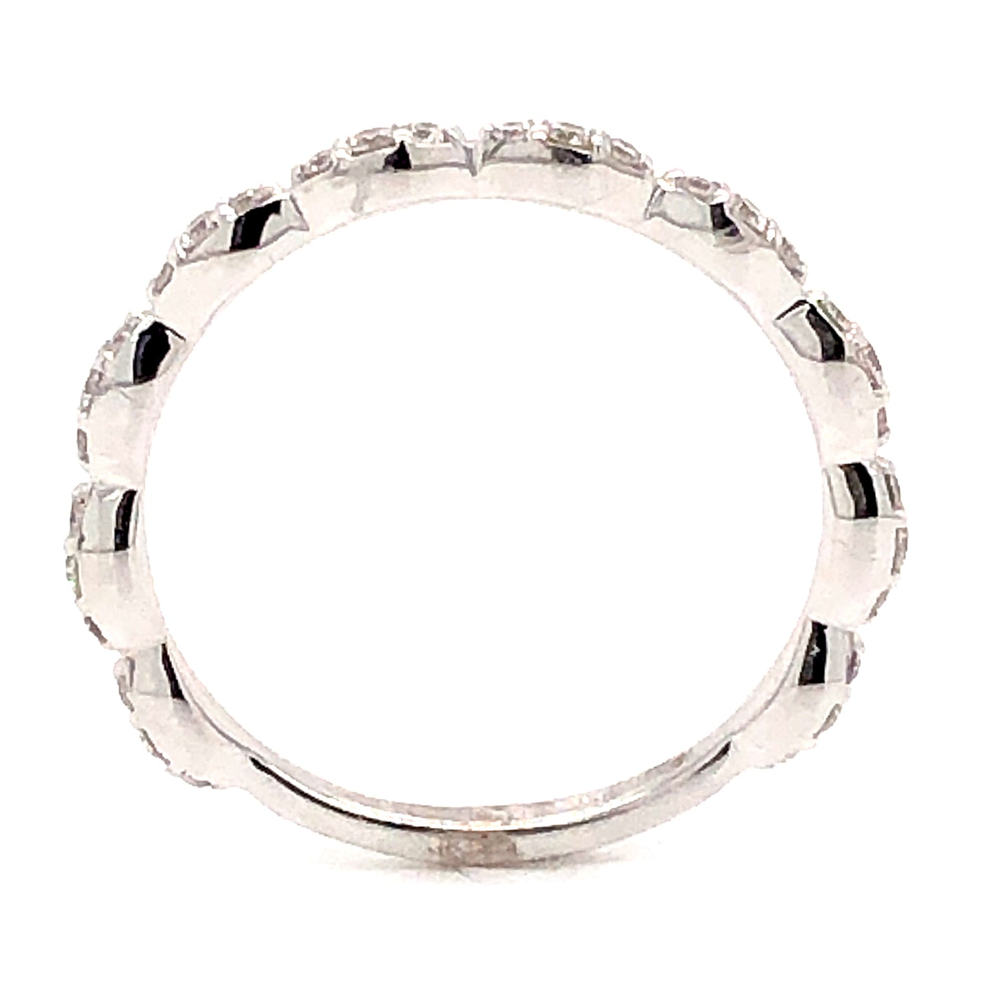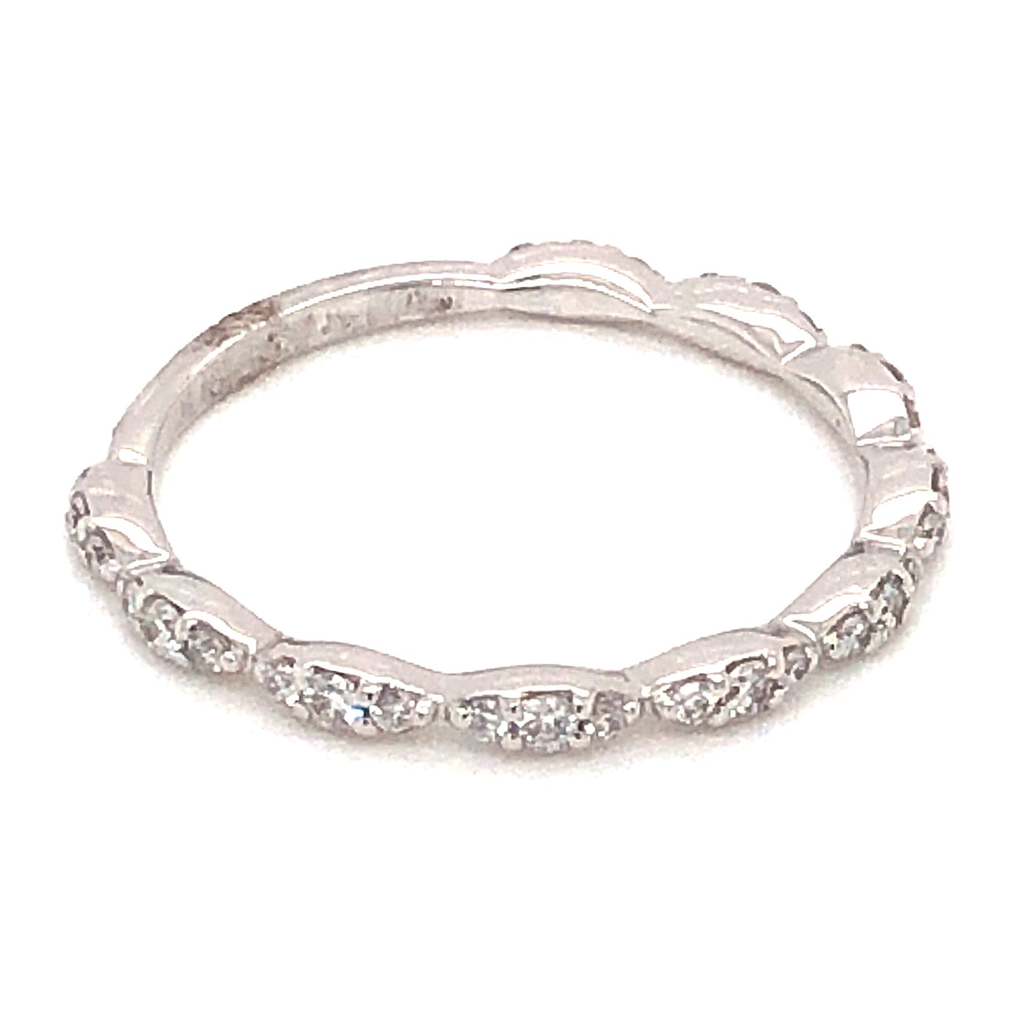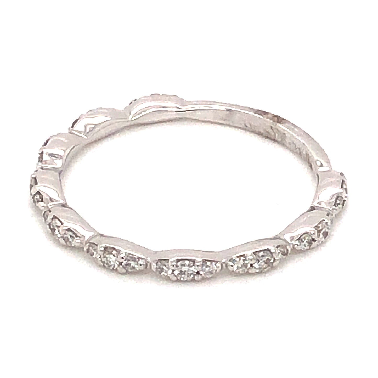 .24 Marquise Shape Diamond Wedding Band in 14k White Gold. This modern wedding band features .24 carats of sparkling diamonds in a repeating marquise shape mounting of 14 karat white gold. Ten (10) .015 carat and twenty (20) .0045 carat diamonds are mounted in a sleek pattern. The diamonds are collectively brilliant against the shimmering white gold band. This ring will add sparkle and dimension to any engagement ring or can be worn as an everyday stacking band.