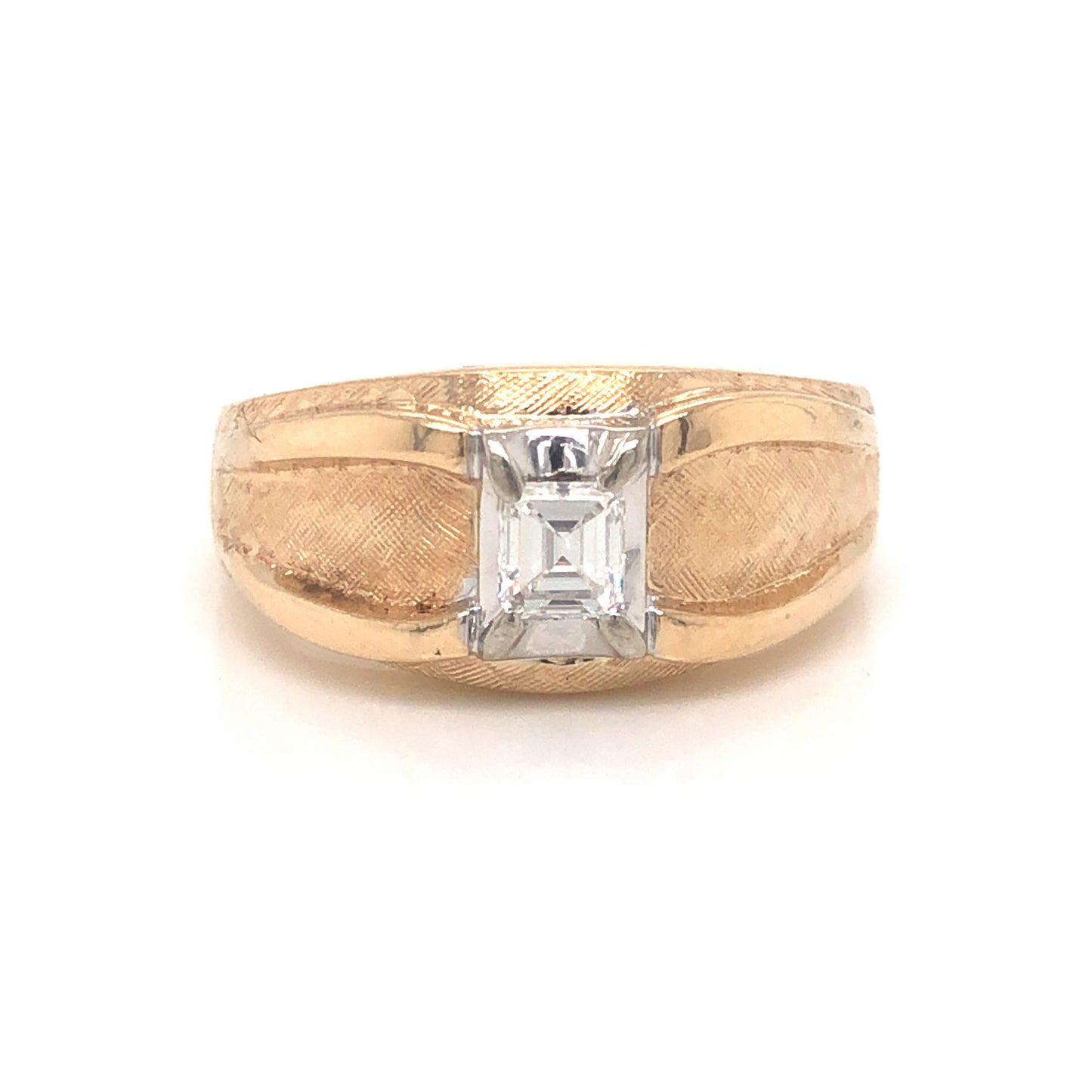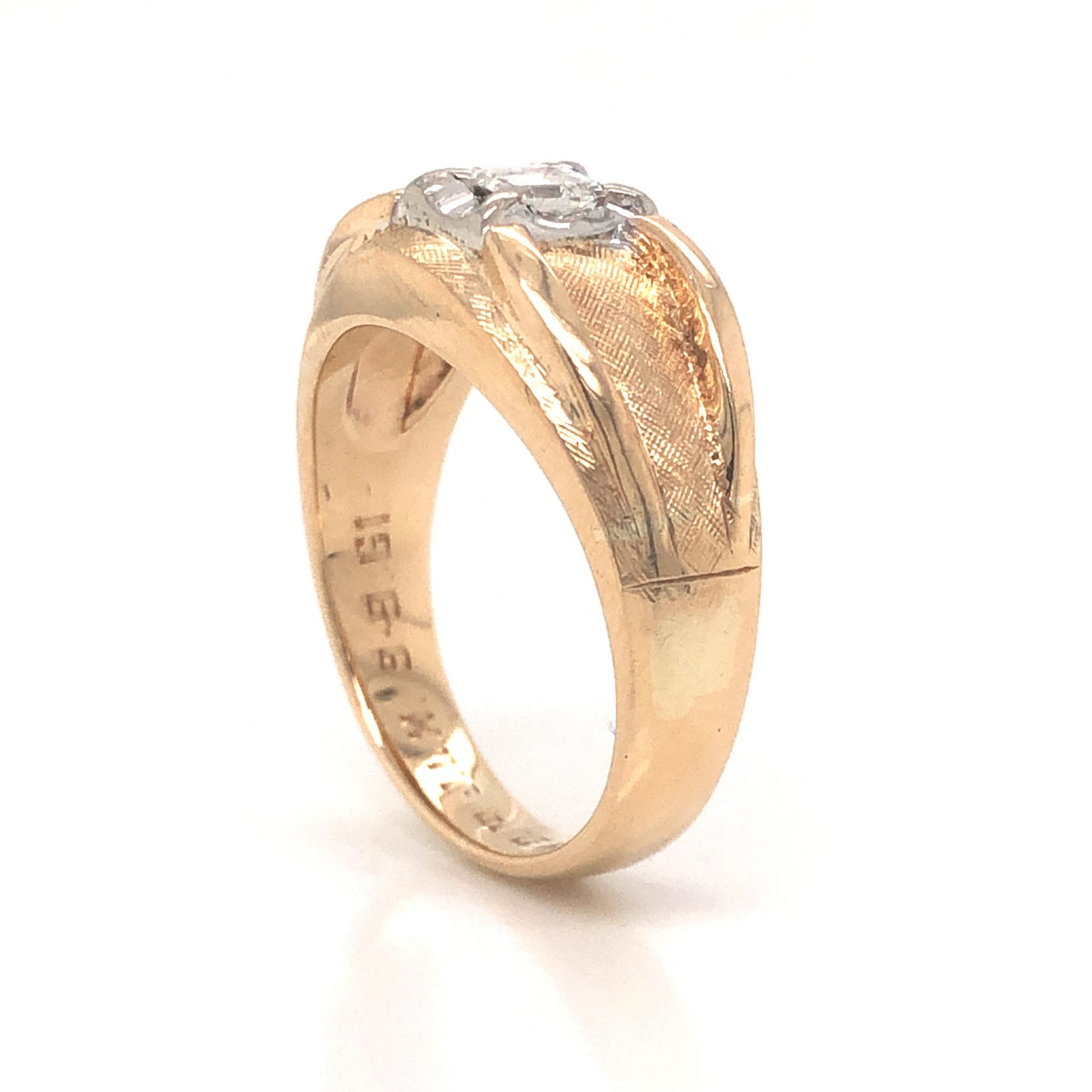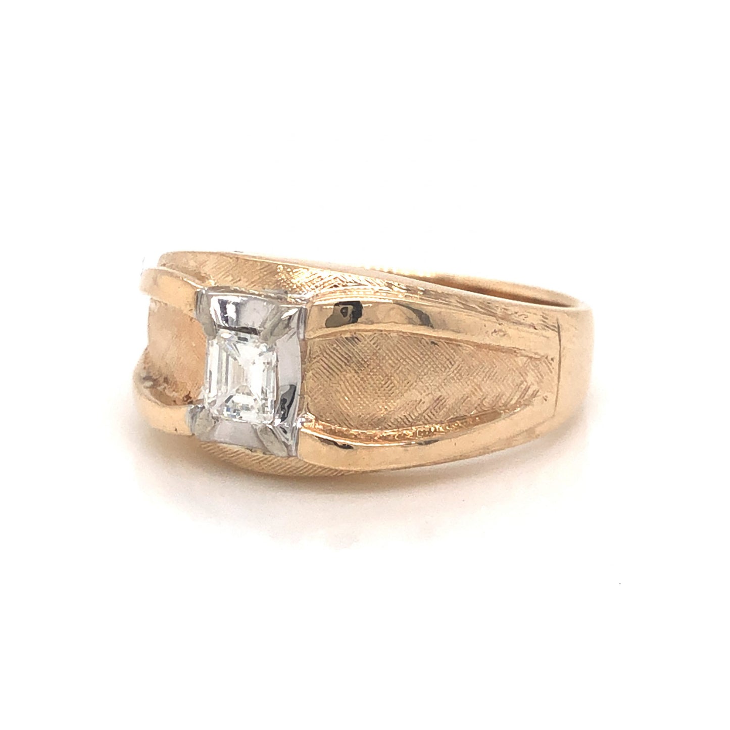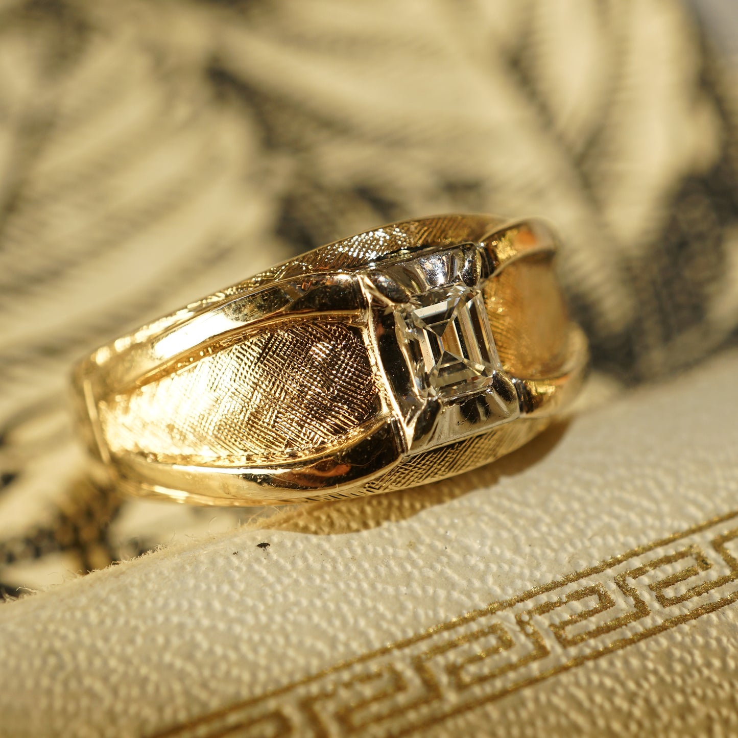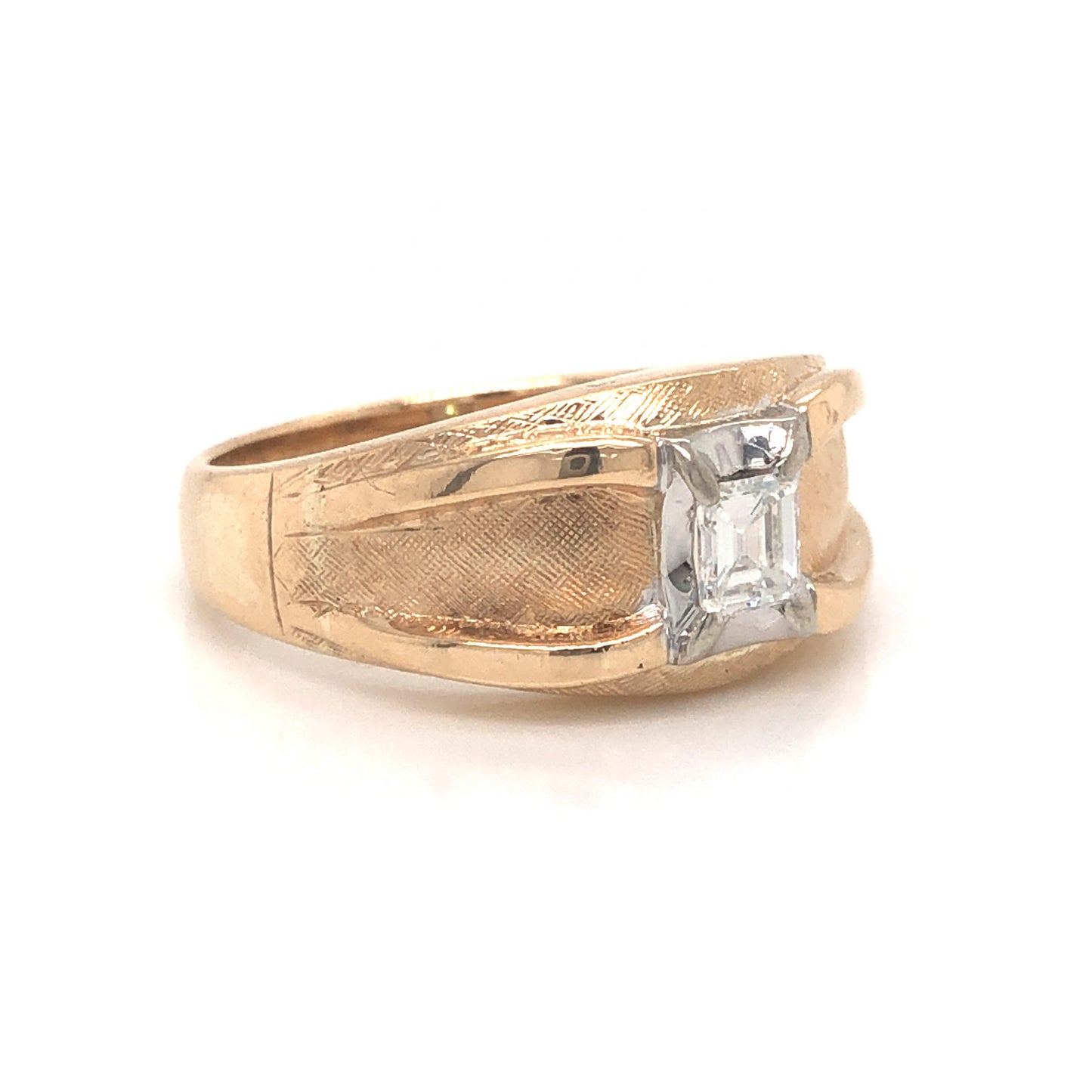 .24 Mid-Century Emerald Cut Diamond Ring in 14k Yellow Gold. This dynamic Mid-Century ring features a .24 carat emerald cut diamond on a 14K yellow gold band. The diamond is set in a square illusion mounting of 14 karat white gold. With its bold facets, the near colorless diamond shines bright against the white gold setting. The shank of the ring is made of 14 karat yellow gold and features a mixture of brushed and polished engravings. This two-toned diamond cocktail ring is a relic of the Mid-Century era you definitely need in your jewelry collection.