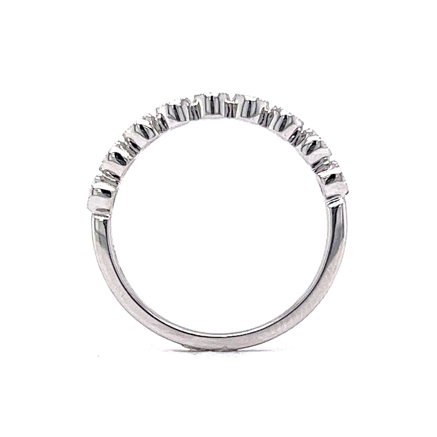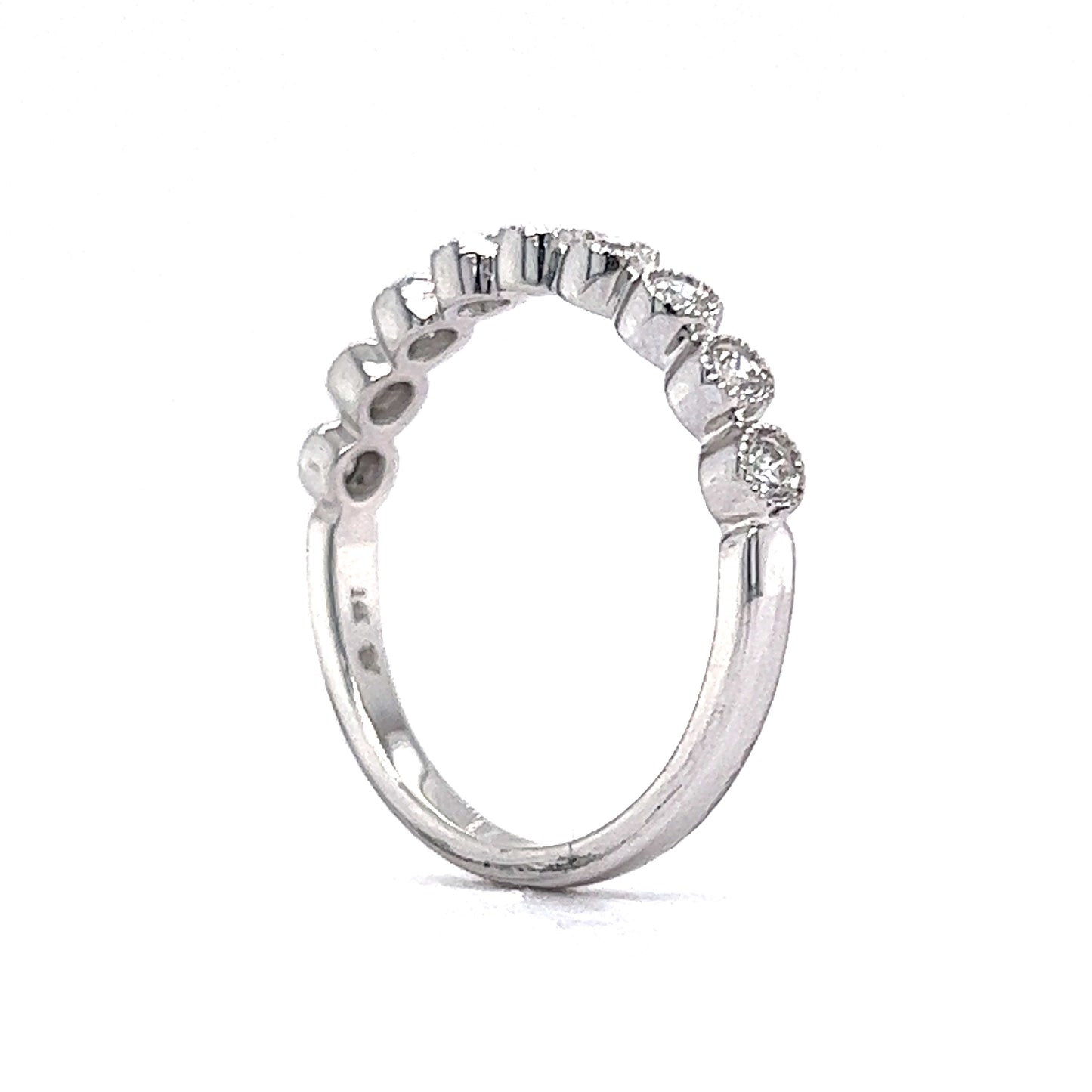 This bezel set diamond wedding band features fine milgrain engravings and .24 carats of diamonds finished in polished 14k white gold. Nine (9) .026 carat diamonds are securely set in half-eternity style. With a bright color rating and eye clean clarity, this wedding band is the perfect choice to wear with most styles of engagement rings or can be worn on the right hand in a stack.