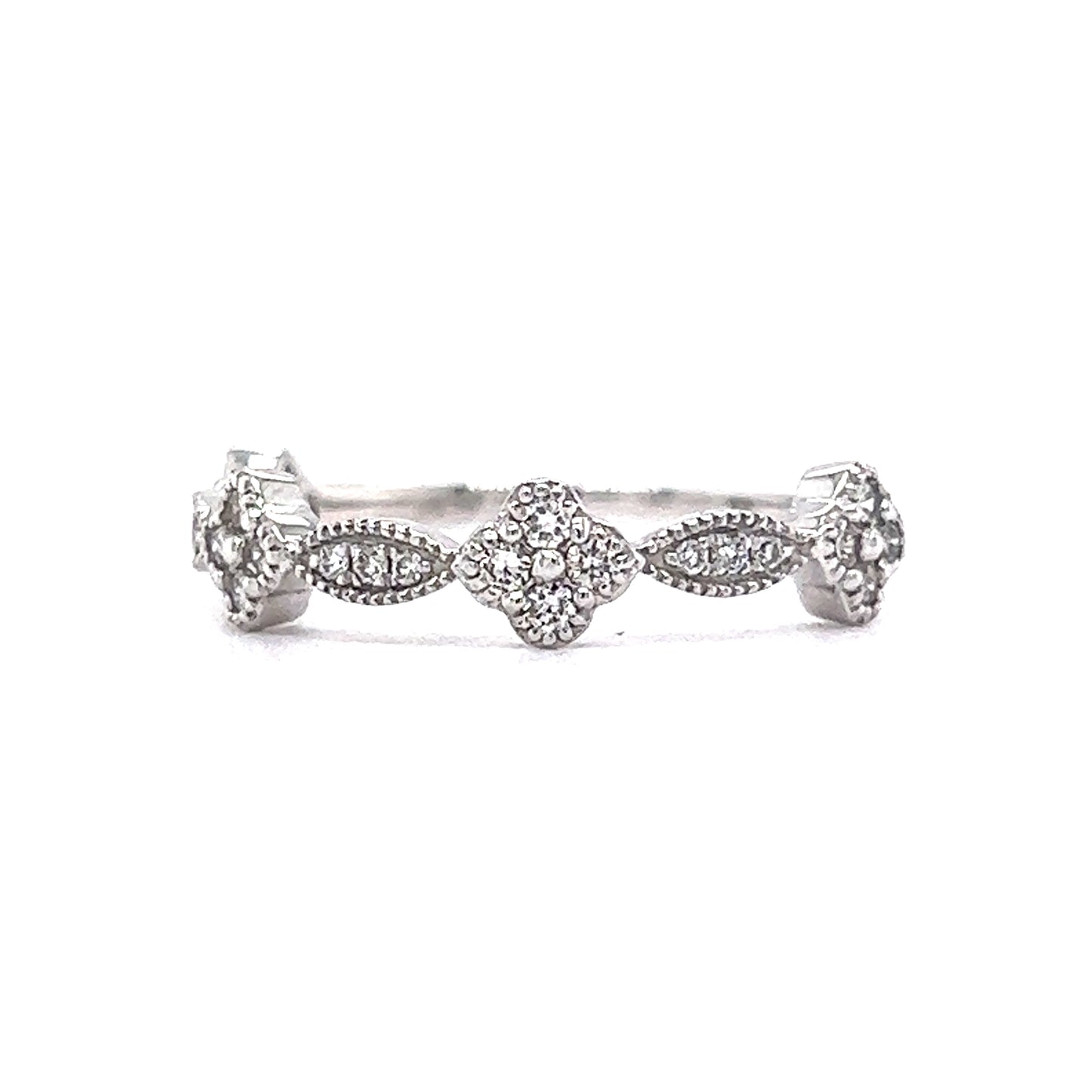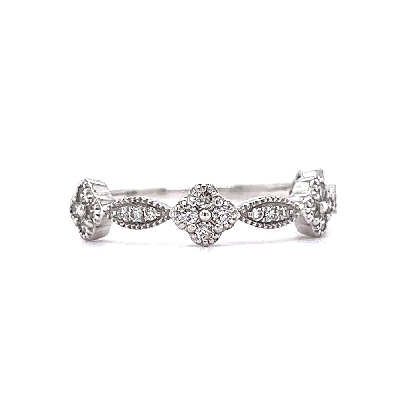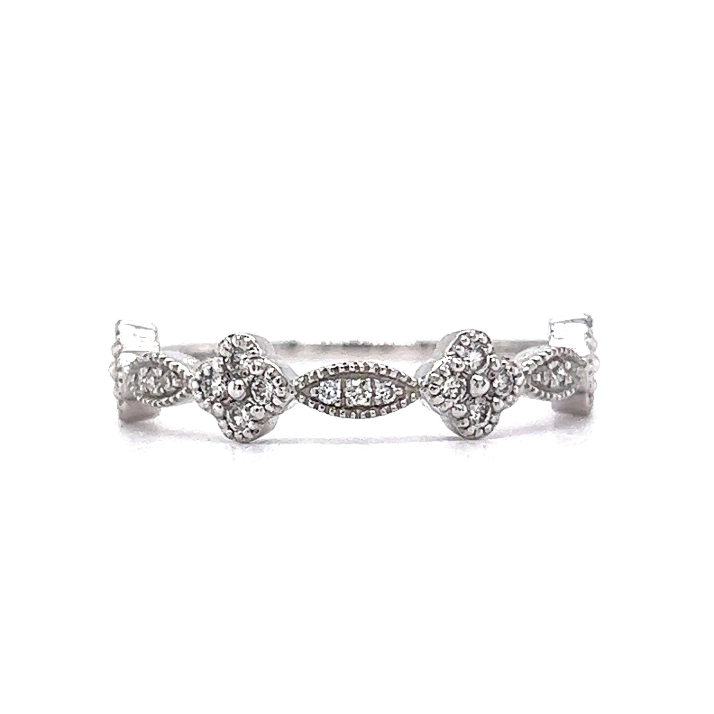This milgrain wedding band features .24 carats of diamonds in shimmering 14 karat white gold. Set with beads in rounded flower and marquise stations, twenty-five (25) .0096 carat diamonds decorate the band in a half-eternity style. Finished in polished 14k white gold, this wedding band will look lovely stacked against any style of engagement ring.