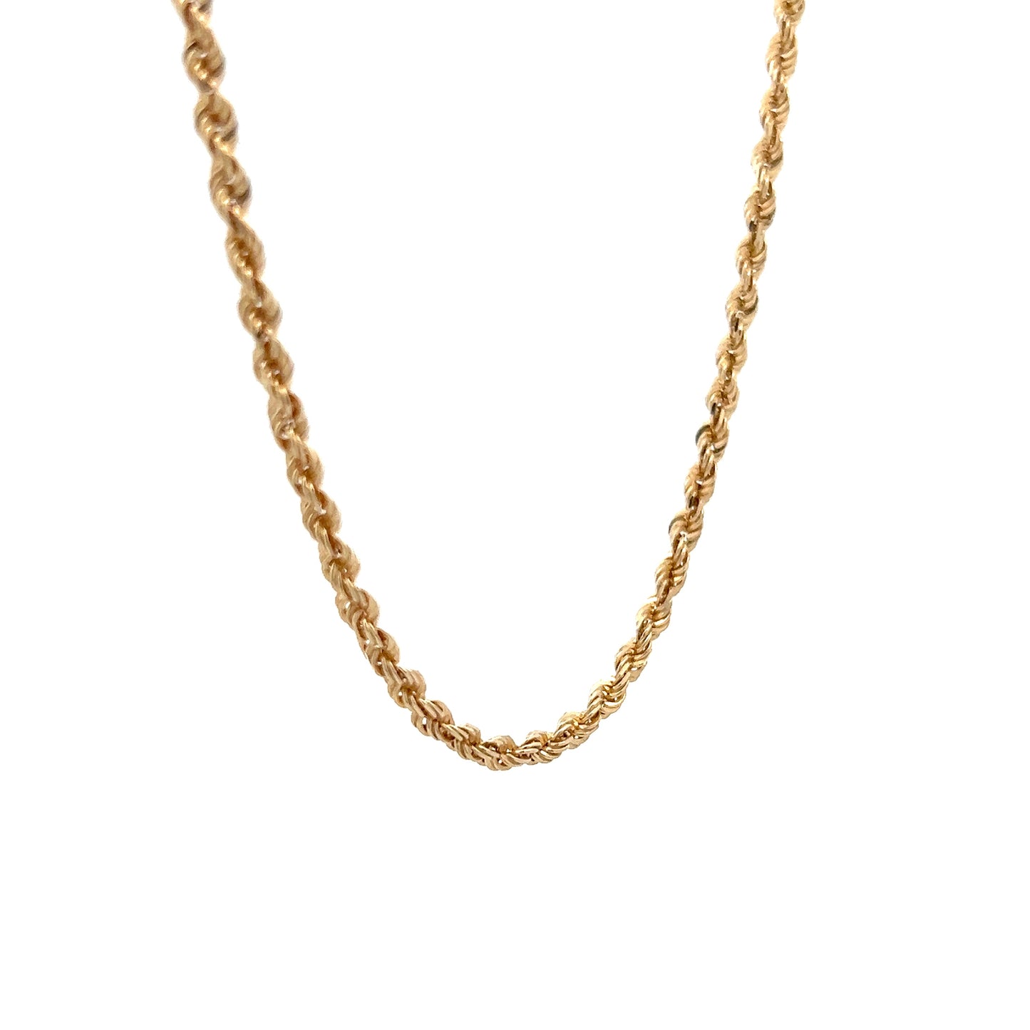 This rope-style necklace is made from 14 karat yellow gold with a diamond-cut finish that reflects light. The chain measures 24 inches long and 1.9 mm wide, creating a noticeable but not bulky look. The rope design twists the gold links together in a pattern that resembles an actual rope, giving it more texture than a standard chain. The yellow gold material creates a golden-colored chain that works for both men and women. The 24-inch length makes this chain long enough to go past the chest, allowing it to be worn over clothing or layered with other necklaces.
