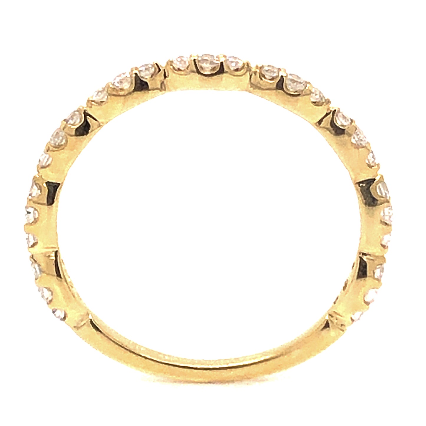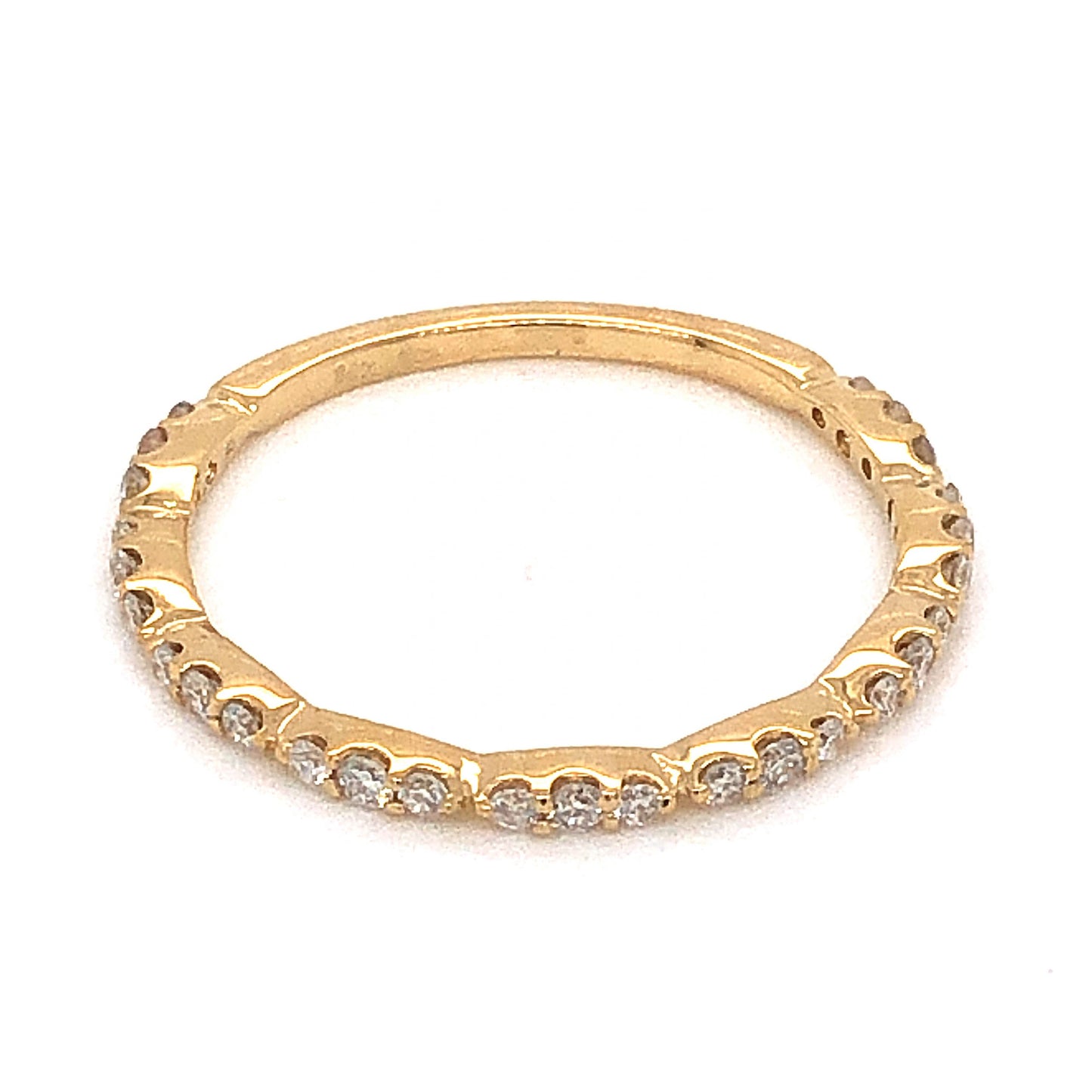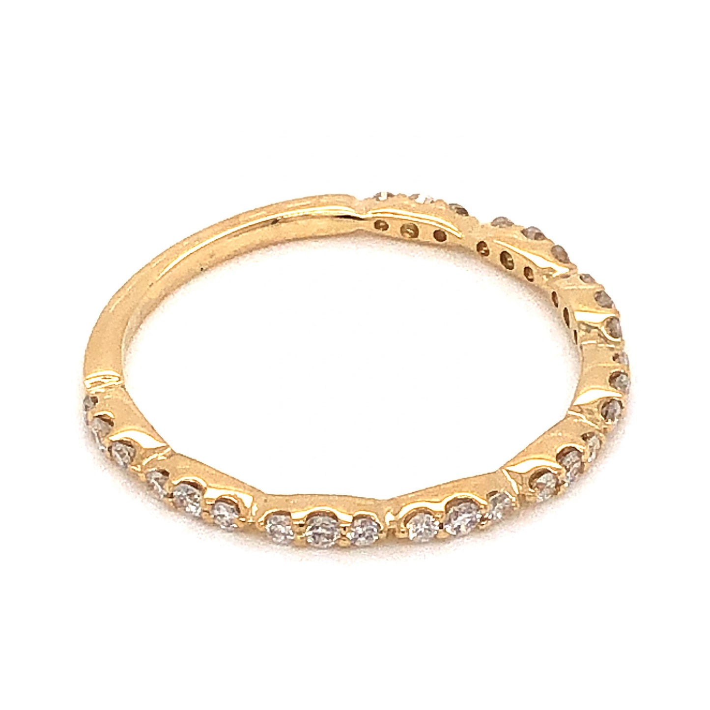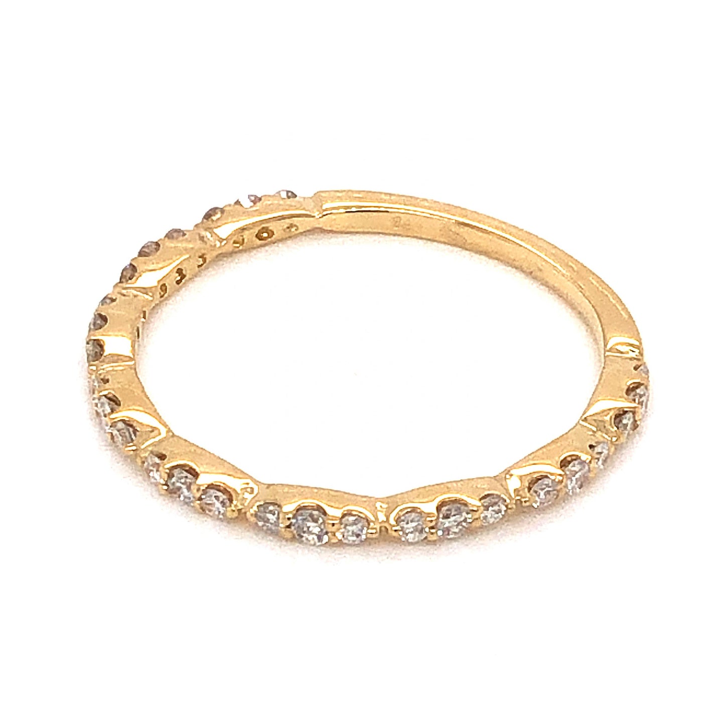 .24 Thin Half-Eternity Diamond Wedding Band in 14k Yellow Gold. This elegant and simple diamond wedding band features .24 carats of sparkling diamonds finished in 14 karat yellow gold. Twenty-seven (27) .008 carat petite diamonds create a half eternity style on warm yellow gold. This modern wedding band is textural and stylish, and will pair beautifully next to any solitaire engagement ring!