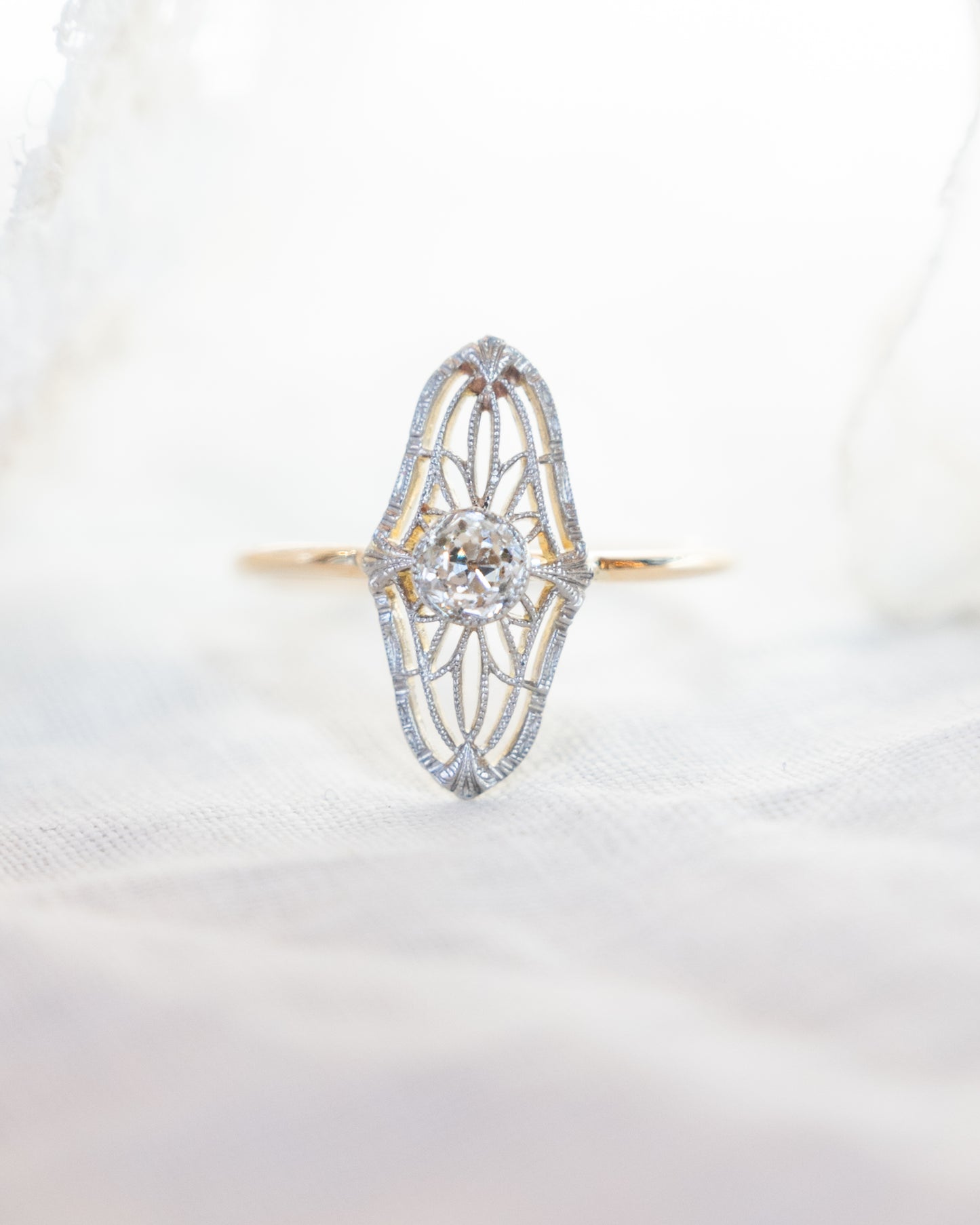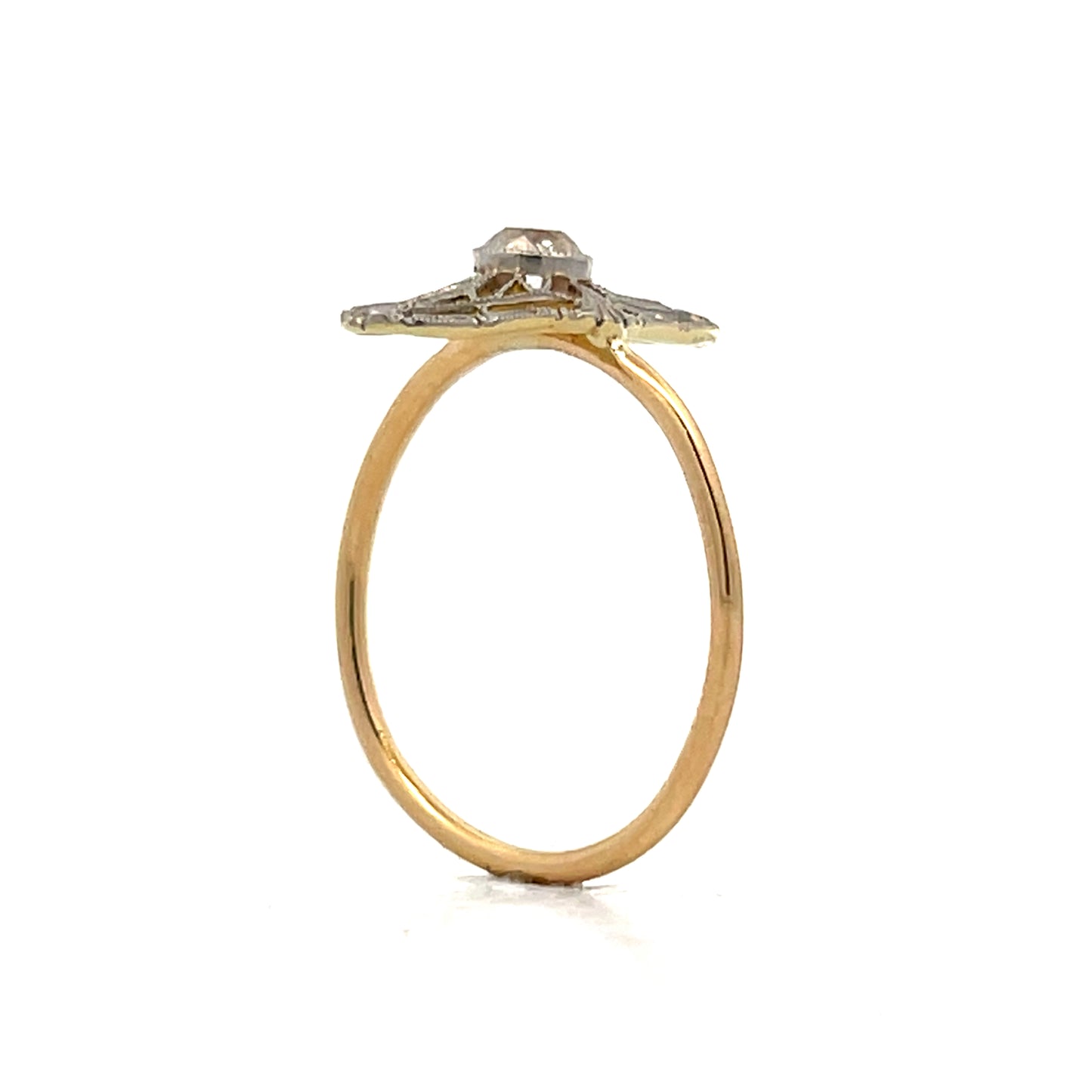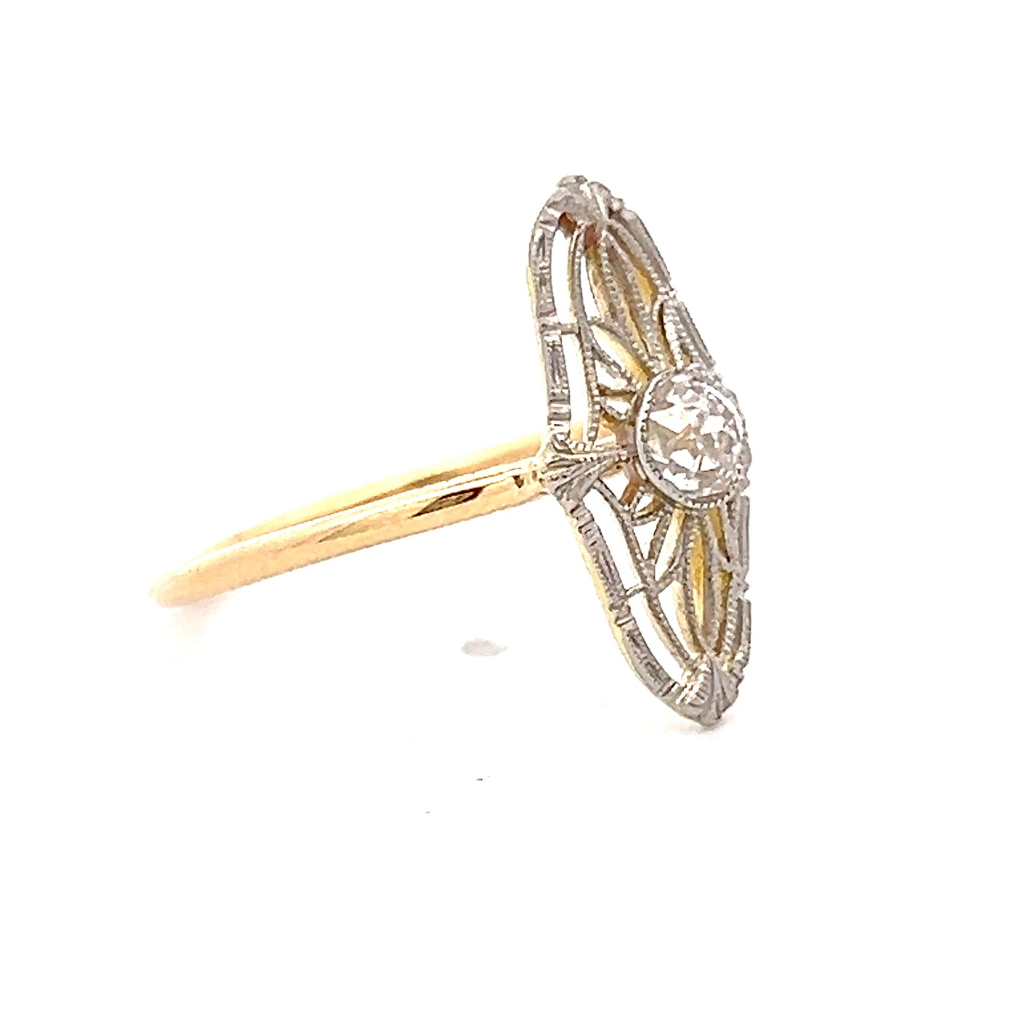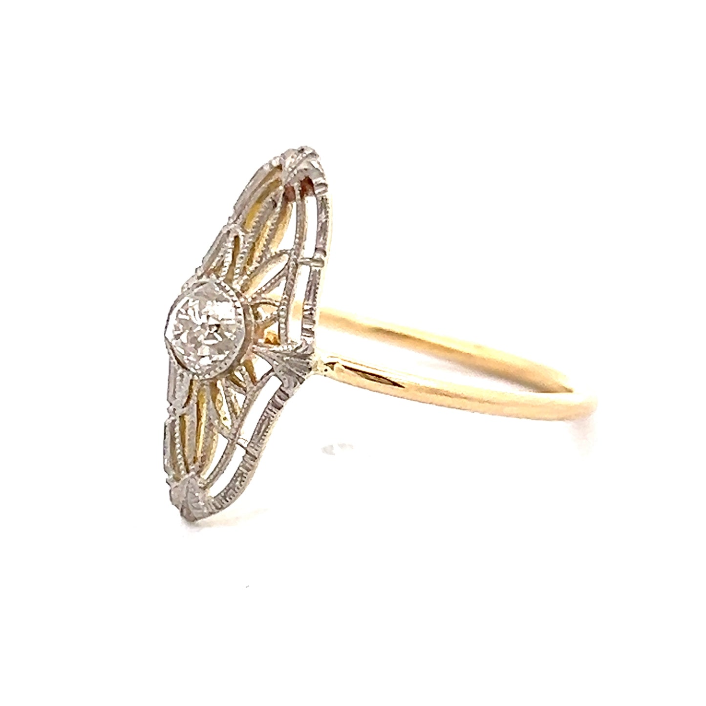 This cocktail ring is converted from an antique stick pin and features milgrain filigree detailing with a two-tone metal design. Made from both 14 karat yellow gold and 14 karat white gold, it creates visual interest through the contrast of metal colors. The center stone is a .25 carat Old European cut diamond with I1 clarity and H color grade, secured in a bezel setting. The ring has a navette (elongated oval) shape typical of Art Deco jewelry from the 1920s and early 1930s.