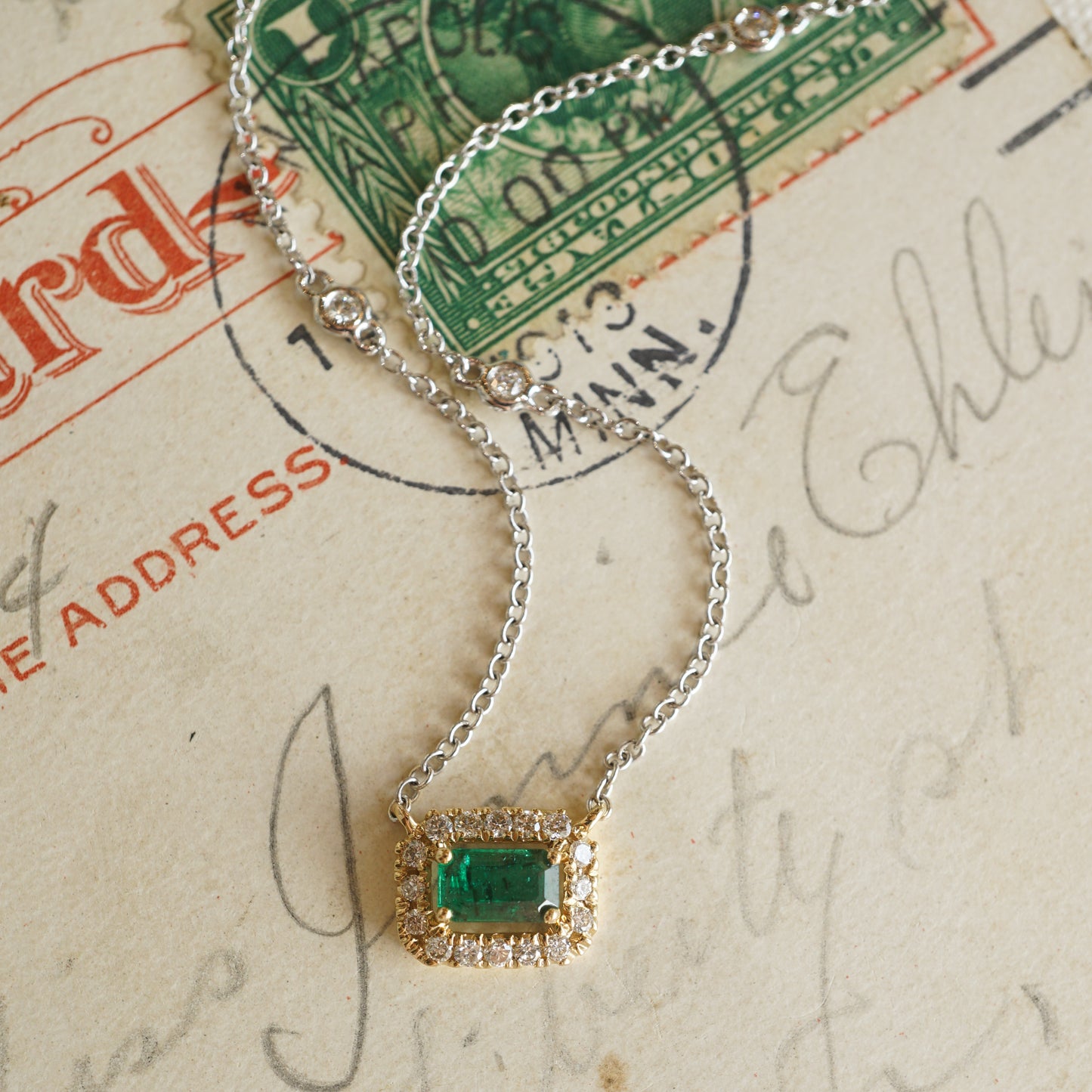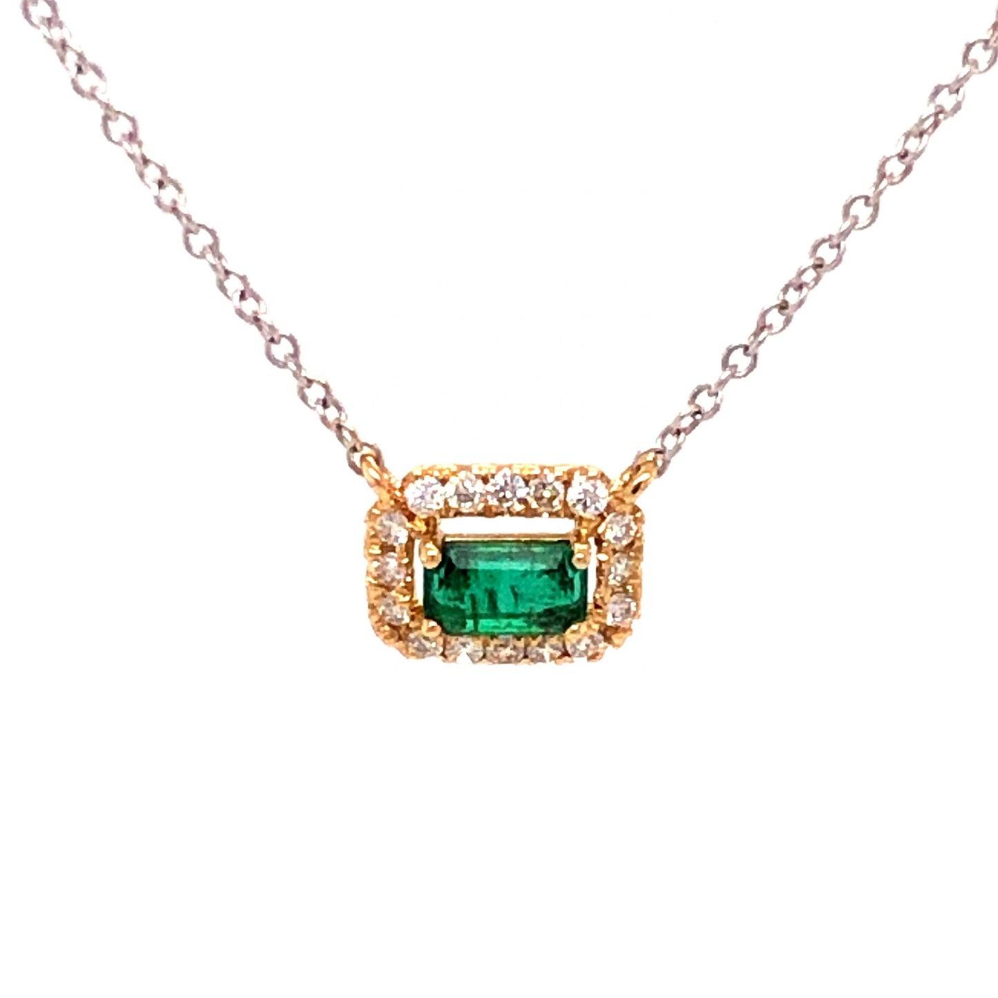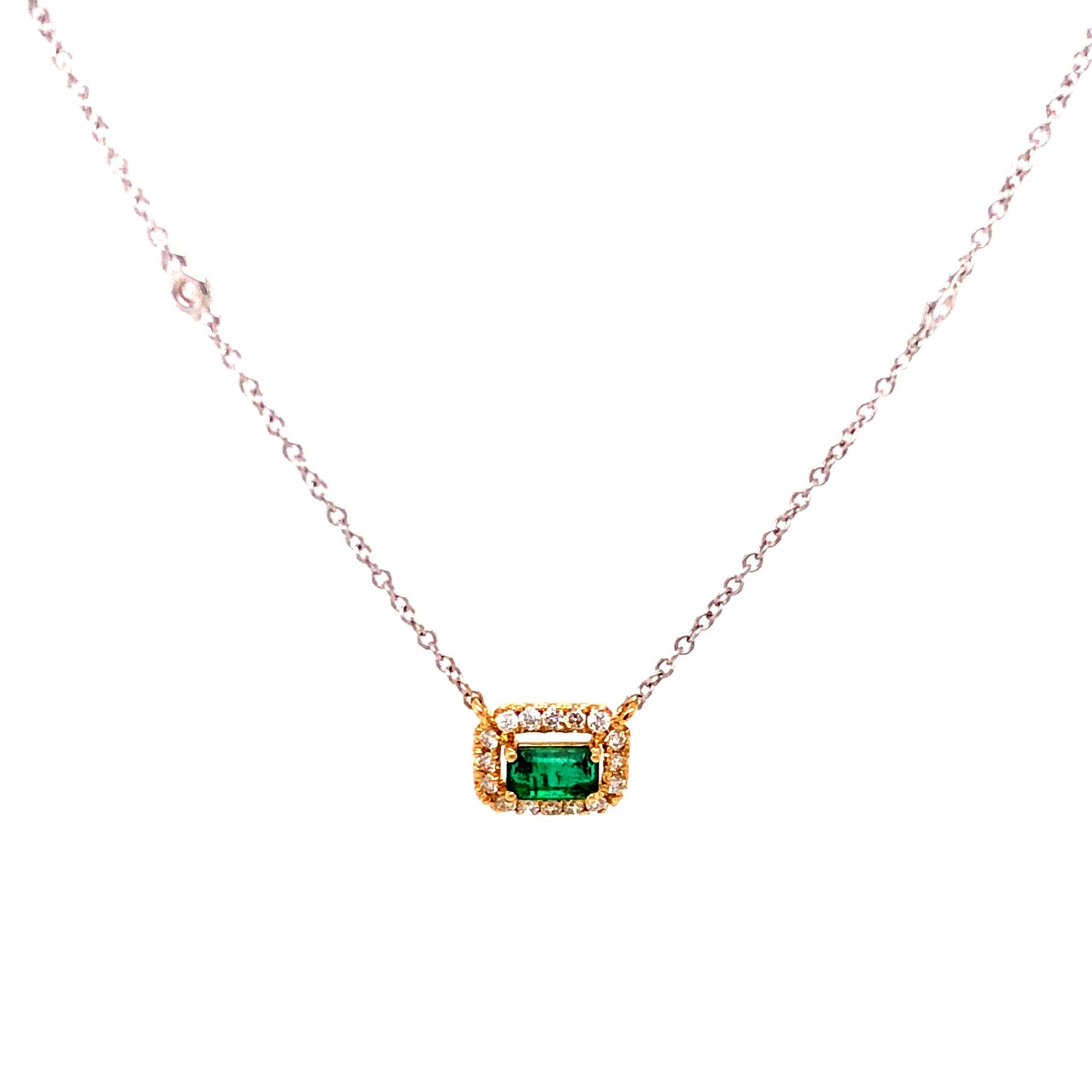 .25 Emerald Diamond Necklace in 18k Yellow White Gold. This modern 18” necklace features a .25 carat emerald and .15 carats of diamonds finished in 18 karat yellow gold on an 18 karat white gold chain. The center stone is emerald cut and has a dark, minty green hue. The primary emerald is prong set and floats in the center of a halo of diamonds. Twenty (20) .0075 carat near colorless diamonds sparkle with elegance and are set in warm, 18k yellow gold. Finished on a classic, 18k white gold chain, this romantic pendant necklace is fashionable, lightweight, and ready to be yours!