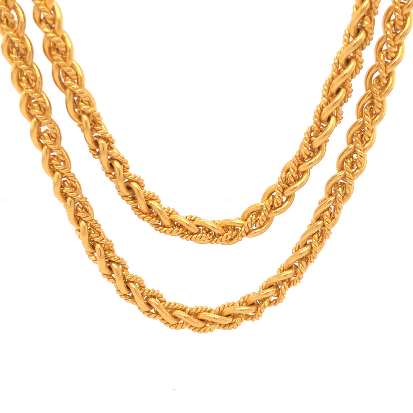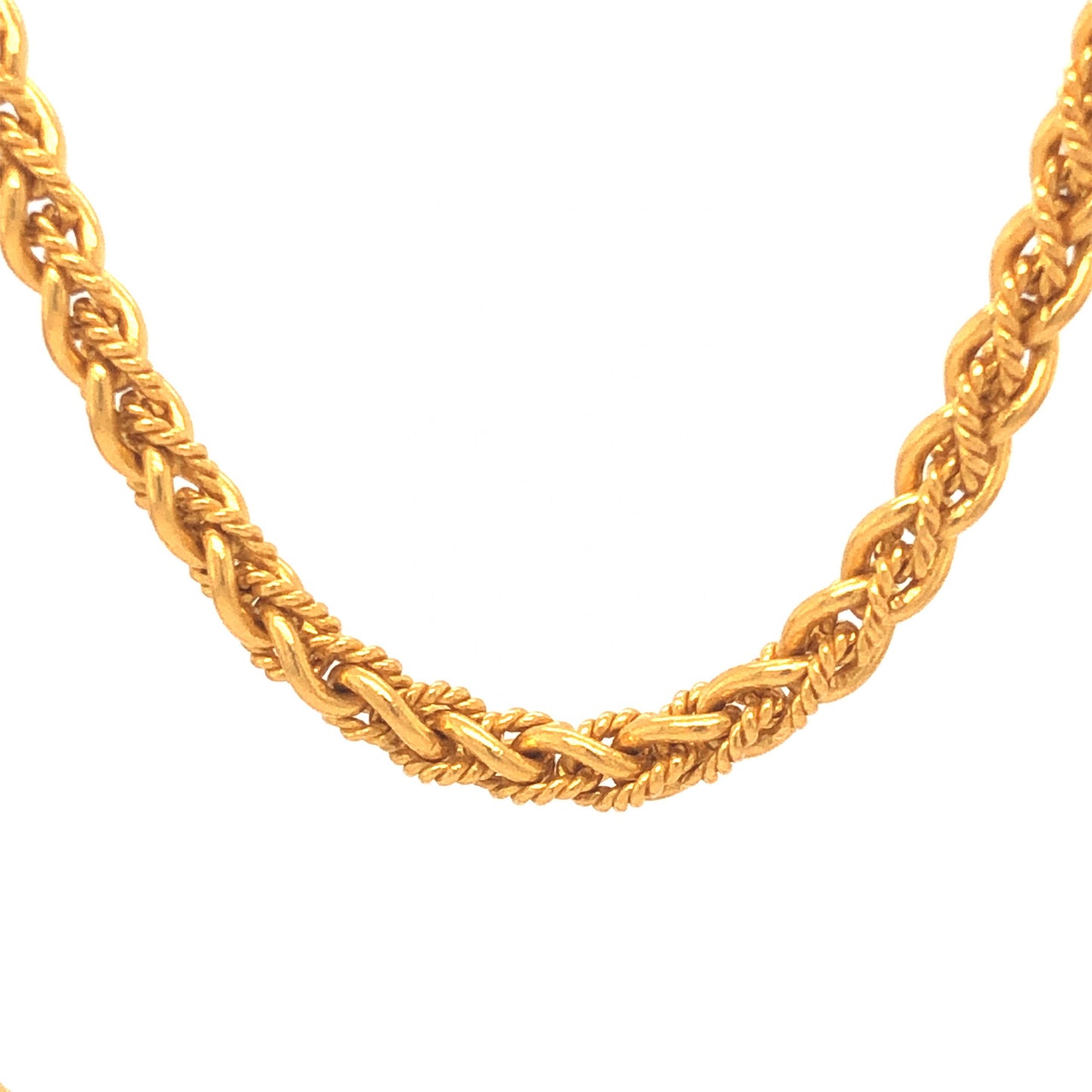 25 Inch Chain Necklace in 24k Yellow Gold. This vibrant 25” necklace features thick links and braided rope detailing in polished 24 karat yellow gold. A fashionable take on a rope-meets-mariner chain, this necklace is perfect to wrap and layer for a warm, modern look.