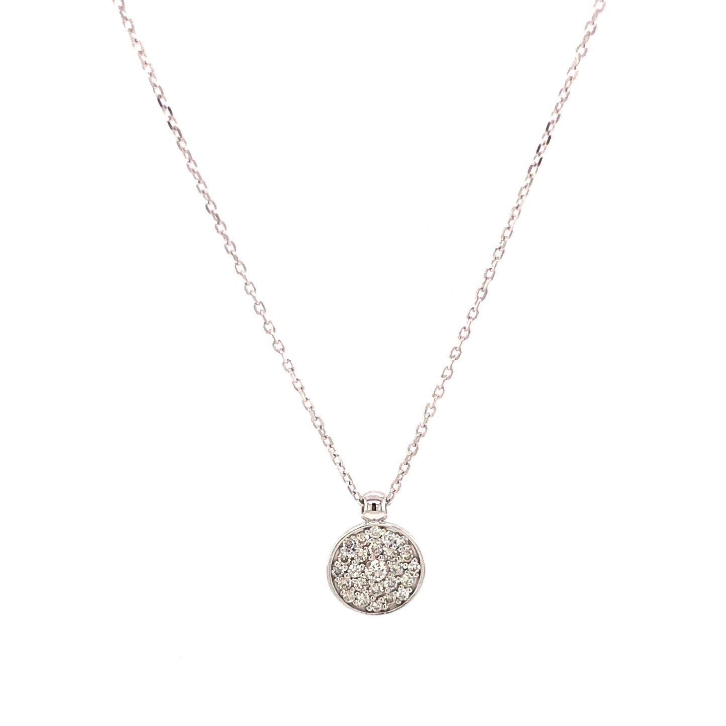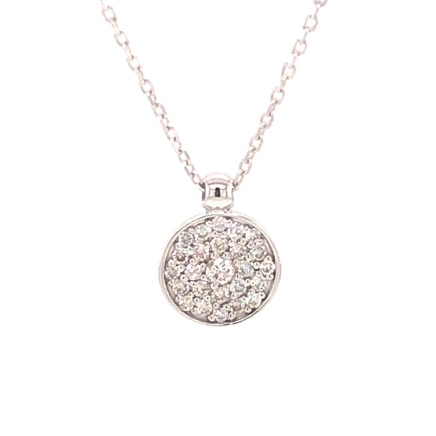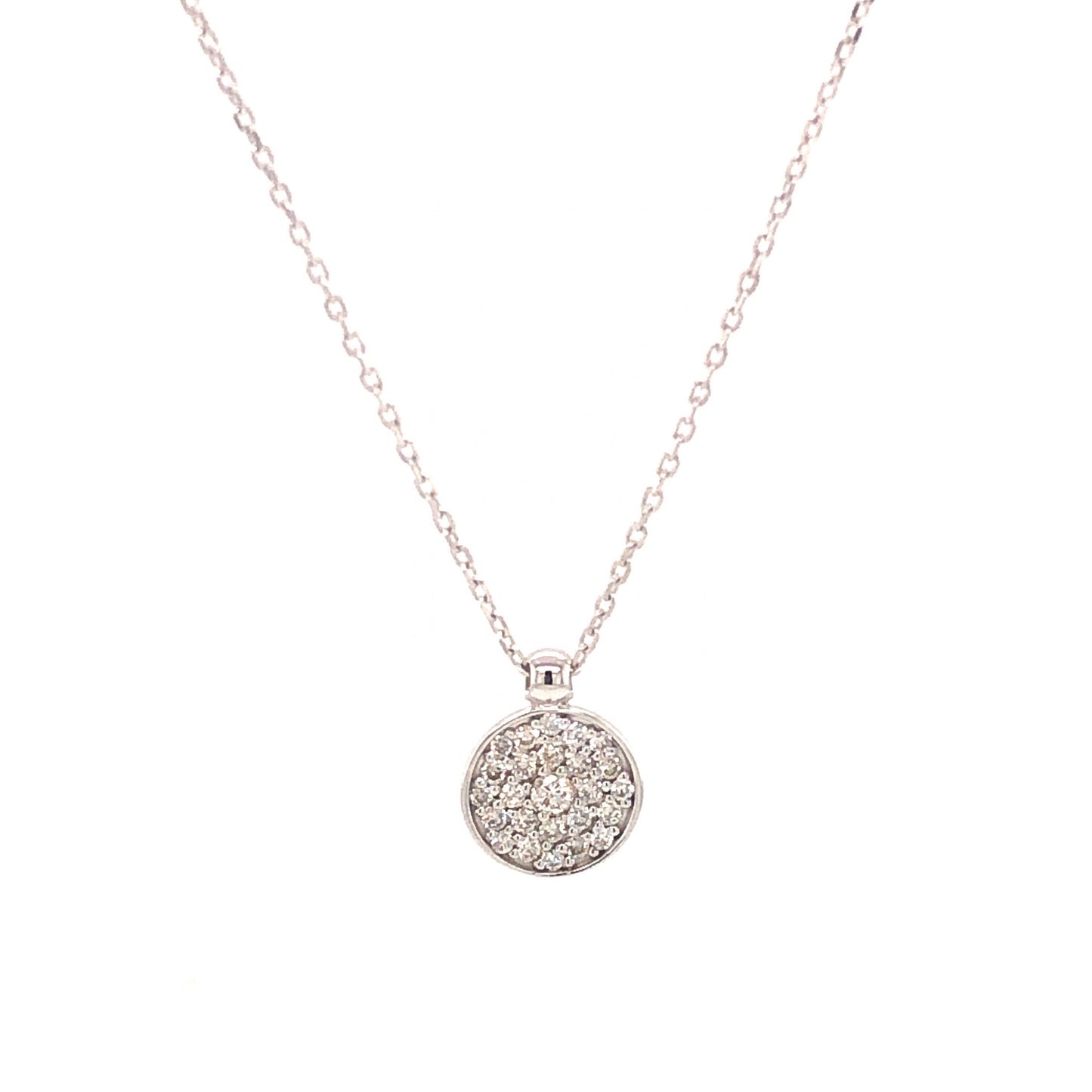 .25 Pave Diamond Pendant Necklace in 14k White Gold. This chic pendant necklace features .25 carats of Round Brilliant cut diamonds finished in shimmering 14 karat white gold. A .05 carat diamond is set in the middle of the pendant and accented by a pave of twenty-four (24) .0083 carat diamonds. Each diamond is Round Brilliant cut for collective brilliance. Each diamond is nearly colorless and eye clean. Paired with a classic 17” white gold chain, this necklace is a treasure fit for any special occasion!