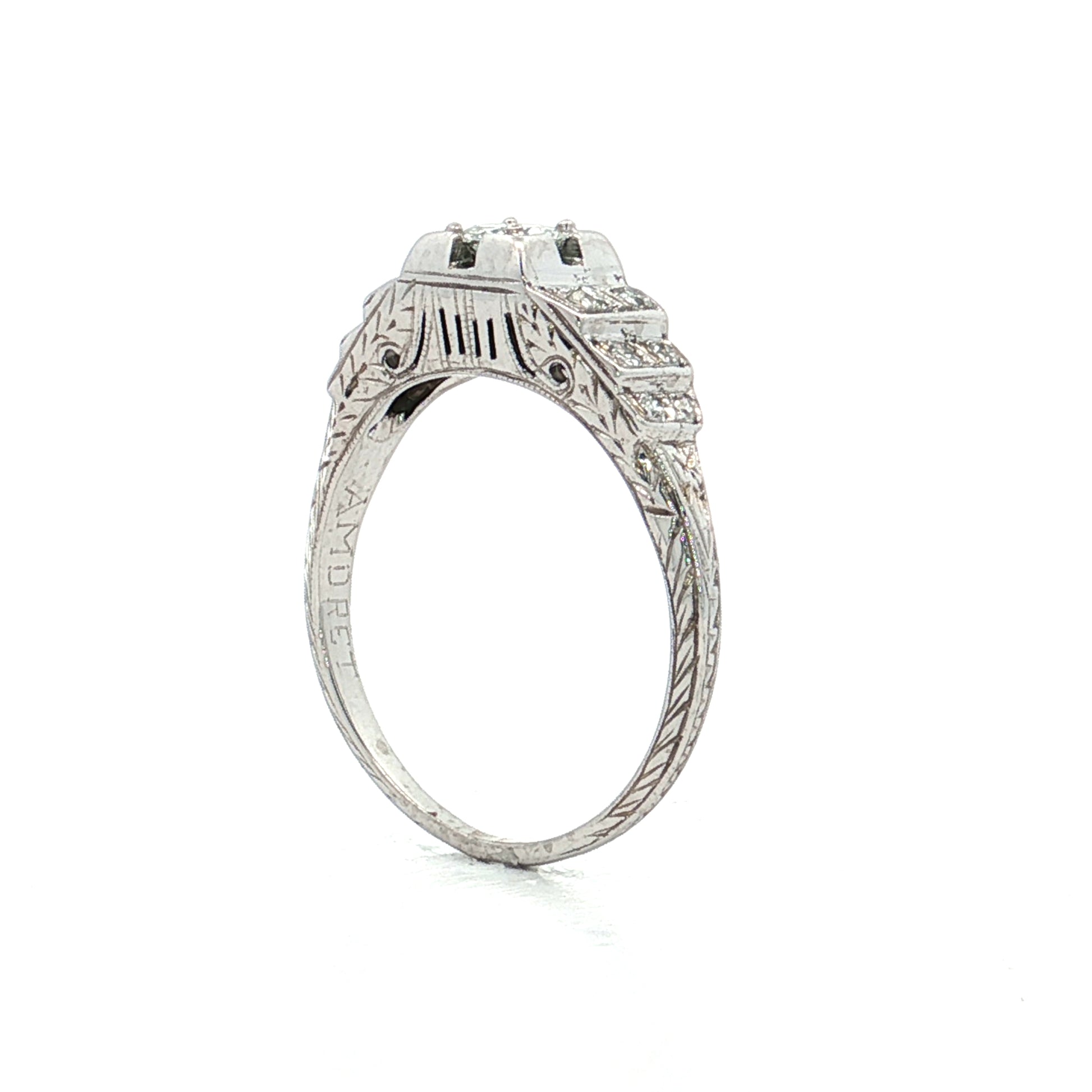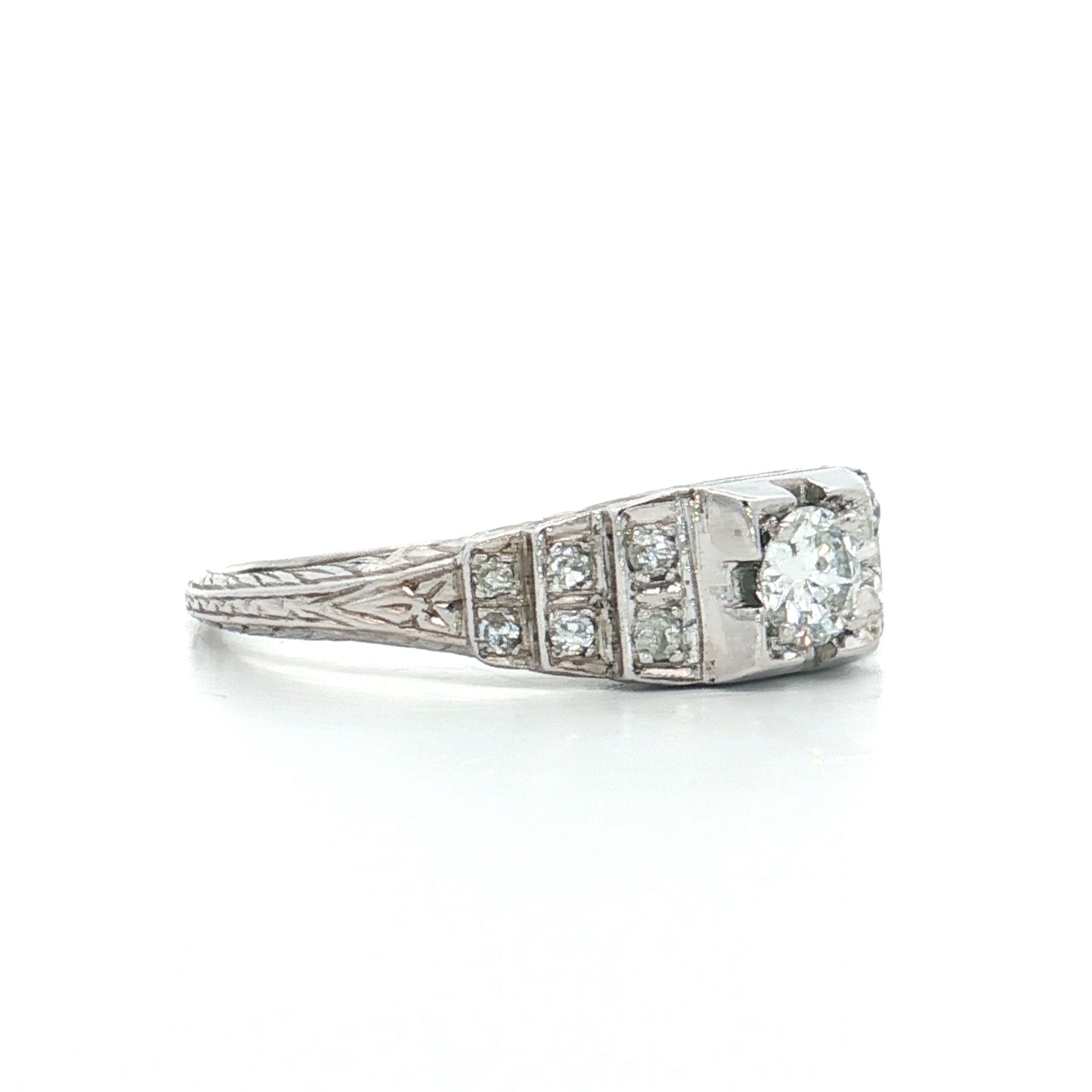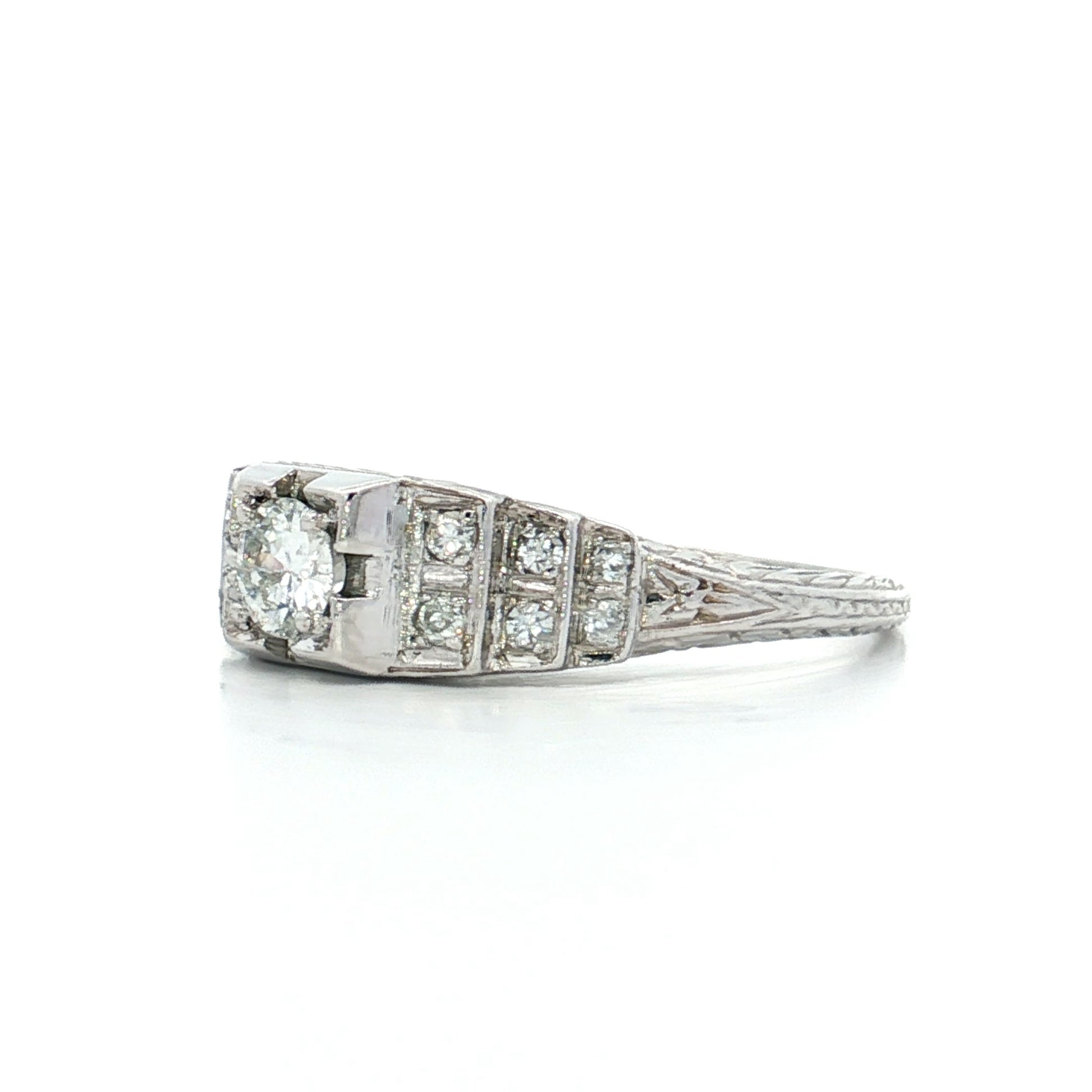 This Art Deco engagement ring features a .25 carat transitional cut center diamond with SI2 clarity and I color, set in 18 karat white gold. Twelve single cut accent diamonds, each weighing .015 carats for a total of .18 carats, are positioned around the band alongside engraved detailing. The total diamond weight reaches .43 carats in this antique design from the Art Deco era of the 1920s-1930s. The transitional cut represents the evolution between old European cuts and modern round brilliant cuts, popular during the early 20th century.