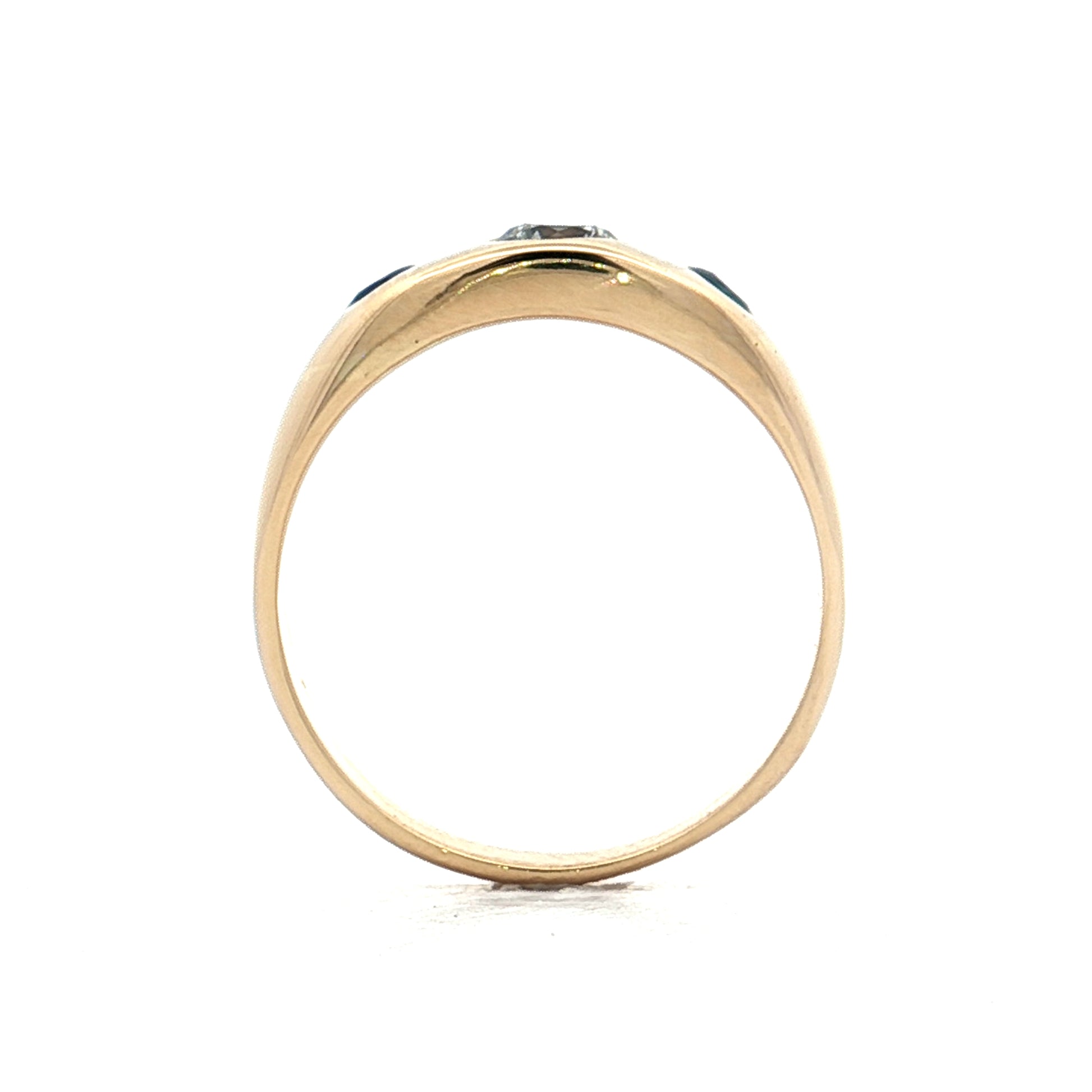 Transitional cuts bridge old European and modern round brilliants, offering a mix of vintage character with more sparkle than their predecessors. Two round cut blue sapphires totaling .12 carats flank the center diamond in a flush setting that sits even with the 14 karat yellow gold band.