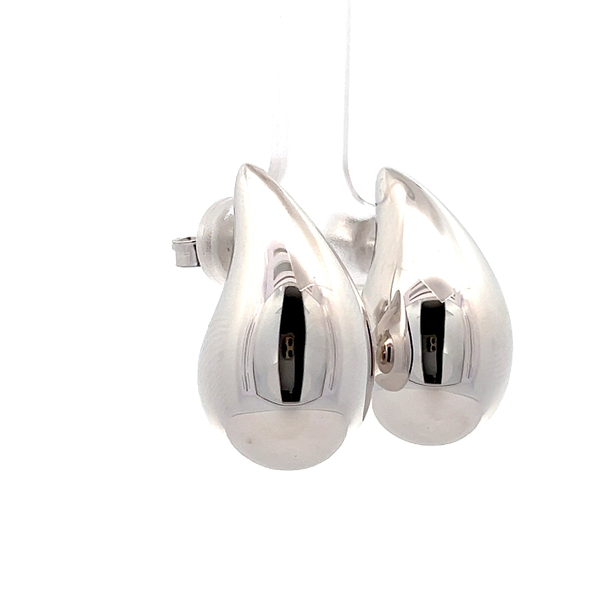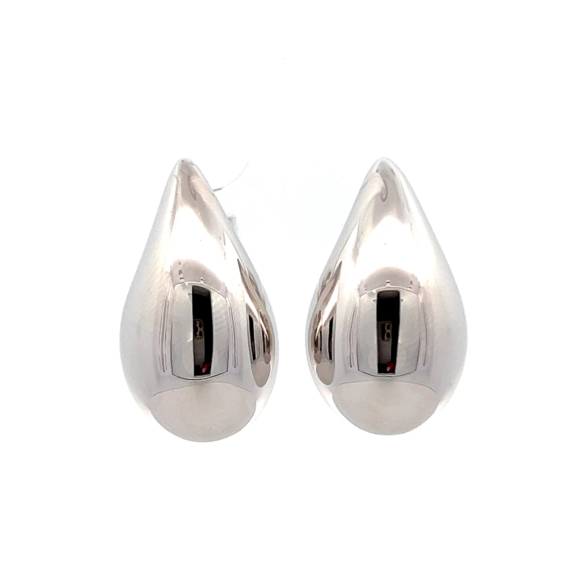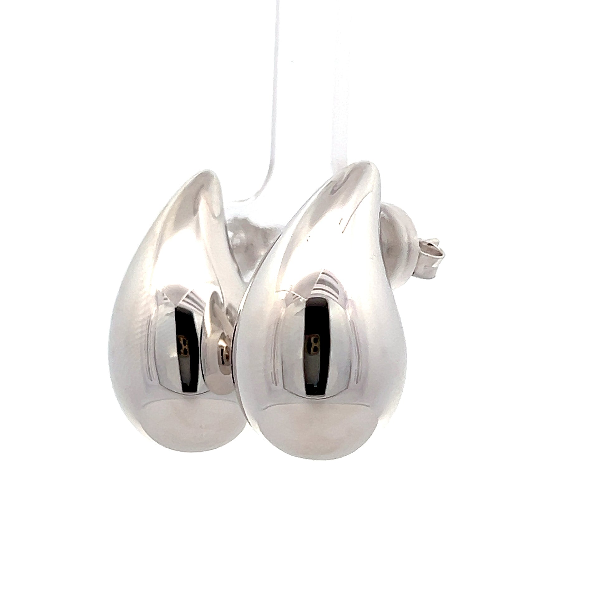 These stud earrings feature a puffy raindrop shape in 14 karat white gold, measuring 25mm in length with a hollow construction that keeps them lightweight despite their size. White gold has that bright finish, and at 25mm, these are substantial enough to make a statement without being heavy thanks to the hollow design. Post backs keep them secure, and the smooth, rounded shape means they work just as well with casual clothes as they do dressed up.