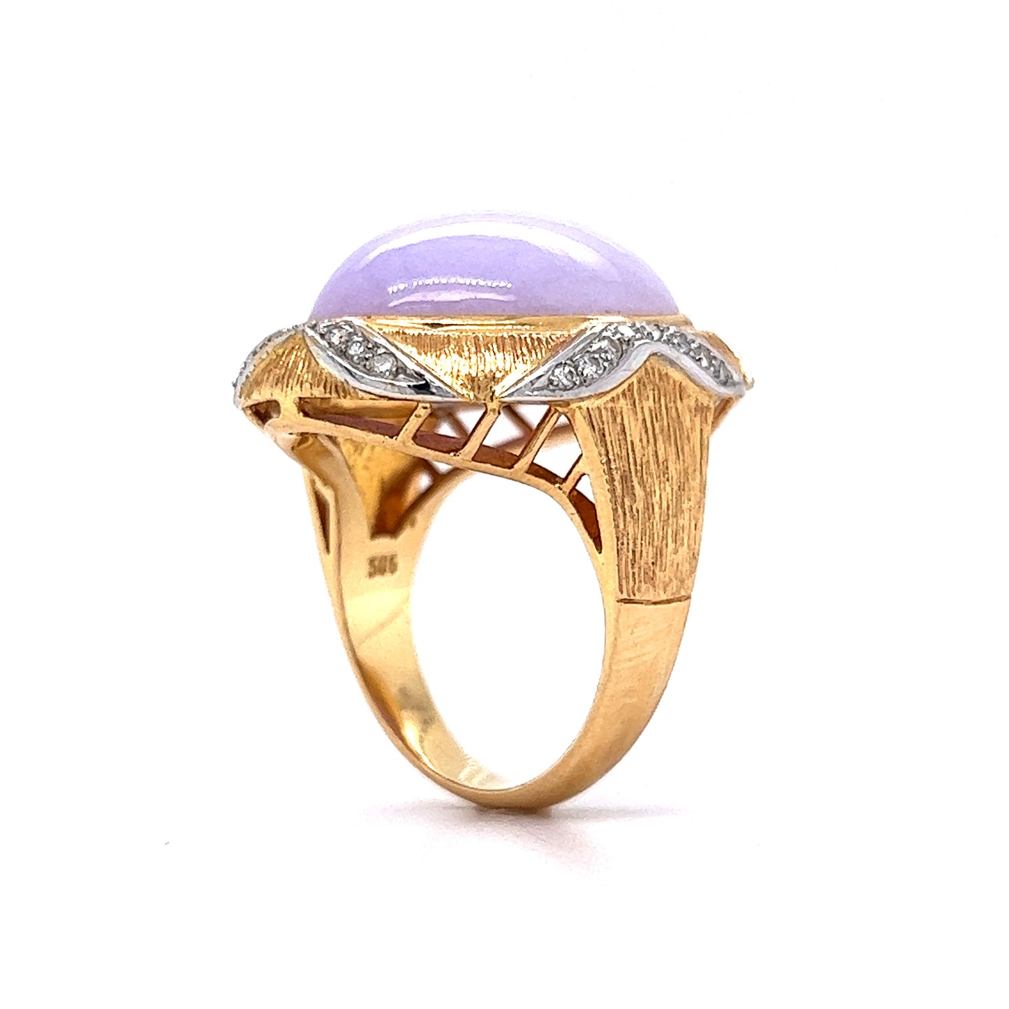This one-of-a-kind Mid-Century cocktail ring is an absolute must-have! Crafted in 14 karat yellow gold, this exquisite piece features a dazzling cabochon cut jadeite stone with a weight of 26.27 carats. The light lavender hue of the jadeite is beautifully complemented by a pave of thirty-two (32) round brilliant diamonds, each measuring 1.3mm and .01 carats. The decorative bezel setting of the jadeite and accent stones creates a modern, yet timeless look. This ring is perfect for any occasion and would make a great statement piece in any wardrobe!