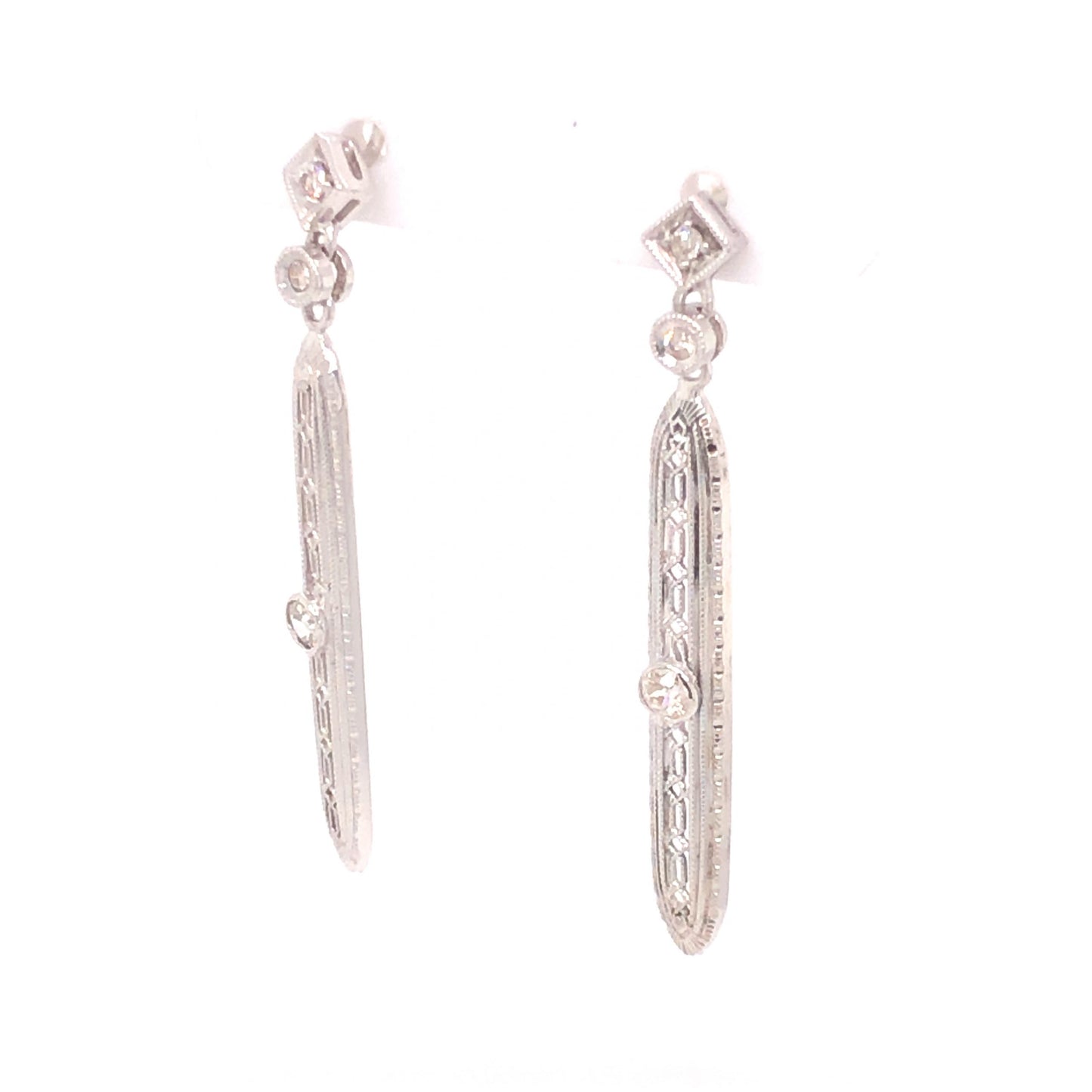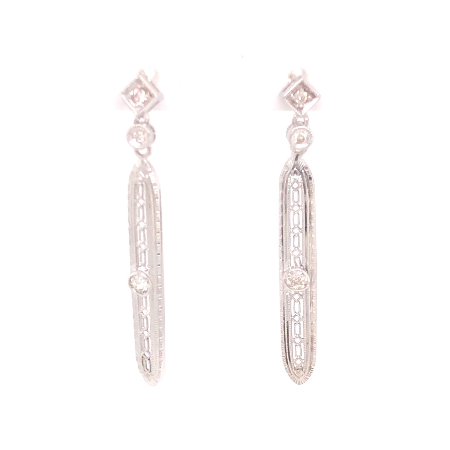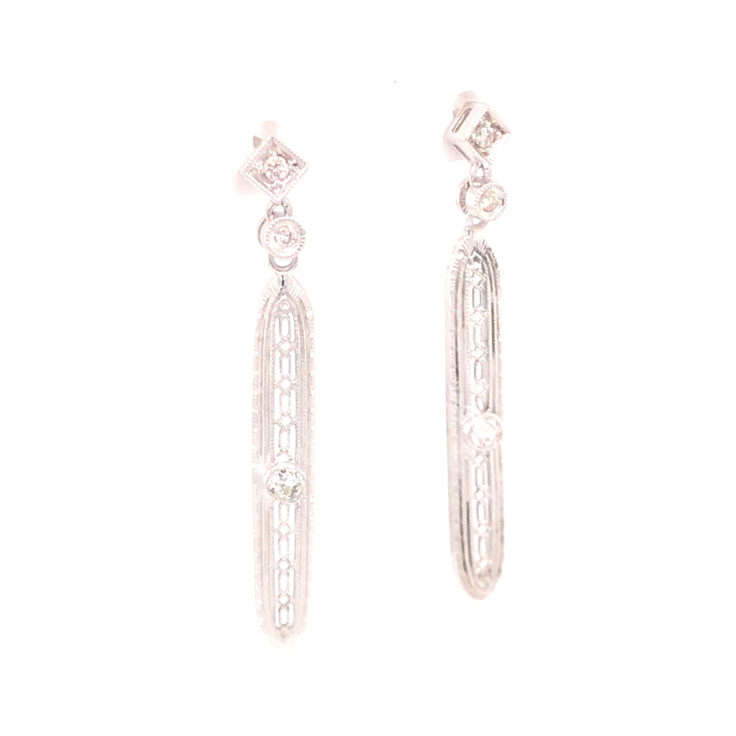 .26 Art Deco Diamond Earrings in 18k White Gold. These Art Deco drop earrings feature .26 carats of diamonds finished in 18 karat white gold. Two (2) .07 carat diamonds are mounted at the center of the dangles, surrounded by geometric metal work that is iconic for the Art Deco era. Located at the hinge of the dangle, two (2) .04 carat diamonds are bezel set and create a floating diamond effect. Accenting the very top of the earrings, mounted at the front of the stud backings in a square shaped frame, two (2) additional diamonds are set, each weighing .02 carats. These lightweight, artistic drop earrings are stunning and ready to be yours!