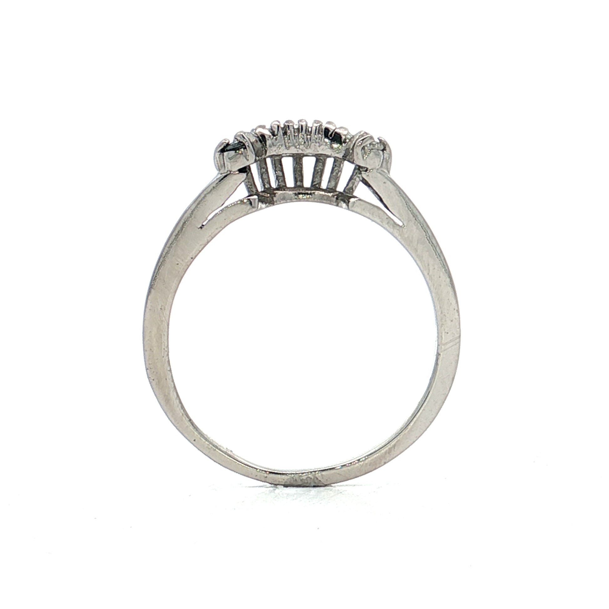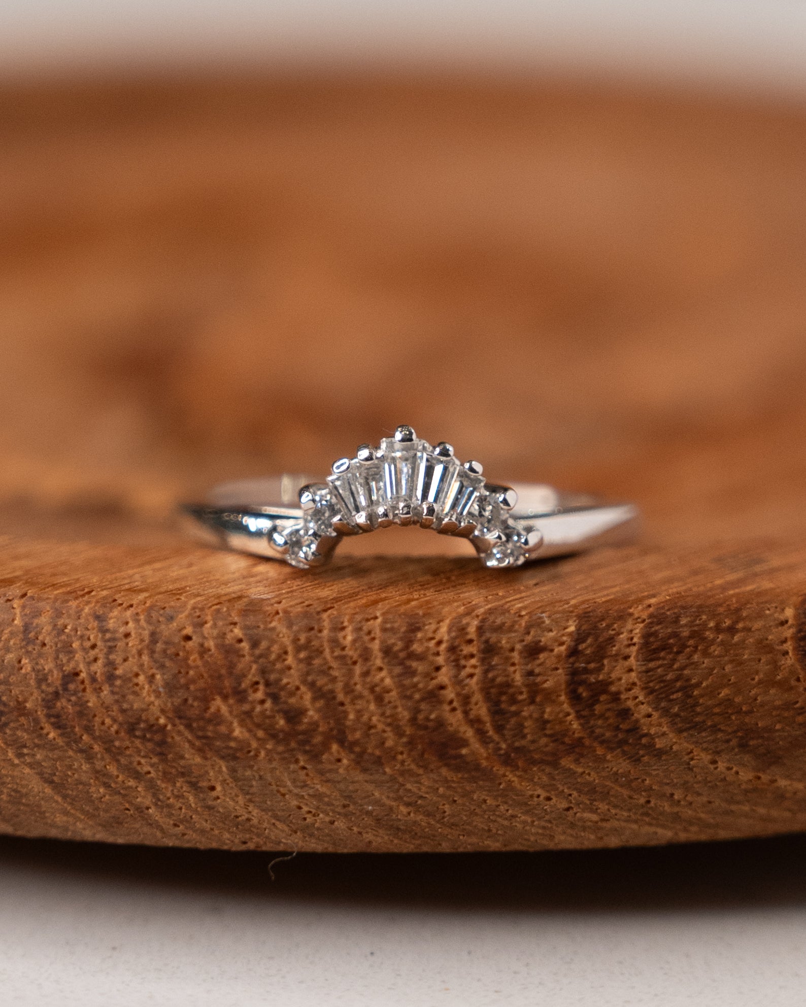 Each diamond measures 1.5mm and the stones are arranged in a curved profile that follows the shape of an engagement ring, allowing the two to nest together without gaps. This contour design means the band sits flush against a solitaire rather than leaving space between the rings. The platinum has a naturally white color that won't fade or need replating over time.