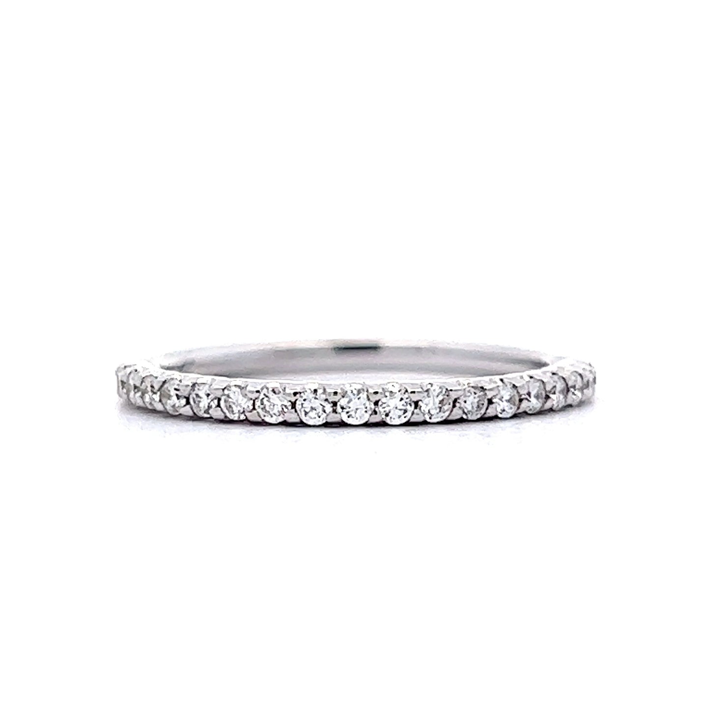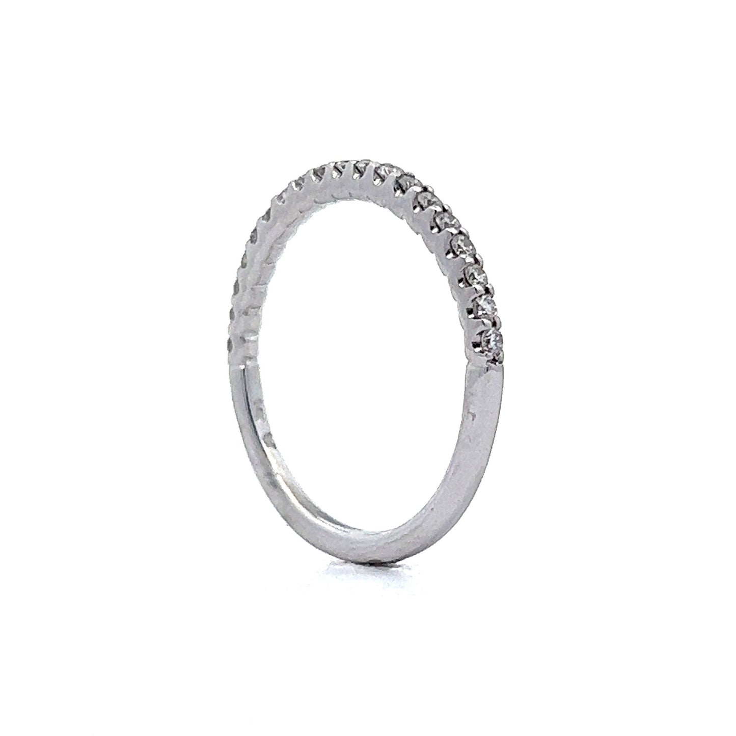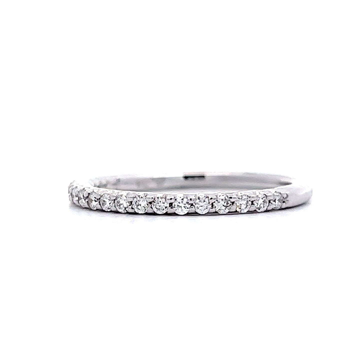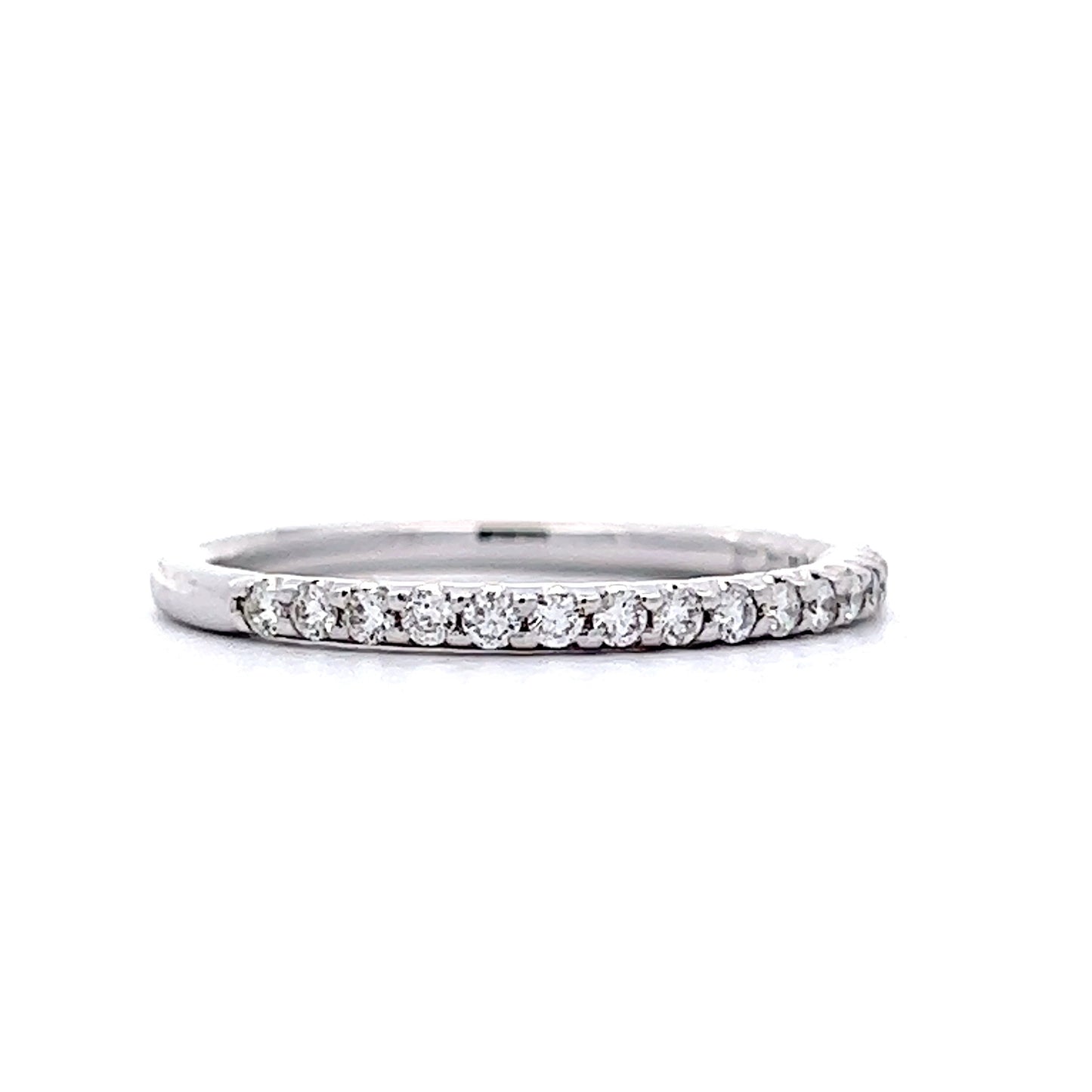 .26 Carat Diamond Wedding Band 14k White Gold. This modern diamond wedding band feature .26 carats of round brilliant cut diamonds set in 14 karat white gold. The diamonds are set across the top half of the band which has been given a bright polish. This would be a fabulous addition to a modern engagement ring.