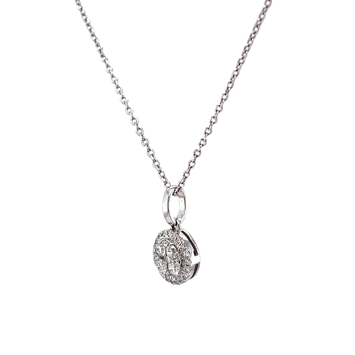 .26 Round Pave Diamond Pendant Necklace in 14k White Gold. This fine diamond pendant necklace features .26 carats of pave set diamonds finished in dazzling 14 karat white gold. Five (5) .015 carat diamonds punctuate the center of the pendant. Twenty-four (24) .0079 carat diamonds halo the larger stones and are set in the spaces between the larger diamonds, yielding the maximum amount of brilliance. Finished on a classic 14K white gold chain, this piece would pair well with some complementing diamond earrings.