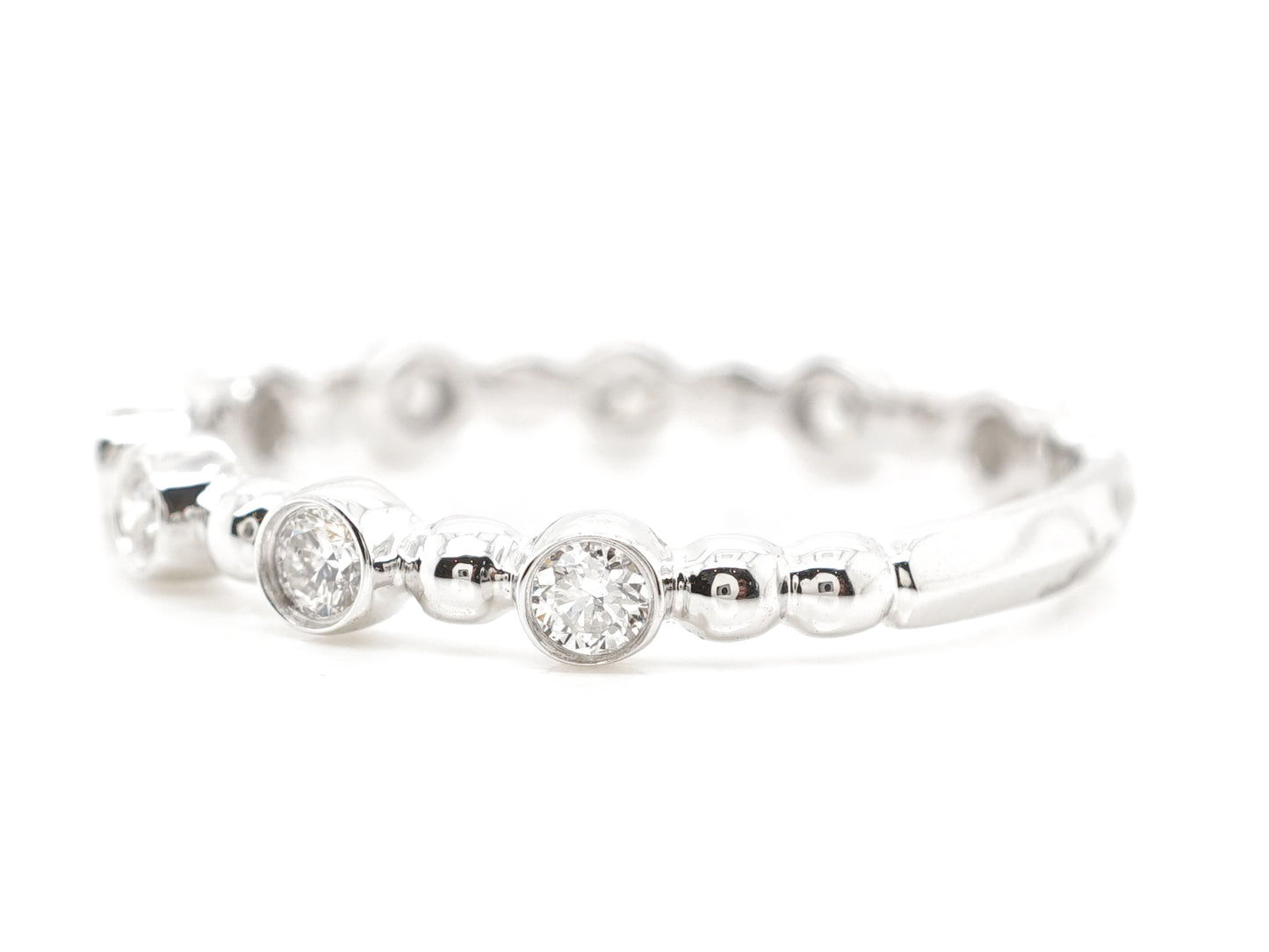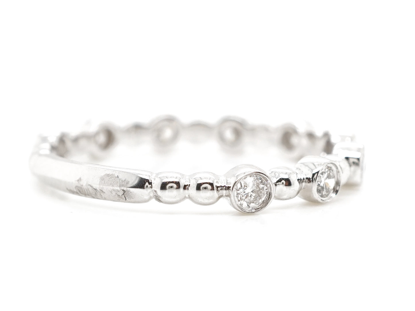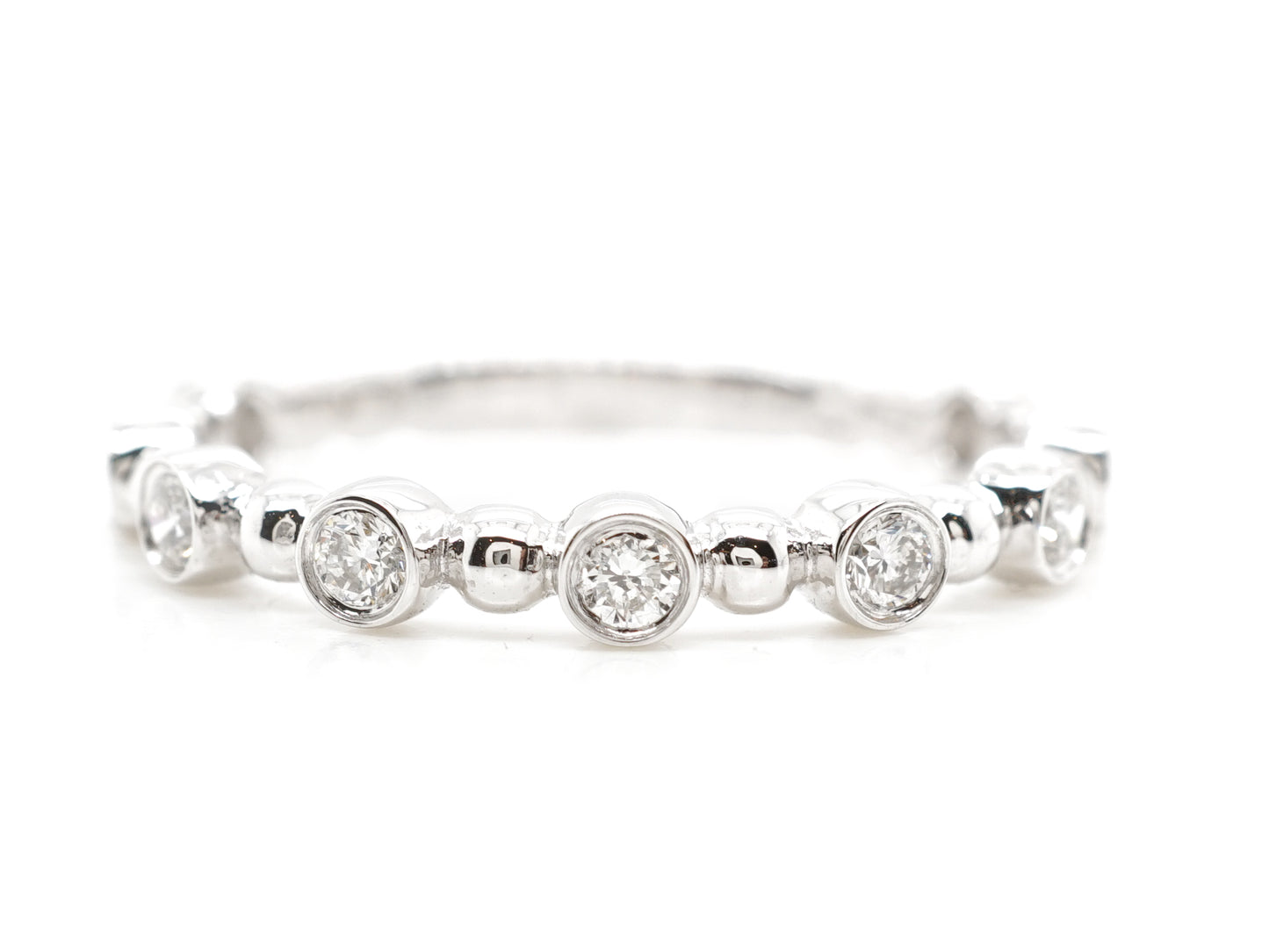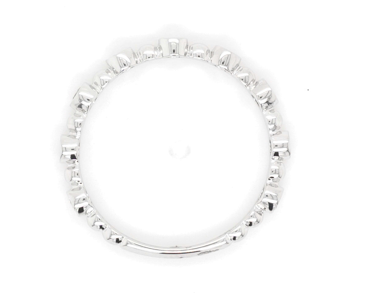 This modern wedding band features .27 carats of natural diamonds in 14k white gold. Nine .03 carat diamonds are bezel set and joined by a 14k white gold sphere creating a fabulous rounded design. From the secure setting style to the dazzling brilliance of each diamond, this 14k white gold wedding band meets both criteria of fashion and function!