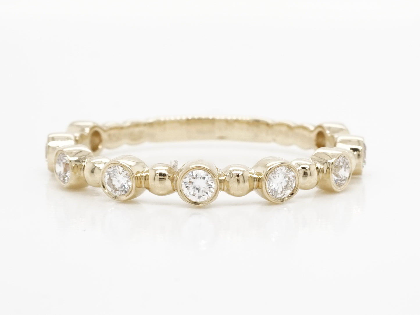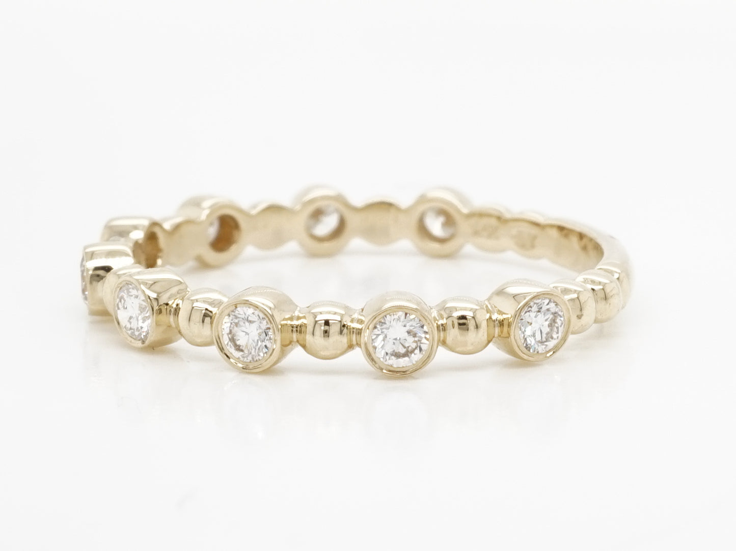 .27 Bezel Set Diamond Wedding Band in 14k Yellow Gold. This modern wedding band features .27 carats of natural diamonds in warm, 14k yellow gold. Nine .03 carat diamonds are bezel set and joined by 14k yellow gold spheres, creating a fabulous rounded design. From the secure setting style to the dazzling brilliance of each diamond, this 14k yellow gold wedding band meets both criteria of fashion and function!