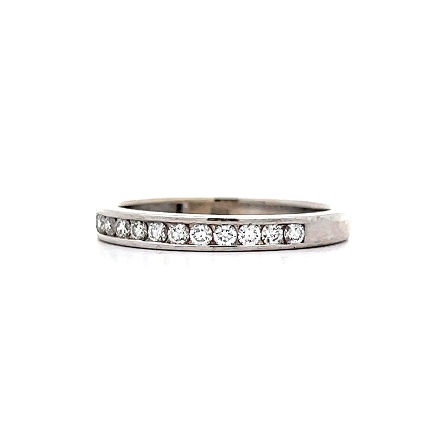This radiant half-eternity wedding band blends modern design with elegant details. Made from 18-karat white gold, it features a channel set of round brilliant cut diamonds totaling .27 carats. The diamonds, graded VS2 in clarity and G to H in color, create a bright and near-colorless sparkle.