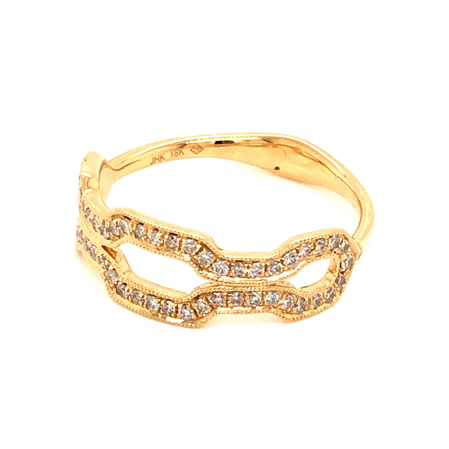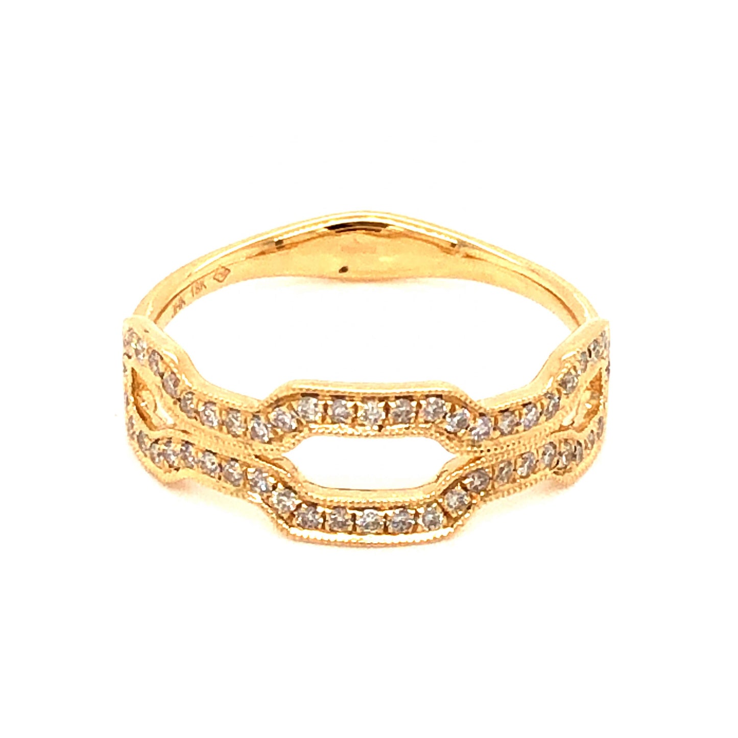 This sparkling stacking ring features .27 carats of diamonds finished in polished 18 karat yellow gold. Fifty-two (52) .0052 near colorless diamonds are set in shared prongs on a structured yellow gold mounting. Fine milgrain engravings decorate the trim of the front of the ring. The diamond mounting is finished on a sleek and polished 18 karat yellow gold band. This modern diamond band is the perfect everyday ring to brighten up your mood!