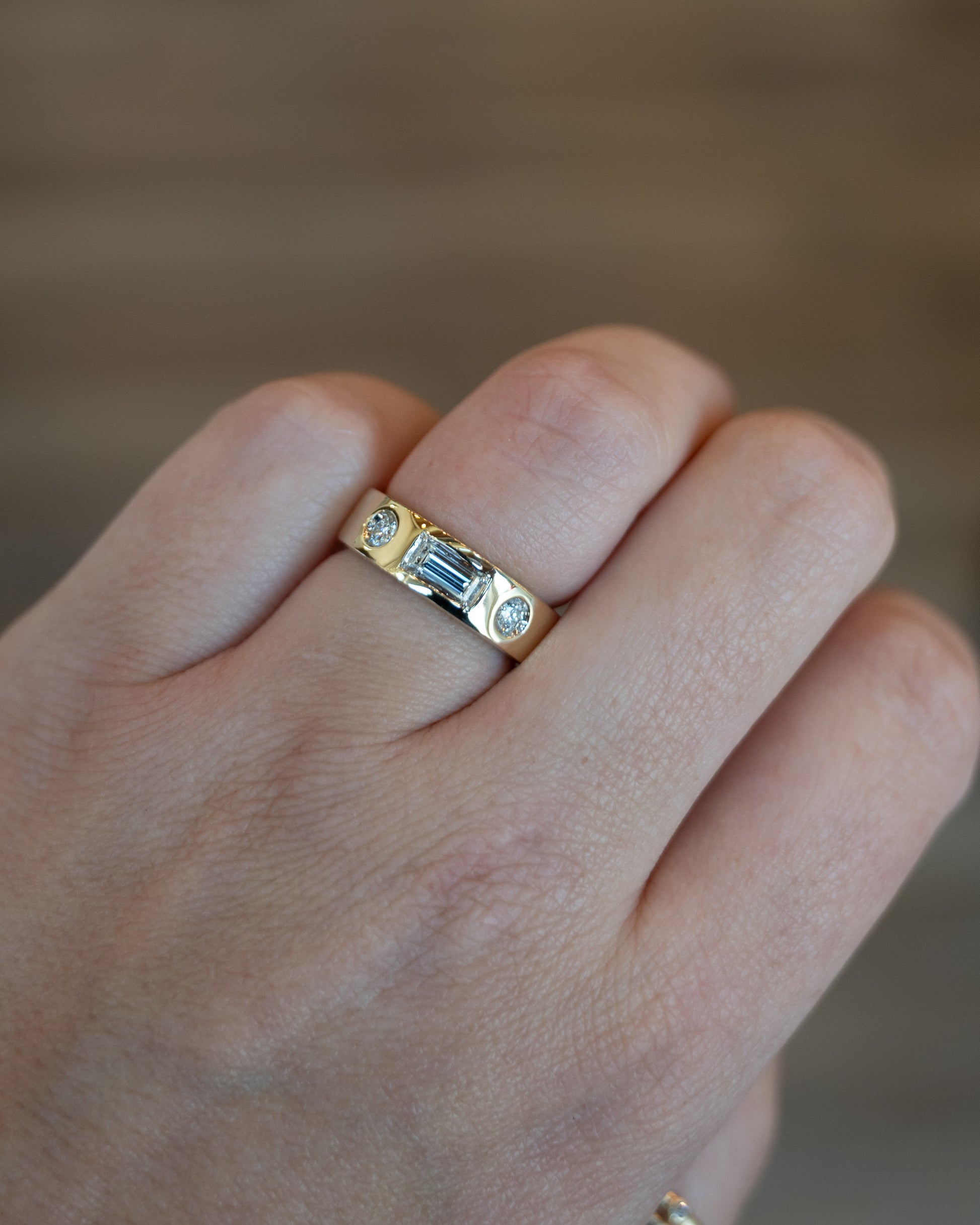 This stacking ring features a .27 carat baguette cut diamond set horizontally (east-west) across a 6mm wide band of 14 karat yellow gold, with two round brilliant diamonds weighing .085 carats each on either side for a total of .44 carats. The center baguette has VS2-SI1 clarity and H-I color, while its rectangular shape creates a different look from typical round center stones. Set sideways, the baguette stretches across the finger rather than up and down. The wide band makes this ring substantial enough to wear alone or stack it with others for a bolder look.